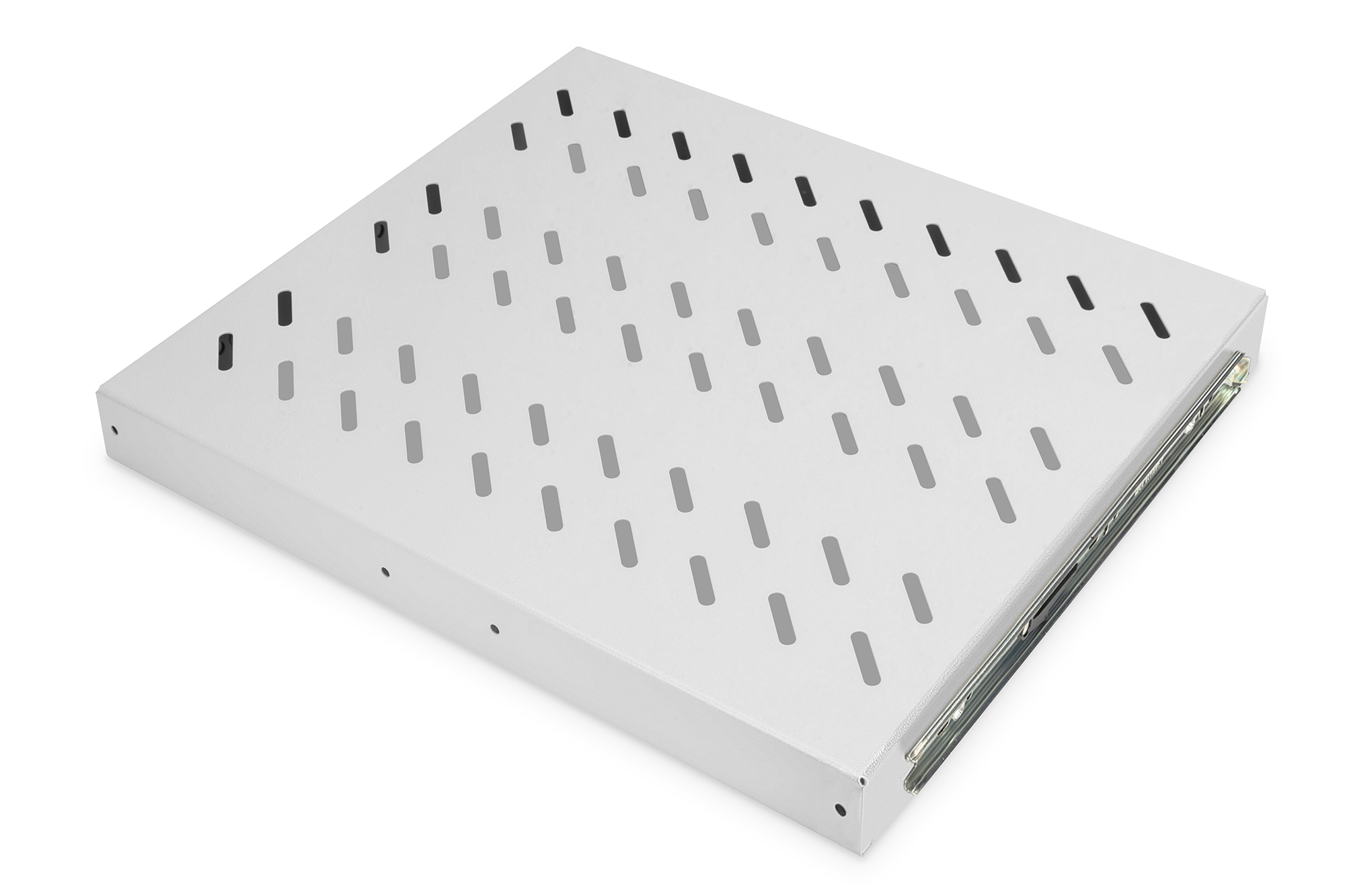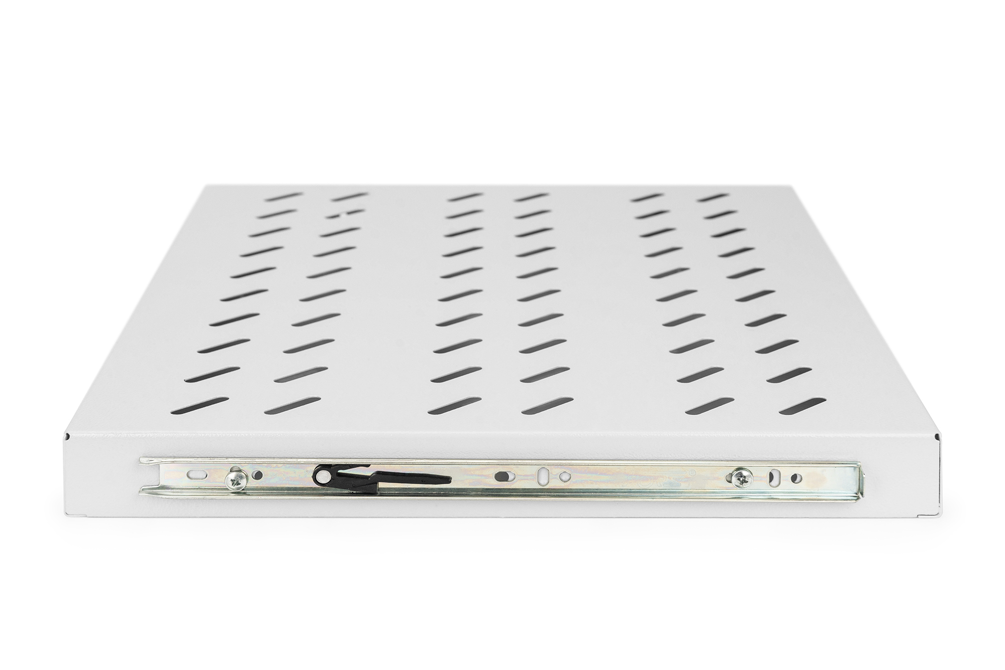 Die ausziehbaren Fachböden sind einfach an den vier 483 mm (19")-Profilschienen Ihrer 483 mm (19")-Schränke zu installieren. Durch das stabile, perforierte Lochblech mit einer hohen Traglast, sind sie die optimale Tragfläche für Ihre Komponenten. Ein beigelegter Griff kann montiert werden, um den Auszug zu vereinfachen. Die Fachböden sind erhältlich in den Farben Grau (RAL 7035) und Schwarz (RAL 9005).