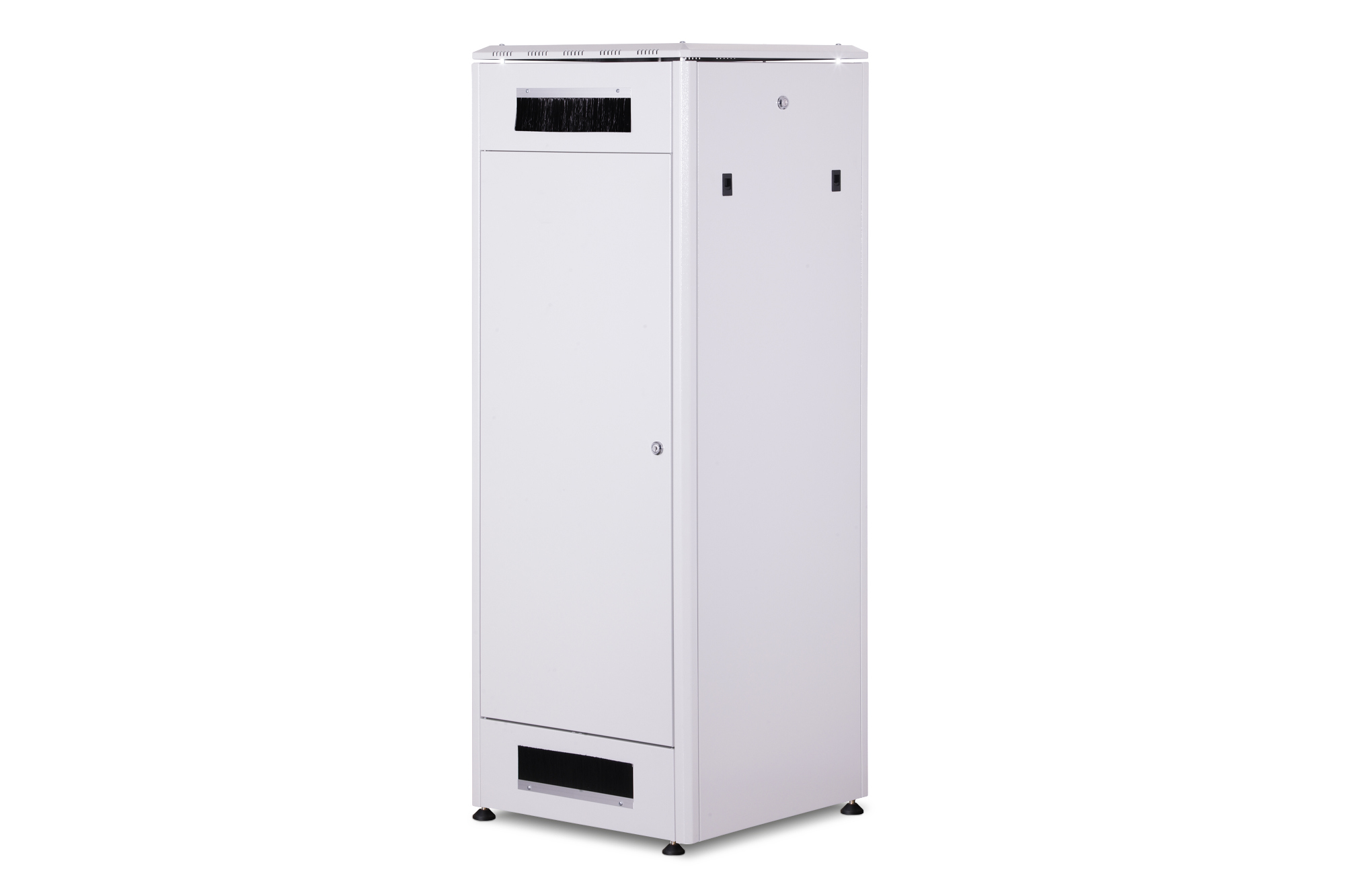 Die Netzwerkschränke der Unique Serie wurden für eine besonders komfortable und flexible Netzwerkverkabelung designt und produziert. Durchdachte Optimierungen bieten marktkonforme Stabilität bei maximaler Flexibilität. Ein modular, durch verschraubte 483 mm (19")-Blindplatten öffenbares Bodenchassis bietet ausreichend Platz für Kabel aller Art. Darüber hinaus befinden sich Kabeleinlässe mit Bürste im hinteren Bereich des Bodenchassis. Rückseitige Bürstenleisten ober- und unterhalb der Rücktür (ab 26HE), ermöglichen den Einsatz bei verschiedensten Anwendungsszenarien. Großzügige vertikale Kabelkanäle mit Kabelführungshilfen und Blende, verbaut in der Frontseite (ab 800 mm Schrankbreite), runden die vielfältigen Eigenschaften des Netzwerkschranks einwandfrei ab. Zwei Paar verkröpfte und galvanisch verzinkte, mit gegenläufig ablesbaren Höheneinheiten beschriftete 483 mm (19")-Profilschienen sind im Inneren verbaut. Sie lassen sich stufenlos verstellen und sind mit zusätzlichen Tiefenstreben im Schrank verbunden. Jeder Schrank ist eine robuste Stahlkonstruktion aus bis zu 1,5 mm starkem Stahlblech. Die Farbgebung erfolgt in Form von elektrostatischer Pulverbeschichtung in den Standardfarben Grau (RAL 7035) und Schwarz (RAL 9005). Modular abschließ- und abnehmbare Seitenwände sowie Türen verbessern die Zugänglichkeit. Ein Türanschlagswechsel kann vorgenommen werden. Des Weiteren sind die Schränke auf Grund der zerlegbaren Konstruktion bei Bedarf komplett demontierbar. Unter Berücksichtigung von Faktoren wie beispielsweise den Gewichten sowie der Wärmeentwicklung von Einbaukomponenten lassen sich, je nach Anwendungsfall, alle DIGITUS® Unique Netzwerkschränke auch als Serverschränke nutzen. Der Einbau von perforierten Stahlblechtüren sorgt bei solchen Varianten für eine verbesserte passive Kühlung der verbauten Komponenten. Ein von DIGITUS® als Serverschrank definiertes Modell wird beispielsweise in der Standardkonfiguration der Unique Server-N Serie zusätzlich um rückseitige PDU-Halterungen ergänzt.