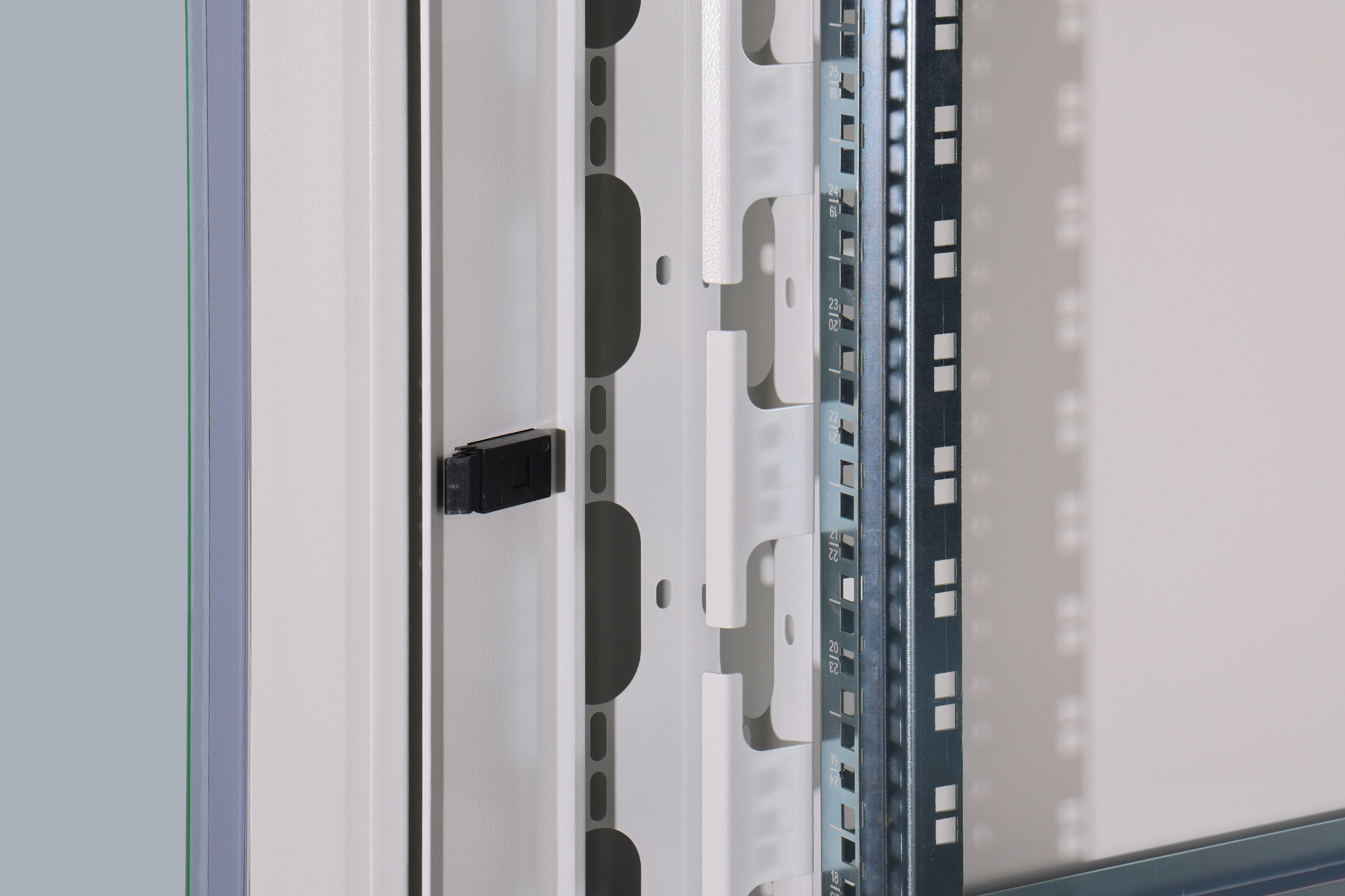 - Vertikale Kabelkanäle mit Kabelführungshilfen und Blende verbaut in der Frontseite