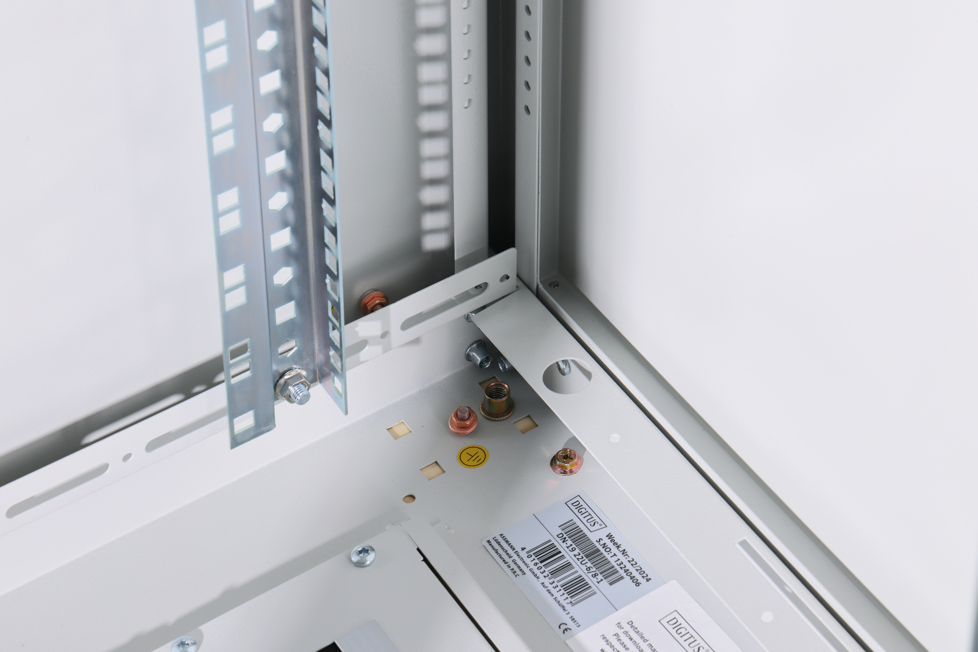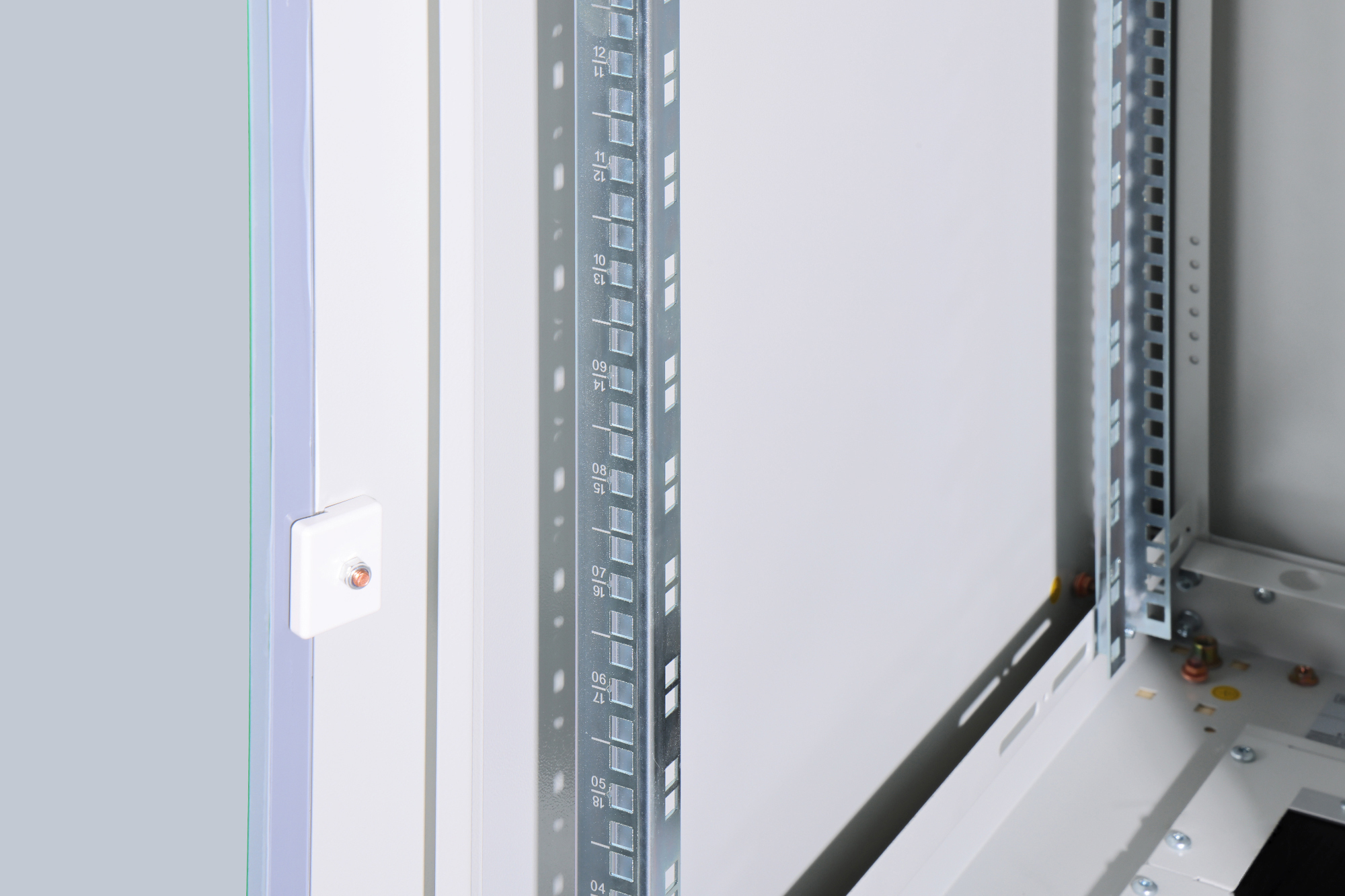 Die Netzwerkschränke der Unique Serie wurden für eine besonders komfortable und flexible Netzwerkverkabelung designt und produziert. Durchdachte Optimierungen bieten marktkonforme Stabilität bei maximaler Flexibilität. Ein modular, durch verschraubte 483 mm (19")-Blindplatten öffenbares Bodenchassis bietet ausreichend Platz für Kabel aller Art. Rückseitige Bürstenleisten ober- und unterhalb der Rücktür (ab 26HE), ermöglichen den Einsatz bei verschiedensten Anwendungsszenarien. Großzügige vertikale Kabelkanäle mit Kabelführungshilfen und Blende, verbaut in der Frontseite (ab 800 mm Schrankbreite), runden die vielfältigen Eigenschaften des Netzwerkschranks einwandfrei ab. Zwei Paar verkröpfte und galvanisch verzinkte, mit gegenläufig ablesbaren Höheneinheiten beschriftete 483 mm (19")-Profilschienen sind im Inneren verbaut. Sie lassen sich stufenlos verstellen und sind mit zusätzlichen Tiefenstreben im Schrank verbunden. Jeder Schrank ist eine robuste Stahlkonstruktion aus bis zu 1,5 mm starkem Stahlblech. Die Farbgebung erfolgt in Form von elektrostatischer Pulverbeschichtung in den Standardfarben Grau (RAL 7035) und Schwarz (RAL 9005). Modular abschließ- und abnehmbare Seitenwände sowie Türen verbessern die Zugänglichkeit. Ein Türanschlagswechsel kann vorgenommen werden. Des Weiteren sind die Schränke auf Grund der zerlegbaren Konstruktion bei Bedarf komplett demontierbar. Unter Berücksichtigung von Faktoren wie beispielsweise den Gewichten sowie der Wärmeentwicklung von Einbaukomponenten lassen sich, je nach Anwendungsfall, alle DIGITUS® Unique Netzwerkschränke auch als Serverschränke nutzen. Der Einbau von perforierten Stahlblechtüren sorgt bei solchen Varianten für eine verbesserte passive Kühlung der verbauten Komponenten. Ein von DIGITUS® als Serverschrank definiertes Modell wird beispielsweise in der Standardkonfiguration der Unique Server-N Serie zusätzlich um rückseitige PDU-Halterungen ergänzt.