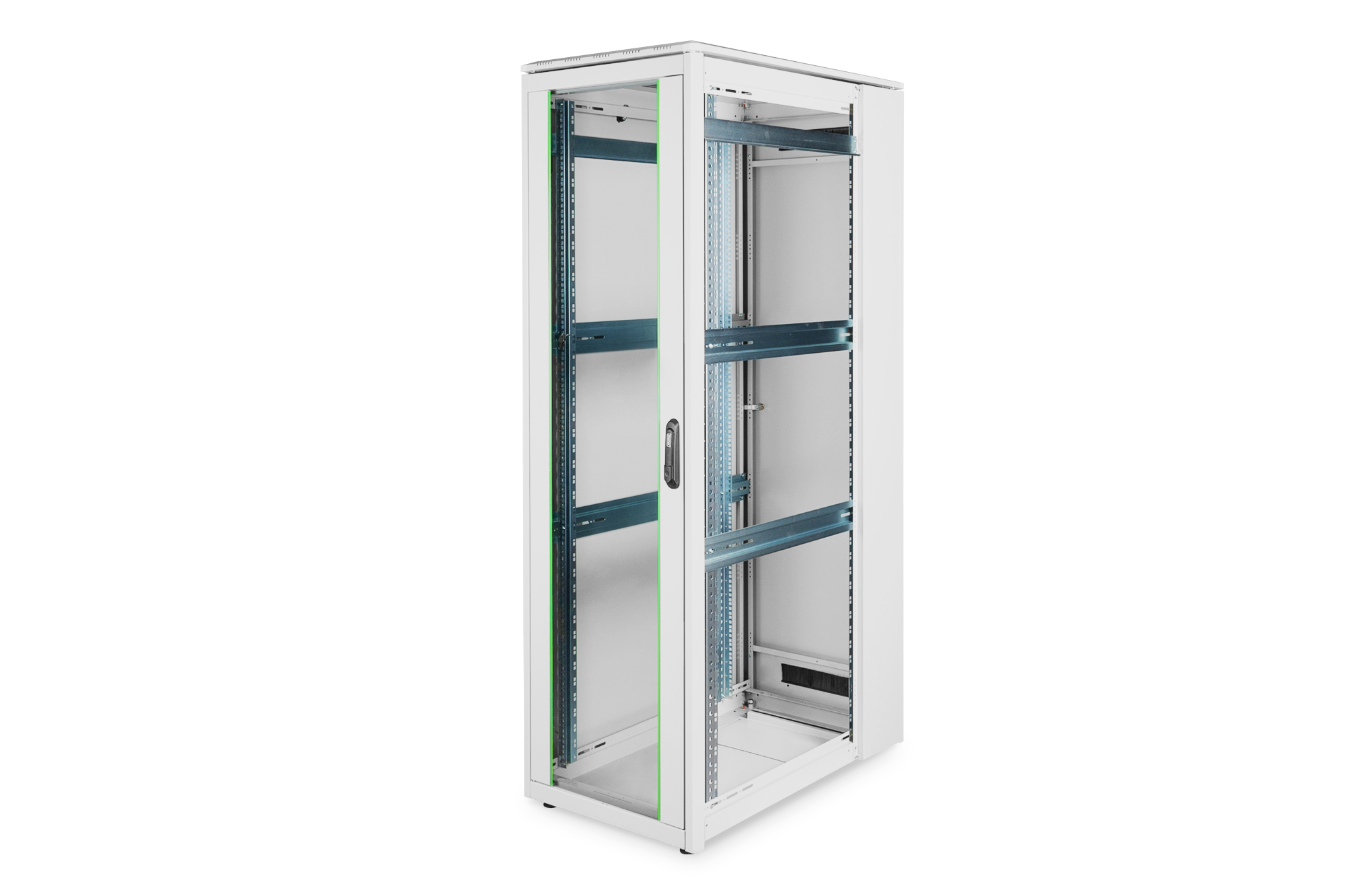 Die Netzwerkschränke der Unique Serie wurden für eine besonders komfortable und flexible Netzwerkverkabelung designt und produziert. Durchdachte Optimierungen bieten marktkonforme Stabilität bei maximaler Flexibilität. Ein modular, durch verschraubte 483 mm (19")-Blindplatten öffenbares Bodenchassis bietet ausreichend Platz für Kabel aller Art. Darüber hinaus befinden sich Kabeleinlässe mit Bürste im hinteren Bereich des Bodenchassis. Rückseitige Bürstenleisten ober- und unterhalb der Rücktür (ab 26HE), ermöglichen den Einsatz bei verschiedensten Anwendungsszenarien. Großzügige vertikale Kabelkanäle mit Kabelführungshilfen und Blende, verbaut in der Frontseite (ab 800 mm Schrankbreite), runden die vielfältigen Eigenschaften des Netzwerkschranks einwandfrei ab. Zwei Paar verkröpfte und galvanisch verzinkte, mit gegenläufig ablesbaren Höheneinheiten beschriftete 483 mm (19")-Profilschienen sind im Inneren verbaut. Sie lassen sich stufenlos verstellen und sind mit zusätzlichen Tiefenstreben im Schrank verbunden. Jeder Schrank ist eine robuste Stahlkonstruktion aus bis zu 1,5 mm starkem Stahlblech. Die Farbgebung erfolgt in Form von elektrostatischer Pulverbeschichtung in den Standardfarben Grau (RAL 7035) und Schwarz (RAL 9005). Modular abschließ- und abnehmbare Seitenwände sowie Türen verbessern die Zugänglichkeit. Ein Türanschlagswechsel kann vorgenommen werden. Des Weiteren sind die Schränke auf Grund der zerlegbaren Konstruktion bei Bedarf komplett demontierbar. Unter Berücksichtigung von Faktoren wie beispielsweise den Gewichten sowie der Wärmeentwicklung von Einbaukomponenten lassen sich, je nach Anwendungsfall, alle DIGITUS® Unique Netzwerkschränke auch als Serverschränke nutzen. Der Einbau von perforierten Stahlblechtüren sorgt bei solchen Varianten für eine verbesserte passive Kühlung der verbauten Komponenten. Ein von DIGITUS® als Serverschrank definiertes Modell wird beispielsweise in der Standardkonfiguration der Unique Server-N Serie zusätzlich um rückseitige PDU-Halterungen ergänzt.
