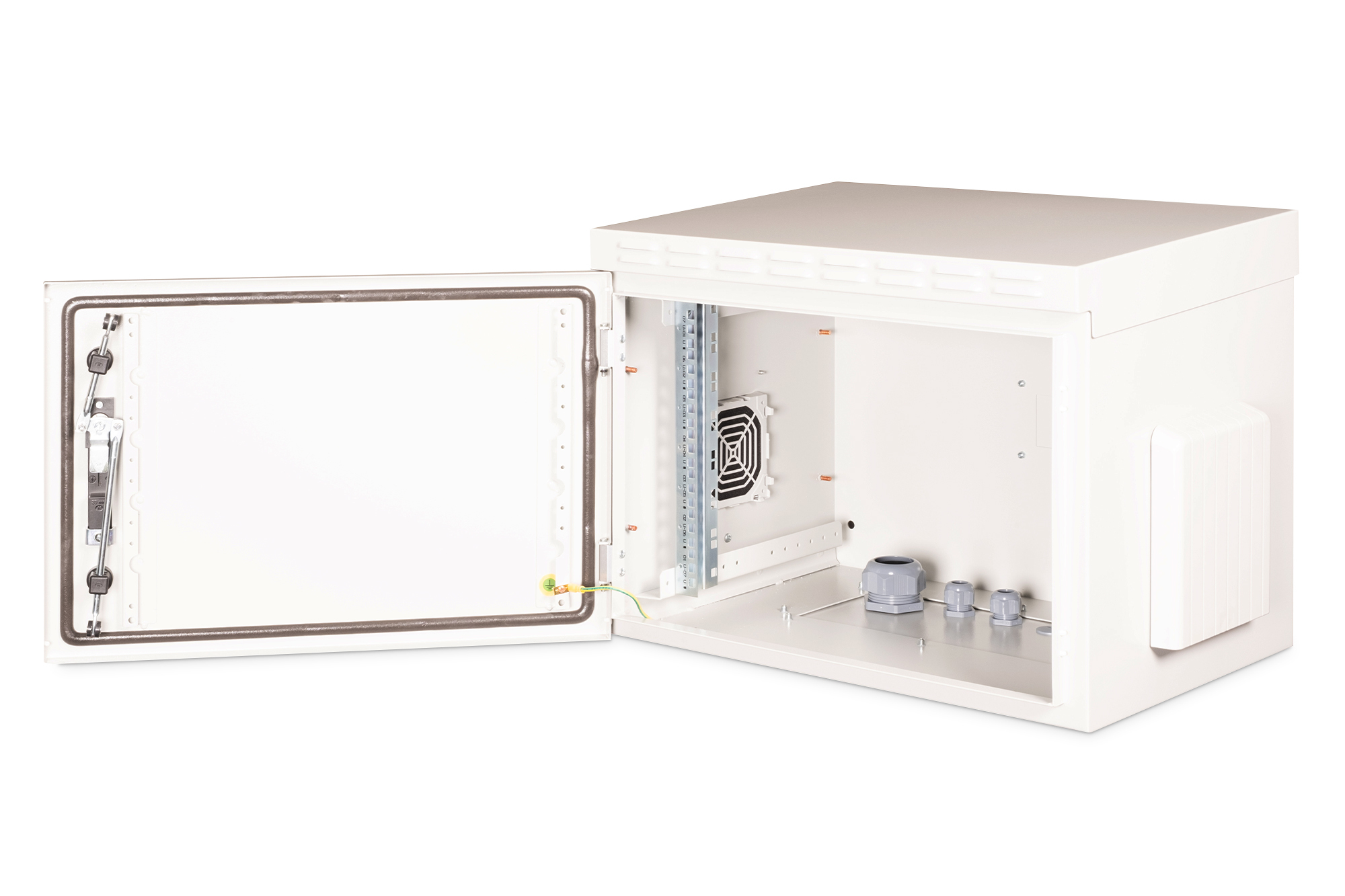 Die Industrie-Netzwerkschränke zur Wandmontage sind gemäß Schutzart IP55 speziell an die Bedürfnisse von rauen Umgebungen, besonders im Außenbereich, angepasst. Beste Leistung bieten die Wandgehäuse unter anderem durch das 3-Punkt-Verriegelungssystem mit abschließbarem Schwenkgriff und isolierten PG-Kabelverschraubungen. Integrierte Lüftungsfiltergehäuse sorgen für Frischlufteinlass (Schutz vor Wasser- und Staubeindringung gem. IP54). Anwendungsgebiete sind bspw. Außenbereiche, die den Umwelteffekten ausgesetzt sind (Regen, Staub, Hagel, Schnee, Spritzwasser). Für die Aufnahme eines Lüftermoduls wird das Dachchassis ebenfalls mit einem gefilterten Bereich versehen. Ein Paar galvanisierte, mit in beide Richtungen ablesbare Höheneinheiten beschriftete 483 mm (19")-Profilschienen sind im Inneren verbaut. Diese lassen sich in der Tiefe verstellen. Jeder Schrank ist eine robuste Stahlkonstruktion aus bis zu 2,0 mm starkem Stahlblech. Die Farbgebung erfolgt in Form von elektrostatischer Pulverbeschichtung in der Standardfarbe Grau (RAL 7035). Die Wandmontage erfolgt mittels beigelegter Haltewinkel. Optional lassen sich die Schränke mit einem Sockel als freistehende Lösung verwenden oder mittels Befestigungsset an Masten befestigen.