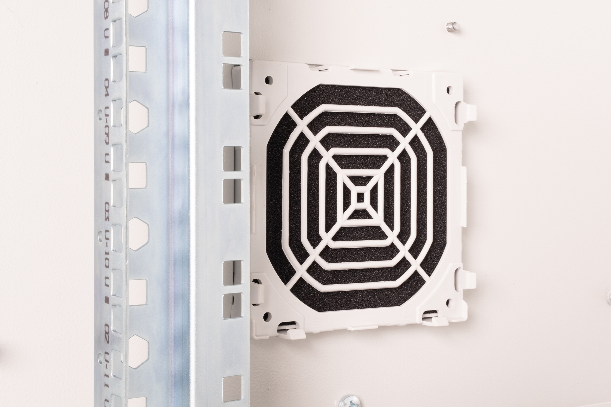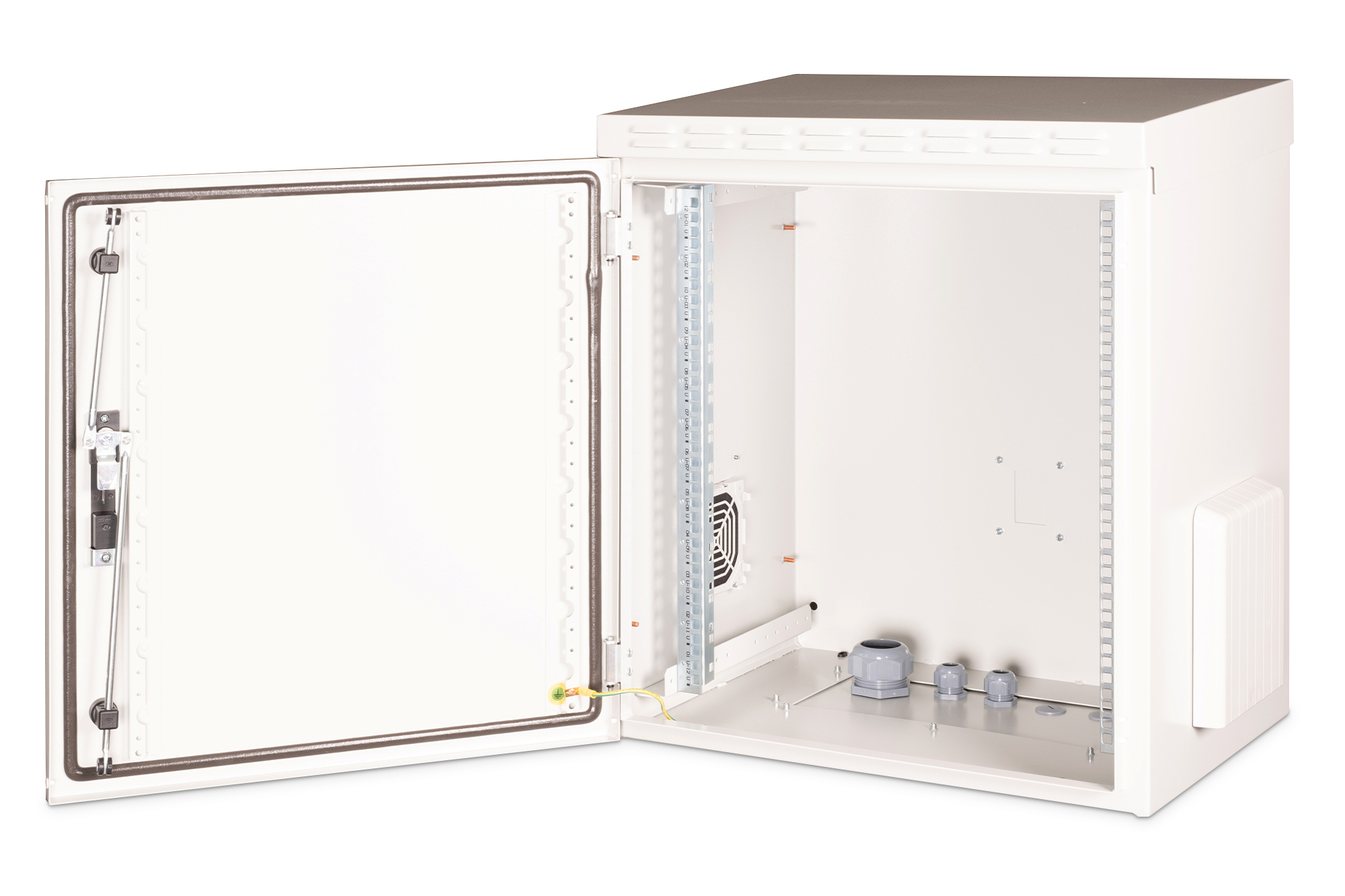 Die Industrie-Netzwerkschränke zur Wandmontage sind gemäß Schutzart IP55 speziell an die Bedürfnisse von rauen Umgebungen, besonders im Außenbereich, angepasst. Beste Leistung bieten die Wandgehäuse unter anderem durch das 3-Punkt-Verriegelungssystem mit abschließbarem Schwenkgriff und isolierten PG-Kabelverschraubungen. Integrierte Lüftungsfiltergehäuse sorgen für Frischlufteinlass (Schutz vor Wasser- und Staubeindringung gem. IP54). Anwendungsgebiete sind bspw. Außenbereiche, die den Umwelteffekten ausgesetzt sind (Regen, Staub, Hagel, Schnee, Spritzwasser). Für die Aufnahme eines Lüftermoduls wird das Dachchassis ebenfalls mit einem gefilterten Bereich versehen. Ein Paar galvanisierte, mit in beide Richtungen ablesbare Höheneinheiten beschriftete 483 mm (19")-Profilschienen sind im Inneren verbaut. Diese lassen sich in der Tiefe verstellen. Jeder Schrank ist eine robuste Stahlkonstruktion aus bis zu 2,0 mm starkem Stahlblech. Die Farbgebung erfolgt in Form von elektrostatischer Pulverbeschichtung in der Standardfarbe Grau (RAL 7035). Die Wandmontage erfolgt mittels beigelegter Haltewinkel. Optional lassen sich die Schränke mit einem Sockel als freistehende Lösung verwenden oder mittels Befestigungsset an Masten befestigen.