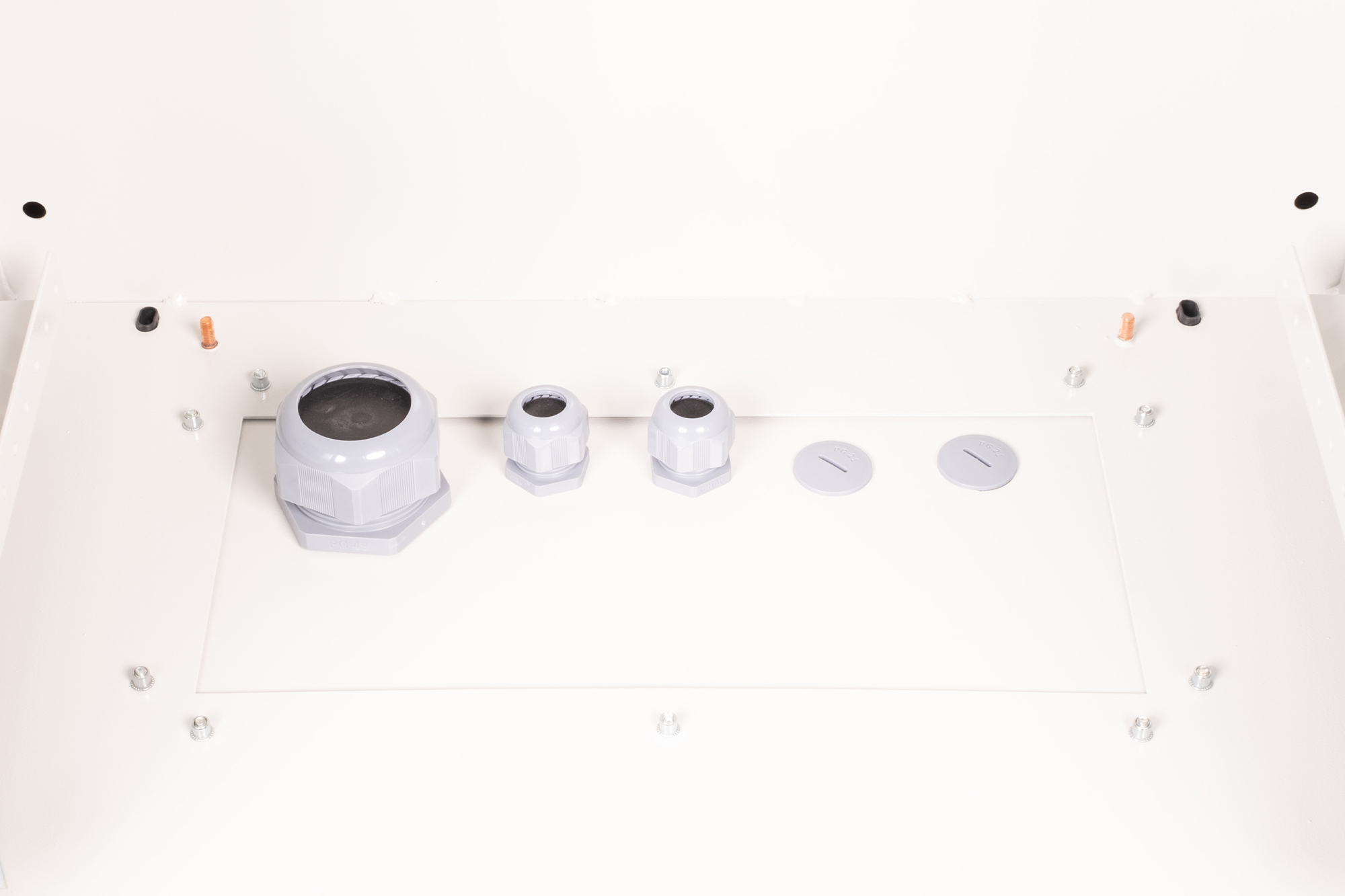 Kabeleingänge: 2x PG21, 1x PG48, 2x PVC Blindkappe (mit 28 mm Durchmesser)