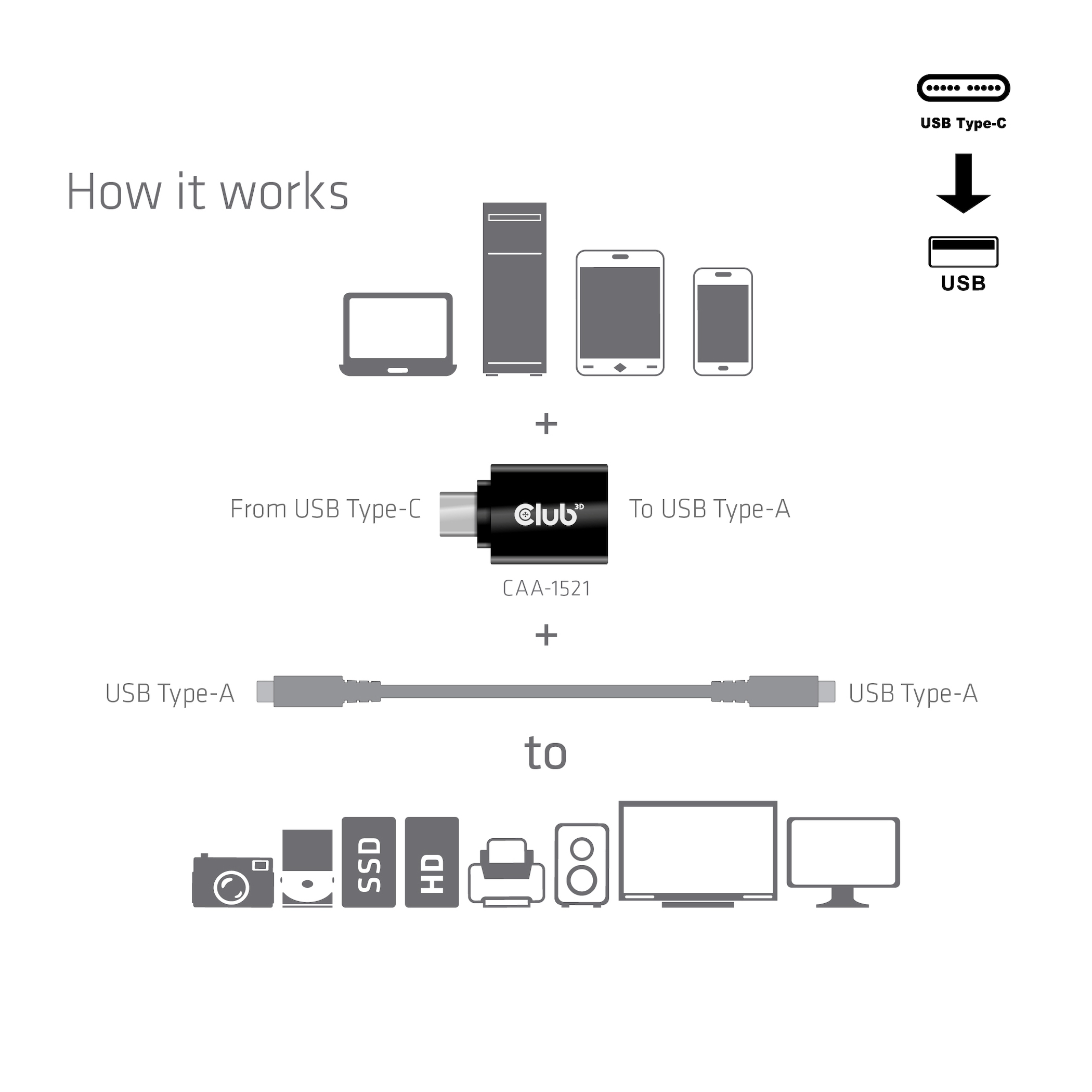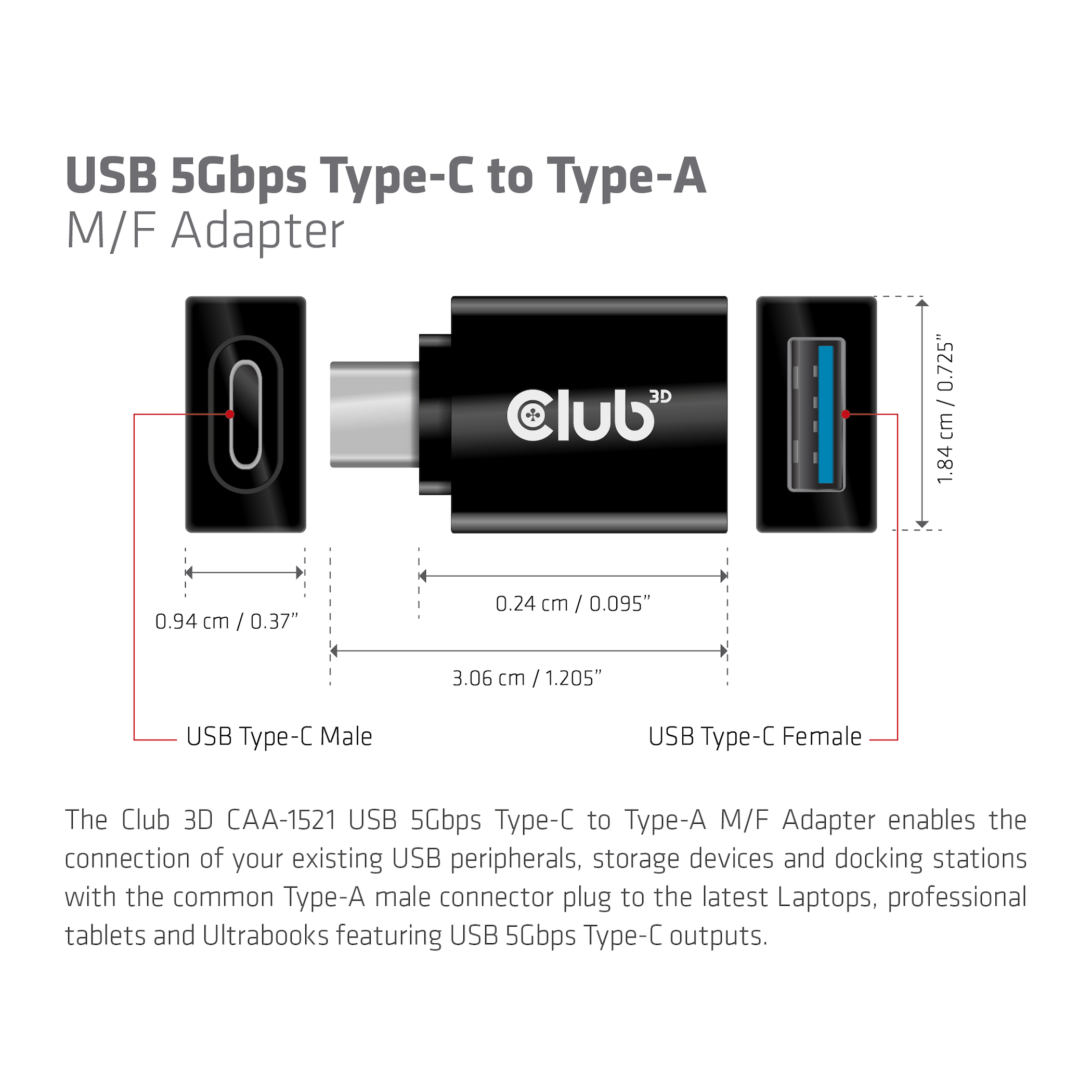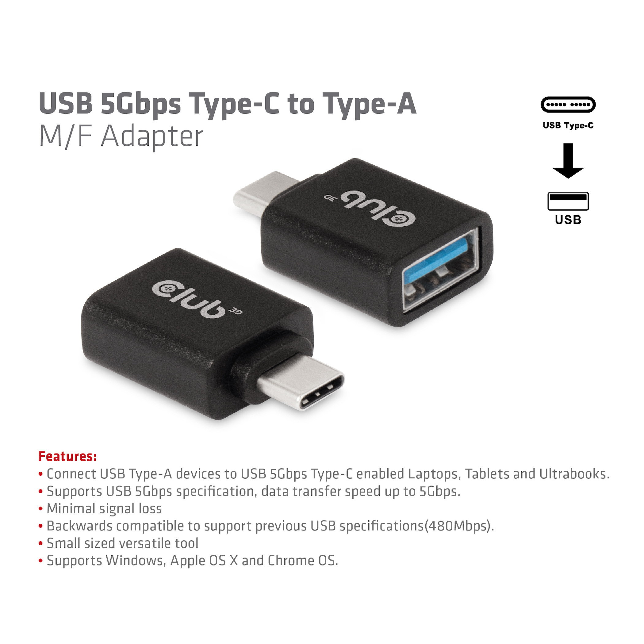 The Club 3D USB 3.1 Type C to USB 3.0 Type A Adapter enables the connection of your existing USB peripherals, storage devices and docking stations with the common Type A male connector plug to the latest Laptops, professional tablets and Ultrabooks featuring USB 3.1 Type C outputs.