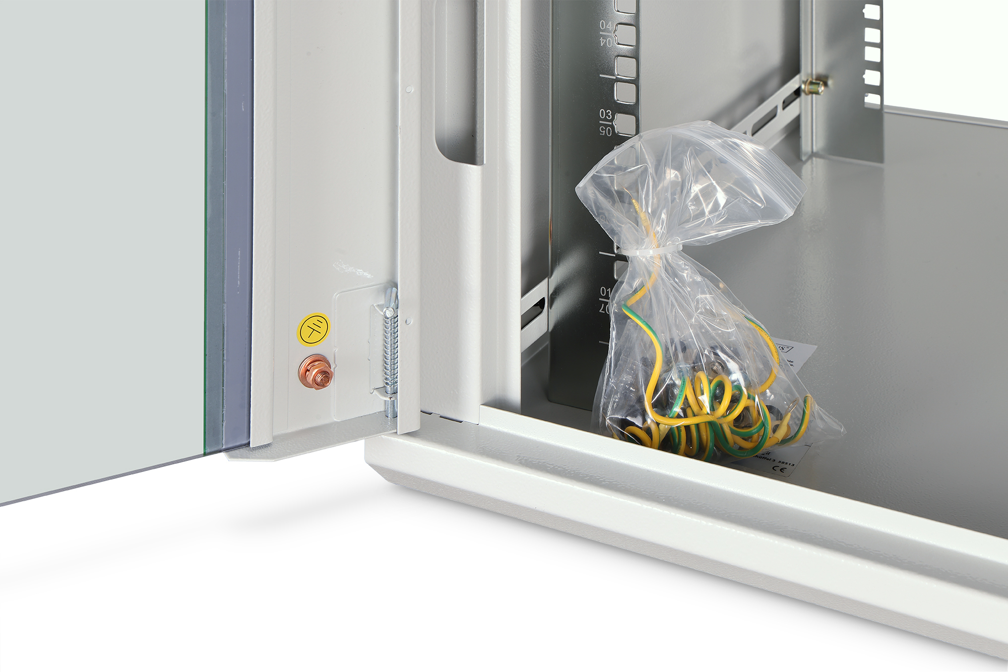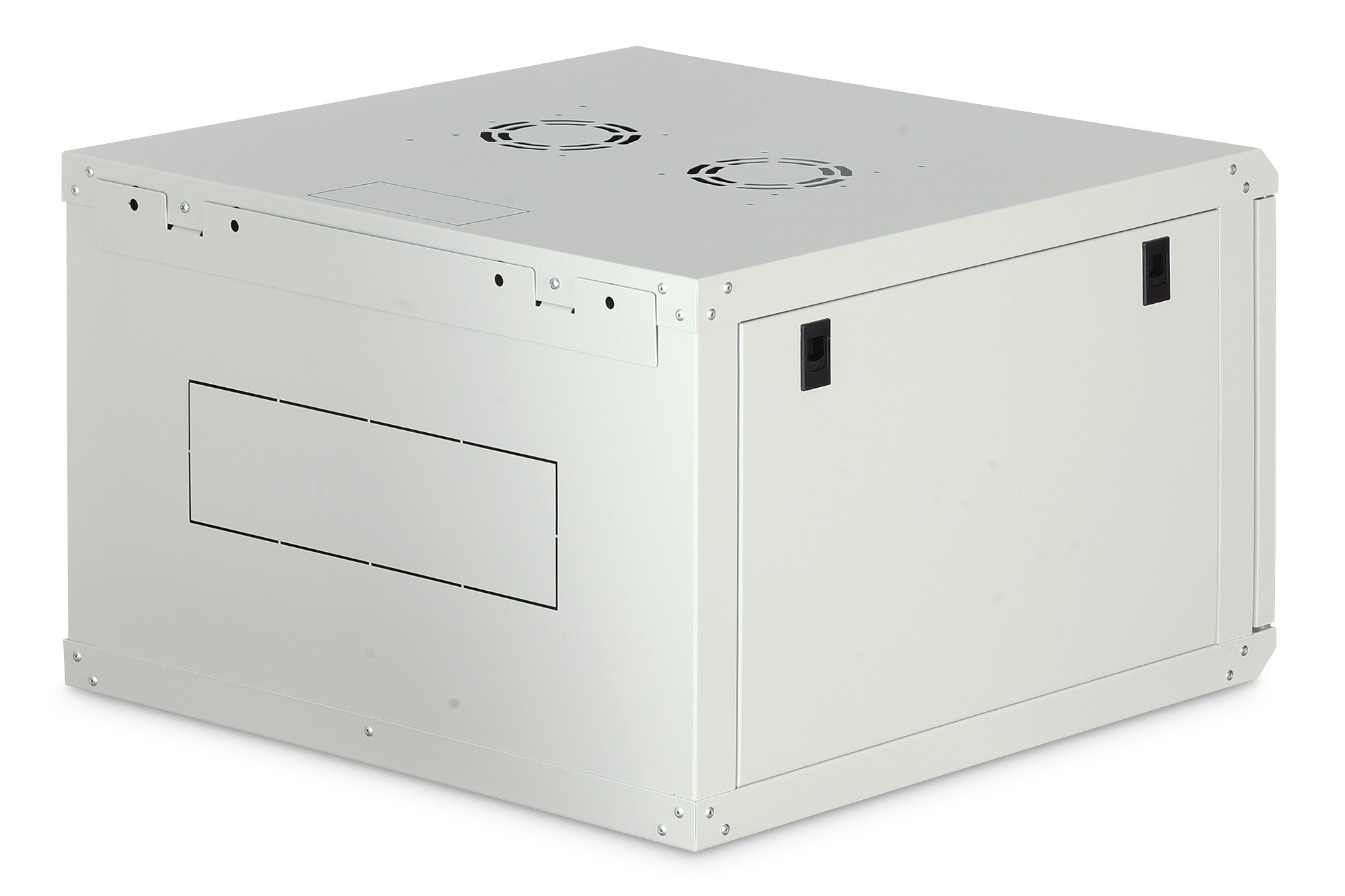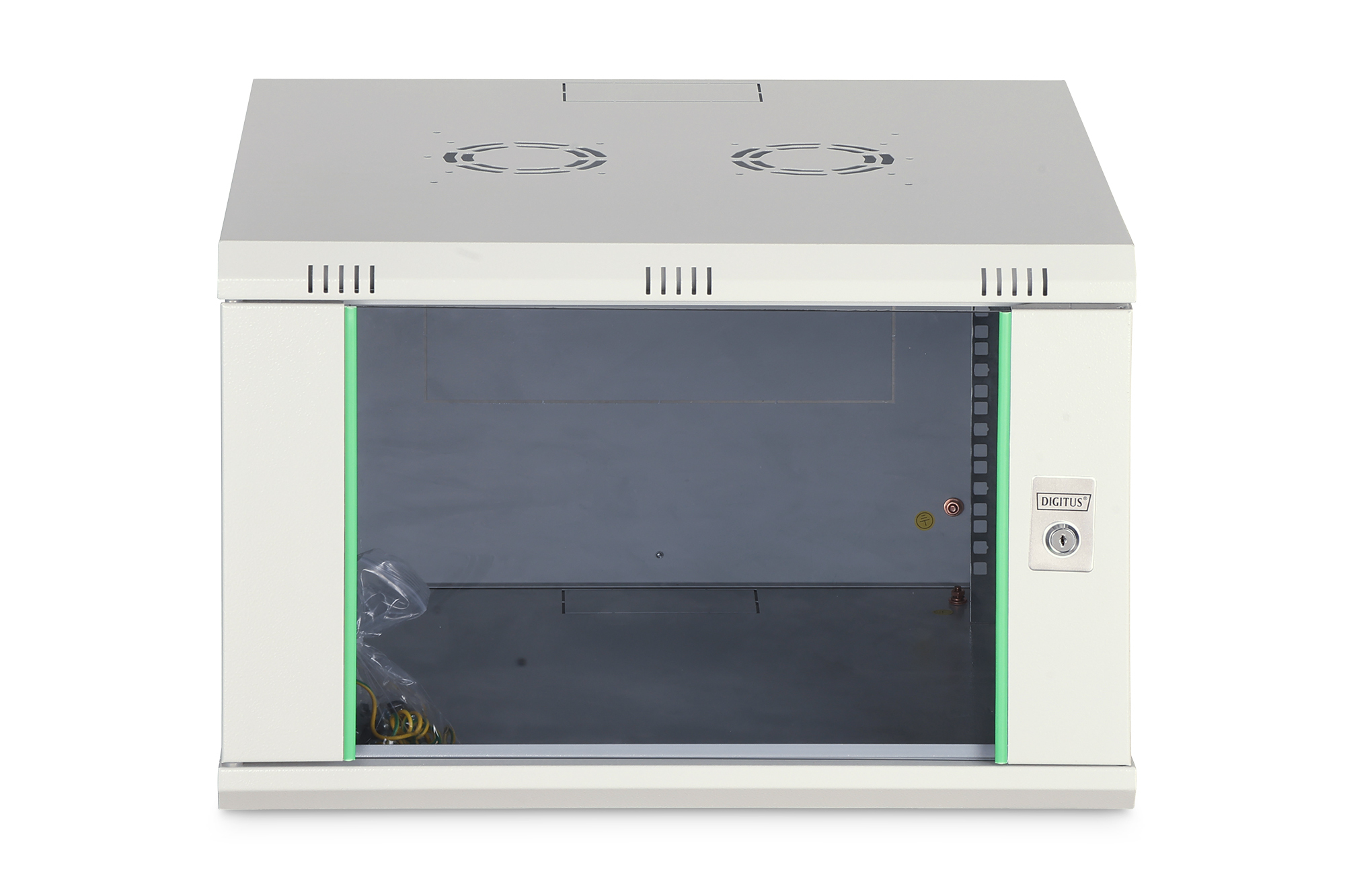 Die Netzwerkschränke zur Wandmontage der Dynamic Serie wurden für einen einfachen und besonders kostenoptimierten Netzwerkausbau entwickelt. Dach, Boden und Rückwand eines jeden Schrankes sind mit einem vorgestanzten Kabeleinlass ausgestattet. Für die Aufnahme eines Lüftermoduls wird das Dachchassis ebenfalls mit einem ausgestanzten Bereich versehen. Zwei Paar galvanisierte, mit in beide Richtungen ablesbare Höheneinheiten beschriftete 483 mm (19")-Profilschienen sind im Inneren verbaut. Diese lassen sich in der Tiefe verstellen. Jeder Schrank ist eine robuste Stahlkonstruktion aus bis zu 1,2 mm starkem Stahlblech. Die Farbgebung erfolgt in Form von elektrostatischer Pulverbeschichtung in den Standardfarben Grau (RAL 7035) und Schwarz (RAL 9005). Abnehmbare Seitenwände sowie die abschließ- und abnehmbare Fronttür, verbessern die Zugänglichkeit. Ein Türanschlagswechsel kann vorgenommen werden. Die Wandmontage erfolgt in zwei einfachen Arbeitsschritten: Das mitgelieferte Montageblech wird an die Wand geschraubt und im Anschluss mit dem Gehäuse verbunden.