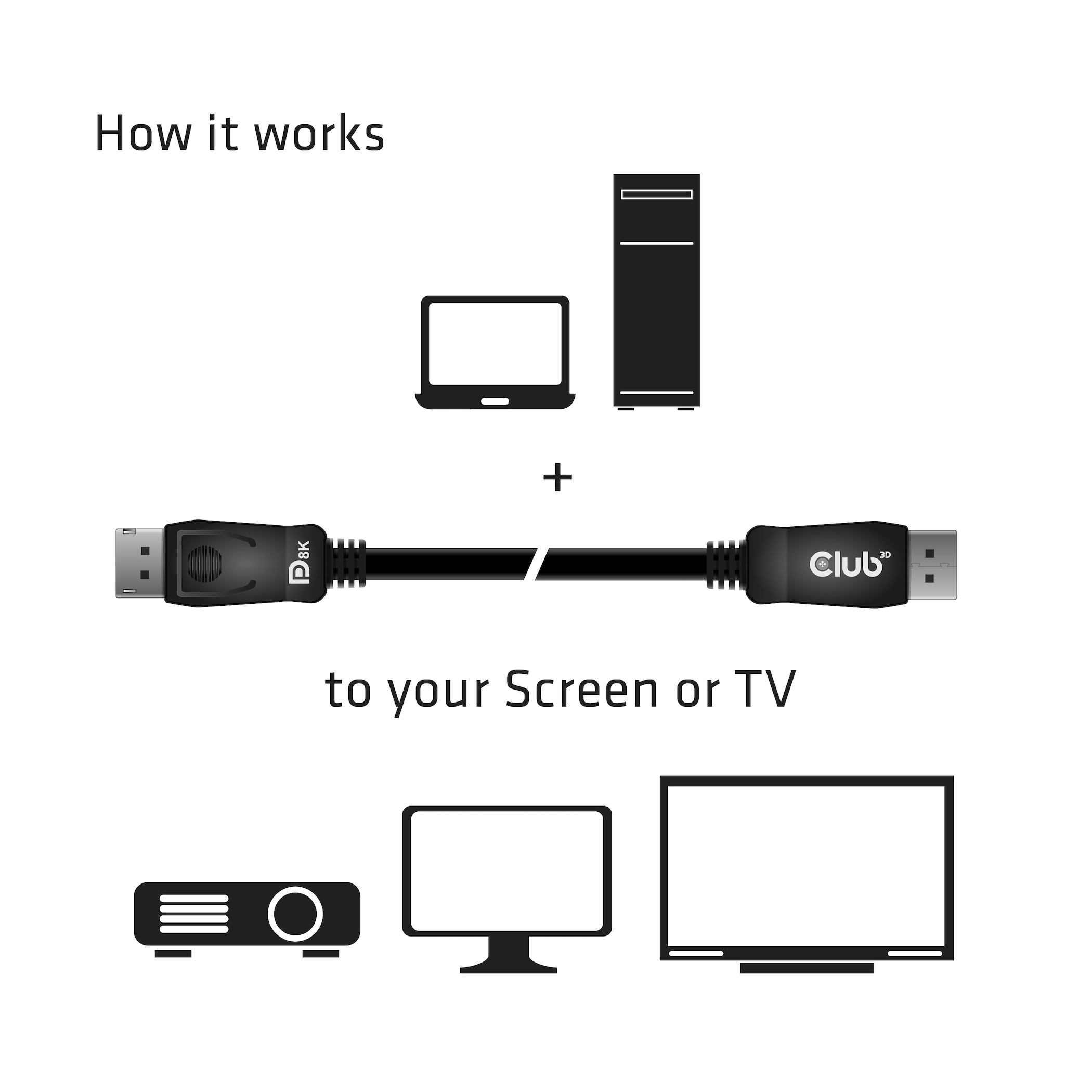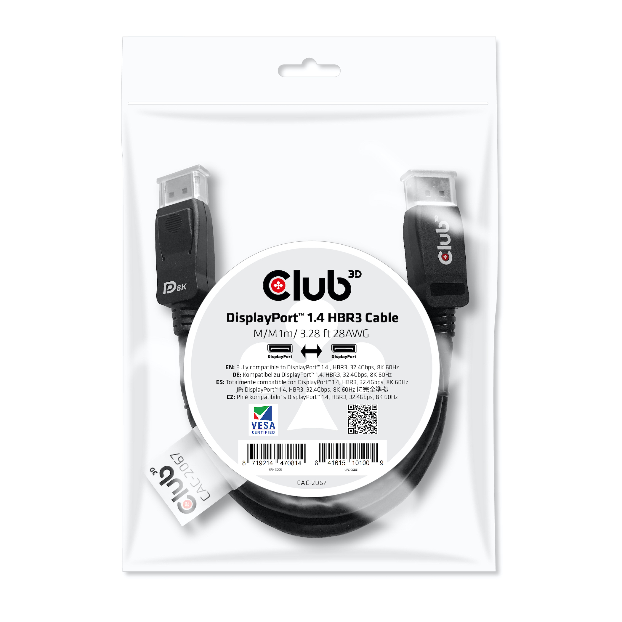 Das Club 3D DisplayPort™ 1.4 HBR3 Kabel ermöglicht die Verbindung Ihres mit DisplayPort™ ausgestatteten (Gaming) PC oder Laptop zu einem (Ultra) High Resolution Monitor oder anderen mit DisplayPort™ ausgestatteten Produkten. DisplayPort™ 1.4 bringt Unterstützung für Display Stream Compression 1.2 (DSC), Forward Error Correction und erweitert die maximale Zahl der Inline Audio Kanäle auf 32. Es ist ausgestattet mit einrastenden DisplayPort™ Konnektors, der eine sichere und verlässliche Verbindung ermöglicht. Einfach den eingebauten Verschluss drücken um den Stecker zu lösen. Die softe UltraFlex Ummantelung schützt das Kabel vor Biege- und Deformationsschäden.