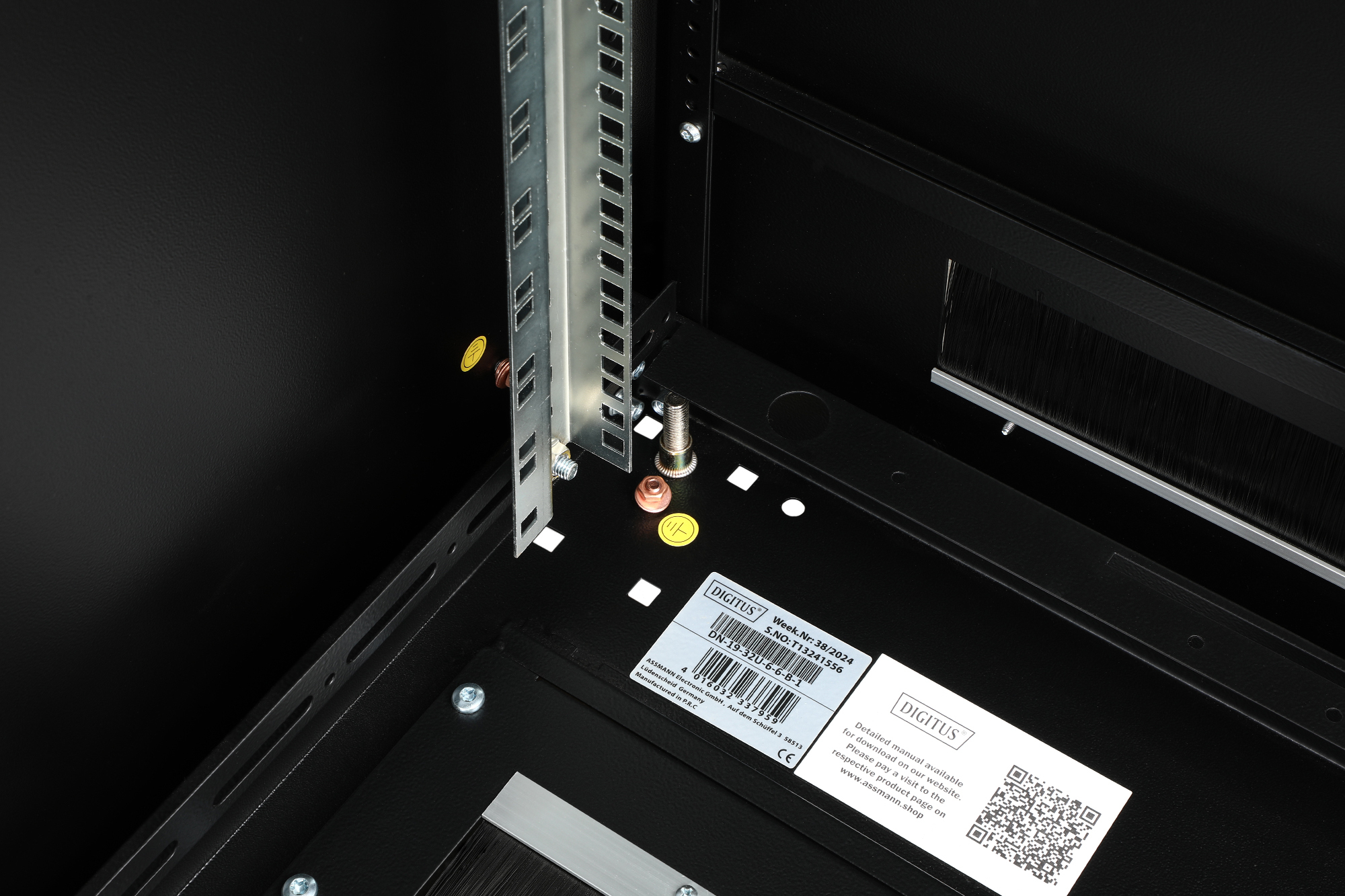 Die Netzwerkschränke der Unique Serie wurden für eine besonders komfortable und flexible Netzwerkverkabelung designt und produziert. Durchdachte Optimierungen bieten marktkonforme Stabilität bei maximaler Flexibilität. Ein modular, durch verschraubte 483 mm (19")-Blindplatten öffenbares Bodenchassis bietet ausreichend Platz für Kabel aller Art. Darüber hinaus befinden sich Kabeleinlässe mit Bürste im hinteren Bereich des Bodenchassis. Rückseitige Bürstenleisten ober- und unterhalb der Rücktür (ab 26HE), ermöglichen den Einsatz bei verschiedensten Anwendungsszenarien. Großzügige vertikale Kabelkanäle mit Kabelführungshilfen und Blende, verbaut in der Frontseite (ab 800 mm Schrankbreite), runden die vielfältigen Eigenschaften des Netzwerkschranks einwandfrei ab. Zwei Paar verkröpfte und galvanisch verzinkte, mit gegenläufig ablesbaren Höheneinheiten beschriftete 483 mm (19")-Profilschienen sind im Inneren verbaut. Sie lassen sich stufenlos verstellen und sind mit zusätzlichen Tiefenstreben im Schrank verbunden. Jeder Schrank ist eine robuste Stahlkonstruktion aus bis zu 1,5 mm starkem Stahlblech. Die Farbgebung erfolgt in Form von elektrostatischer Pulverbeschichtung in den Standardfarben Grau (RAL 7035) und Schwarz (RAL 9005). Modular abschließ- und abnehmbare Seitenwände sowie Türen verbessern die Zugänglichkeit. Ein Türanschlagswechsel kann vorgenommen werden. Des Weiteren sind die Schränke auf Grund der zerlegbaren Konstruktion bei Bedarf komplett demontierbar. Unter Berücksichtigung von Faktoren wie beispielsweise den Gewichten sowie der Wärmeentwicklung von Einbaukomponenten lassen sich, je nach Anwendungsfall, alle DIGITUS® Unique Netzwerkschränke auch als Serverschränke nutzen. Der Einbau von perforierten Stahlblechtüren sorgt bei solchen Varianten für eine verbesserte passive Kühlung der verbauten Komponenten. Ein von DIGITUS® als Serverschrank definiertes Modell wird beispielsweise in der Standardkonfiguration der Unique Server-N Serie zusätzlich um rückseitige PDU-Halterungen ergänzt.