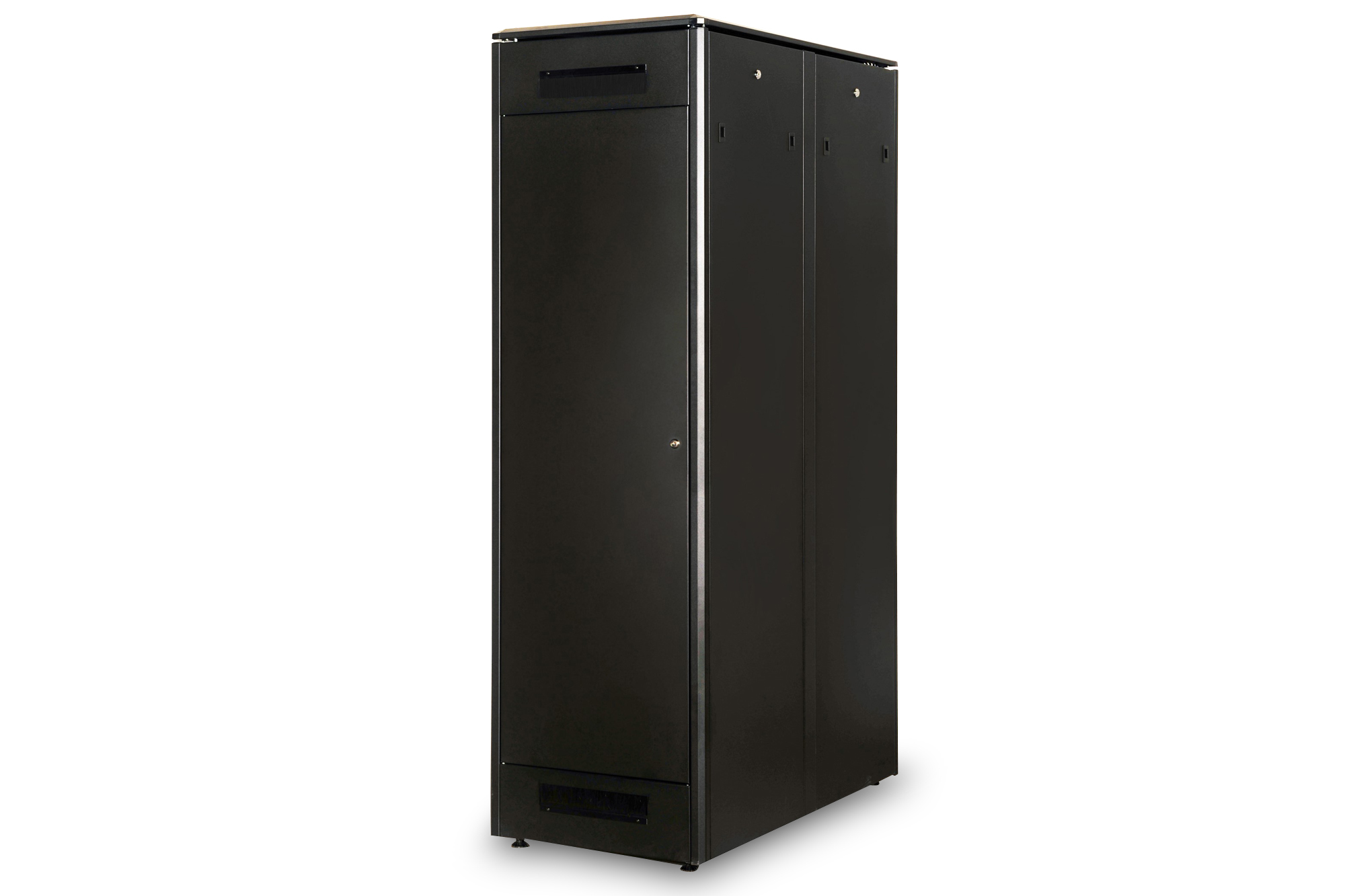 Die Netzwerkschränke der Unique Serie wurden für eine besonders komfortable und flexible Netzwerkverkabelung entwickelt. Mit Bürsten ausgestattete Einlässe im Dach- und Boden (ab 26HE und 800 mm Schrankbreite), ein aufschiebbarer Einlass im Bodenchassis mit Moosgummidichtung sowie rückseitige Bürstenleisten ober- und unterhalb der Rücktür (ab 26HE), ermöglichen einen vielseitigen Einsatz bei verschiedensten Anwendungsszenarien. Vertikale Kabelführungskanäle mit Blende, installiert neben den Profilschienen (ab 800 mm Schrankbreite), runden das Design ab. Ein abgesetzter, abnehmbarer Deckel mit Lüftungsschlitzen sorgt für eine verbesserte Luftzirkulation. Dieser sitzt über einer speziellen Konstruktion für die einfache Aufnahme eines Lüftermoduls. Zwei Paar galvanisierte, mit in beide Richtungen ablesbare Höheneinheiten beschriftete 483 mm (19")-Profilschienen sind im Inneren verbaut. Sie lassen sich in der Tiefe verstellen und sind mit zusätzlichen Tiefenstreben im Schrank verbunden. Jeder Schrank ist eine robuste Stahlkonstruktion aus bis zu 1,5 mm starkem Stahlblech. Die Farbgebung erfolgt in Form von elektrostatischer Pulverbeschichtung in den Standardfarben Grau (RAL 7035) und Schwarz (RAL 9005). Modular abschließ- und abnehmbare Seitenwände sowie Türen verbessern die Zugänglichkeit. Ein Türanschlagswechsel kann vorgenommen werden. Des Weiteren sind die Schränke auf Grund der zerlegbaren Konstruktion bei Bedarf komplett demontierbar.