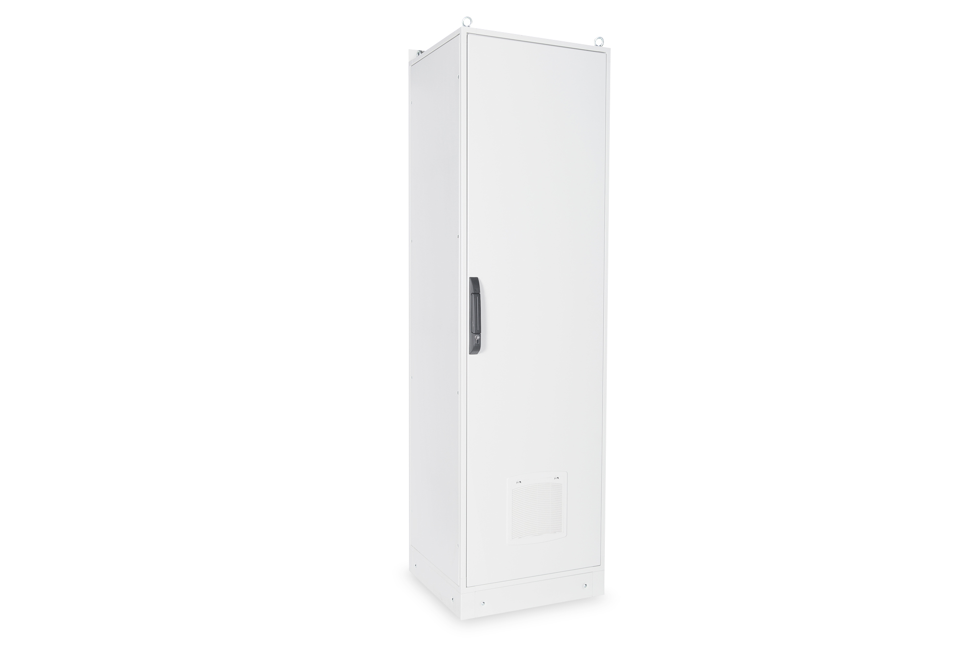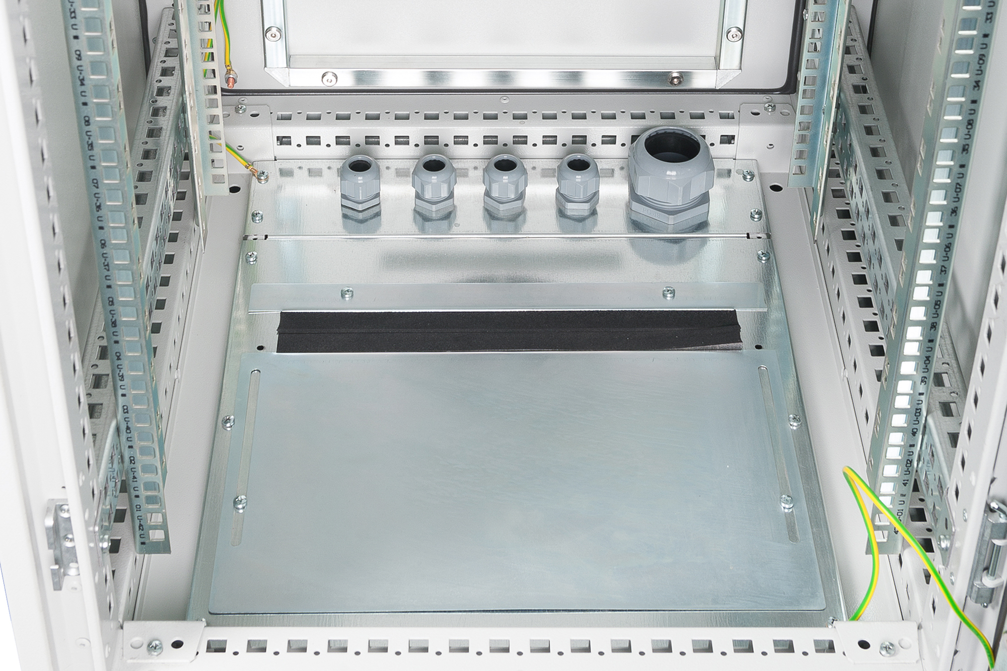 Die 483 mm (19”) Industrie-Netzwerkschränke sind gem. dem Schutzlevel IP55 gegen Staub- und Wassereindringung geschützt (IEC EN 60529) und bieten somit optimale Bedingungen für den benutzerfreundlichen Einbau von aktiven- und passiven Netzwerkkomponenten einhergehend mit einer sauberen Verkabelung im industriellen Umfeld. Die Farbgebung erfolgt durch eine 70-90 µ starke Pulverbeschichtung in der Farbe Grau (RAL 7035) mit einer Haftungsfähigkeit gem. EN ISO 2409: Klasse 0 bis 1. Ein zusätzliche durchgeführter 500-stündiger Resistenztest gegen Salzbesprühung bekräftigt eine mögliche Betriebstemperatur von -25 °C bis zu + 70 °C. Die im Inneren verbauten 483 mm (19“)-Profilschienen (zwei Paare = 4 Stück) sind galvanisiert und mit einer Markierung der Höheneinheit versehen(zählbar in beide Richtungen). Sie lassen sich in der Tiefe verstellen und sind zusätzlich mit Tiefenstreben im Schrank verbunden um so einen intensiven Ausbau mit 483 mm (19“)-Komponenten zu ermöglichen. Eine umlaufende Profillochungsstruktur unterstützt diesen zusätzlich. Jeder Schrank ist mit einem 100 mm hohen Sockel ausgestattet, welcher zusätzlichen Raum für Kabelüberlängen bietet. Im Boden eines jeden Schrankes befindet sich ein aufschiebbarer Kabeleinlass mit Moosgummidichtung sowie fünf PG-Kabeleinlässe (4x PG21 + 1x PG48). Ein umfangreich erhältliches Portfolio an Zubehör für die Kabelrangierung, Fachböden, etc. hilft viele Anforderungen der täglichen Praxis zu erfüllen.