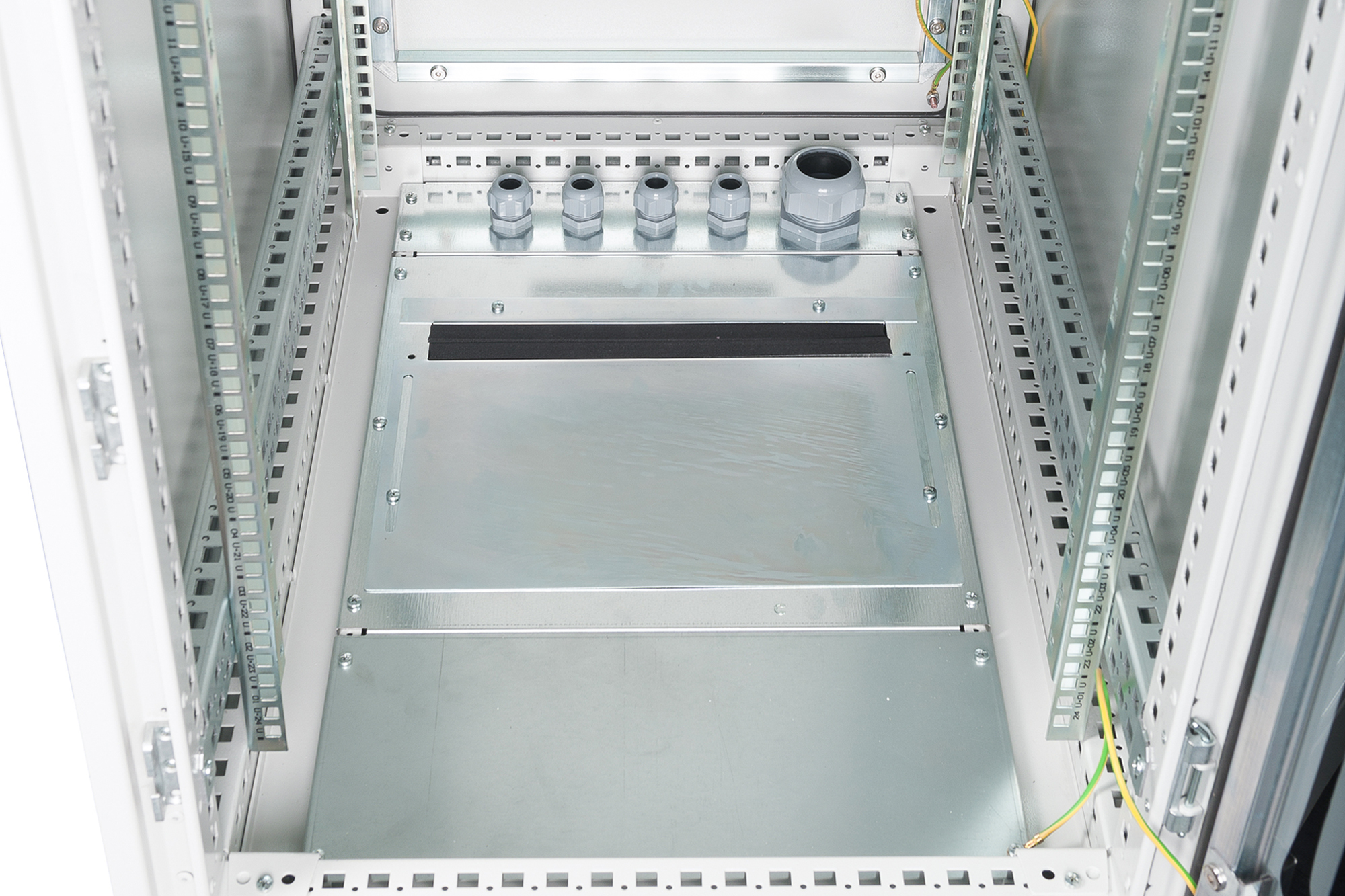 Die freistehenden Industrie-Netzwerkschränke sind gemäß Schutzart IP55 speziell an die Bedürfnisse von rauen Umgebungen angepasst. Das Bodenchassis ist durch seine galvanisierten, verschraubten Blenden modular öffenbar. Zusätzlich ist es mit einem aufschiebbarem Kabeleinlass mit Moosgummidichtung sowie PG-Kabelverschraubungen ausgestattet. Ein unter dem Schrank montierter Sockel (100 mm) sorgt für mehr Stauraum für Kabelüberlängen. Zwei Paar galvanisierte, mit in beide Richtungen ablesbare Höheneinheiten beschriftete 483 mm (19")-Profilschienen sind im Inneren verbaut. Sie lassen sich in der Tiefe verstellen und sind mit zusätzlichen Tiefenstreben im Schrank verbunden. Jeder Schrank ist eine robuste Stahlkonstruktion aus bis zu 2,0 mm starkem Stahlblech. Eine umlaufende Profillochung unterstützt die verschiedensten Installationsmöglichkeiten im Schrank. Die Farbgebung erfolgt in Form von elektrostatischer Pulverbeschichtung in der Standardfarbe Grau (RAL 7035). Die Haftungsfähigkeit gem. EN ISO 2409: Klasse 0 bis 1 sowie der durchgeführte 500-stündige Resistenztest gegen Salzbesprühung, bekräftigt eine mögliche Betriebstemperatur von -25 °C bis zu + 70 °C. Die abnehmbaren Seitenwände, befestigt via Senkkopfschrauben, sowie Türen inkl. Schwenkgriff mit Profil-Halbzylinder, verbessern die Sicherheit der Zugänglichkeit.