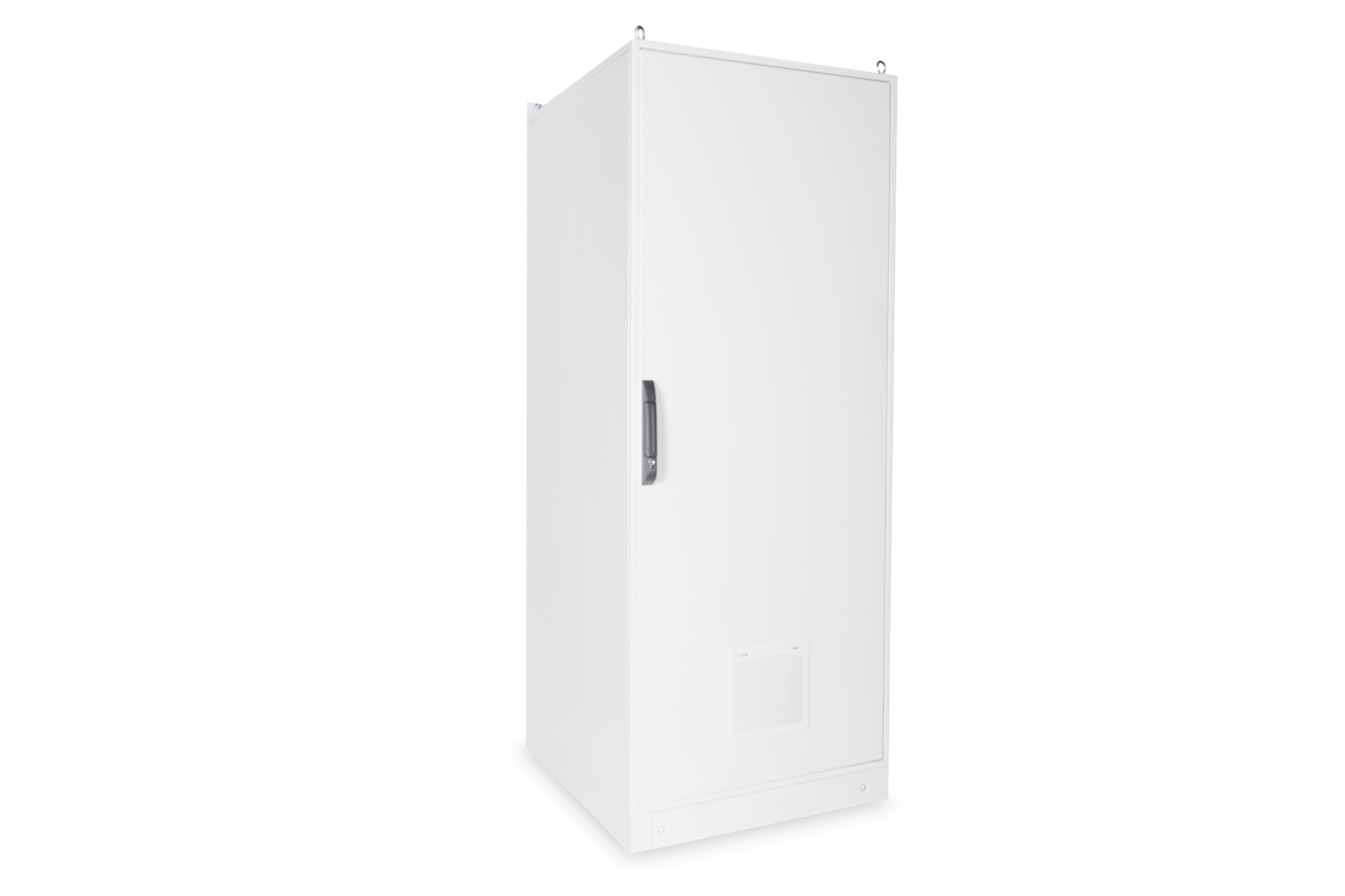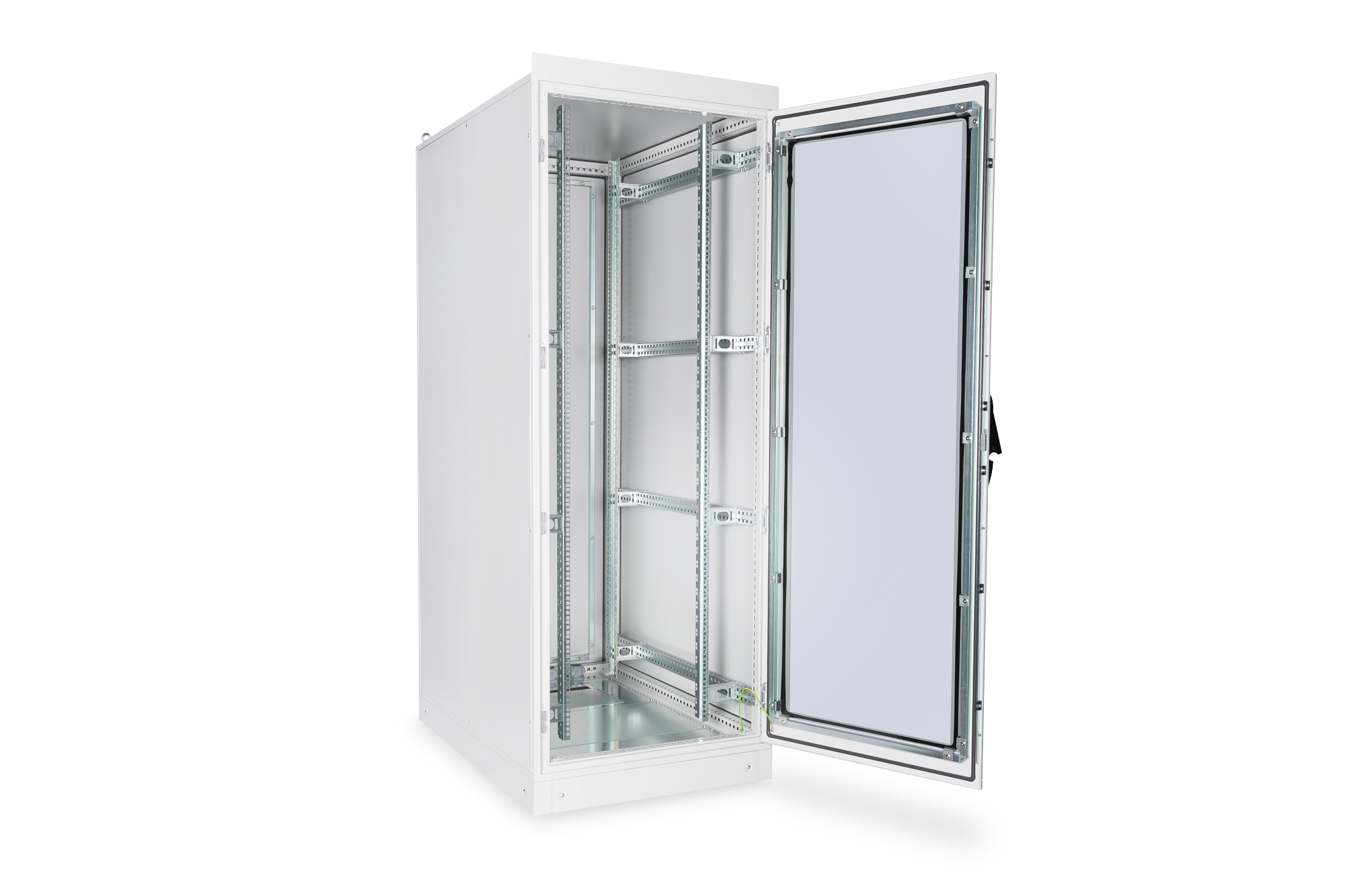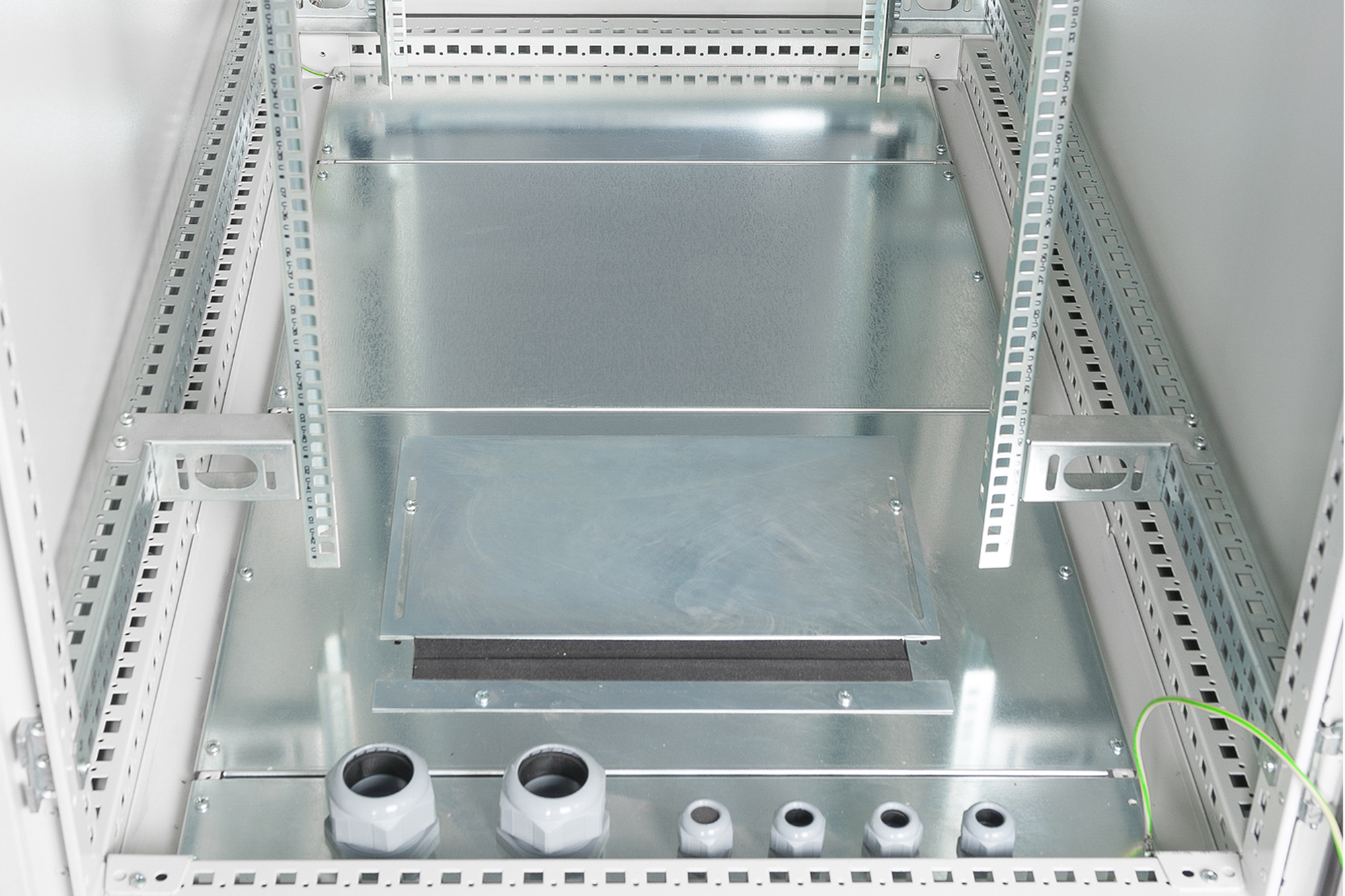 Die 483 mm (19”) Industrie-Netzwerkschränke sind gem. dem Schutzlevel IP55 gegen Staub- und Wassereindringung geschützt (IEC EN 60529) und bieten somit optimale Bedingungen für den benutzerfreundlichen Einbau von aktiven- und passiven Netzwerkkomponenten einhergehend mit einer sauberen Verkabelung im industriellen Umfeld. Die Farbgebung erfolgt durch eine 70-90 µ starke Pulverbeschichtung in der Farbe Grau (RAL 7035) mit einer Haftungsfähigkeit gem. EN ISO 2409: Klasse 0 bis 1. Ein zusätzliche durchgeführter 500-stündiger Resistenztest gegen Salzbesprühung bekräftigt eine mögliche Betriebstemperatur von -25 °C bis zu + 70 °C. Die im Inneren verbauten 483 mm (19“)-Profilschienen (zwei Paare = 4 Stück) sind galvanisiert und mit einer Markierung der Höheneinheit versehen(zählbar in beide Richtungen). Sie lassen sich in der Tiefe verstellen und sind zusätzlich mit Tiefenstreben im Schrank verbunden um so einen intensiven Ausbau mit 483 mm (19“)-Komponenten zu ermöglichen. Eine umlaufende Profillochungsstruktur unterstützt diesen zusätzlich. Jeder Schrank ist mit einem 100 mm hohen Sockel ausgestattet, welcher zusätzlichen Raum für Kabelüberlängen bietet. Im Boden eines jeden Schrankes befindet sich ein aufschiebbarer Kabeleinlass mit Moosgummidichtung sowie fünf PG-Kabeleinlässe (4x PG21 + 1x PG48). Ein umfangreich erhältliches Portfolio an Zubehör für die Kabelrangierung, Fachböden, etc. hilft viele Anforderungen der täglichen Praxis zu erfüllen.