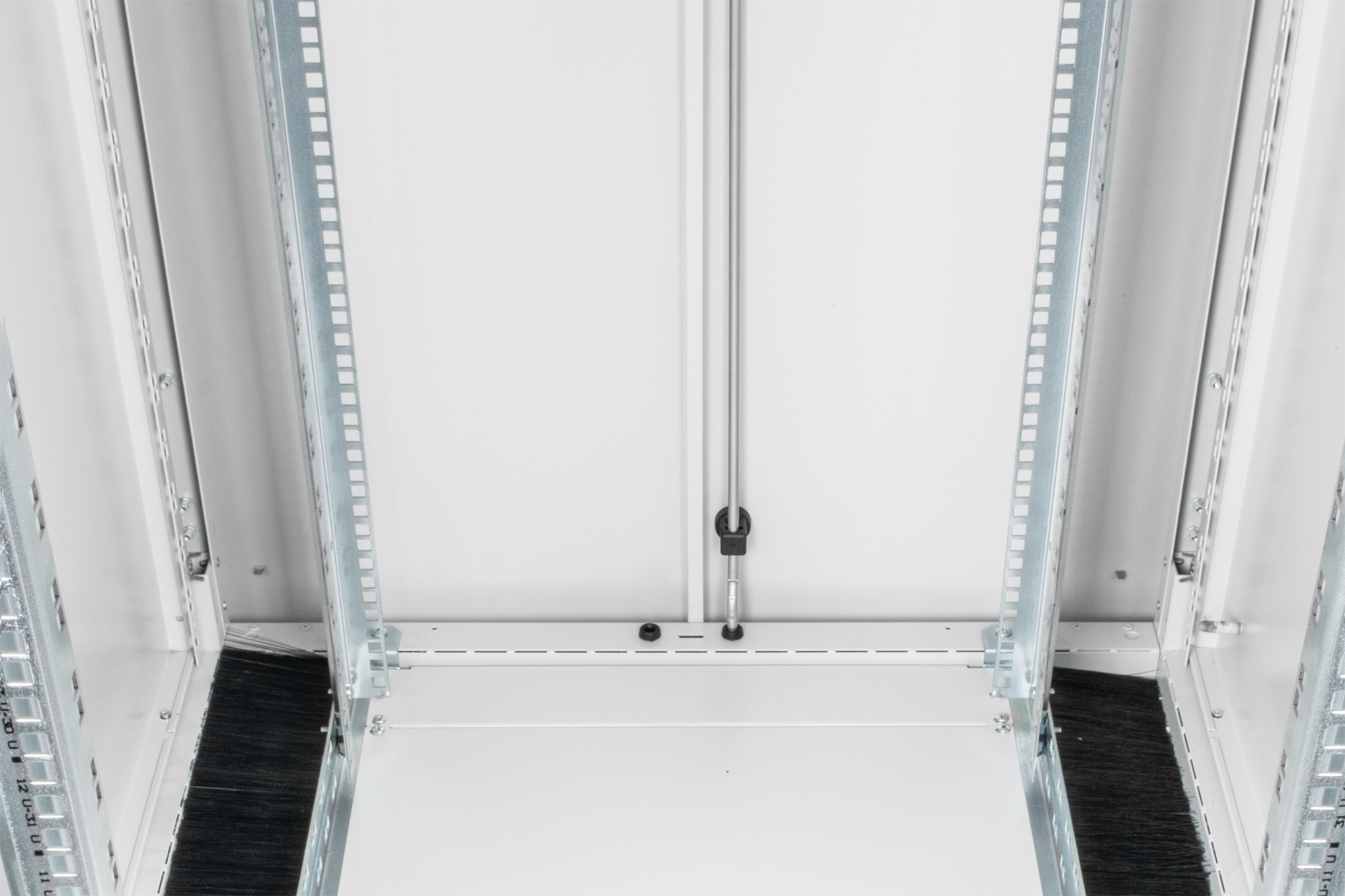 Die neuen varioFLEX Schränke wurden für die Verkabelung und Netzwerkkomponenten designt und produziert. Unsere Planer und Designer haben sich zusammengesetzt um eine besondere, niemals zuvor gesehene 19“-Schrankserie zu entwerfen. Durch besondere Optimierungen, bietet Ihnen die varioFLEX Serie maximale Stabilität und Flexibilität für jede Anforderung. Die Fronttür besteht aus einem kompletten Metallrahmen mit 4 mm starkem Hartglas, verstärkt durch Metallhalterungen, welche für extra Stabilität sorgen. Serverschränke sind mit 70% perforierten Türen ausgestattet. Ein spezielles Verschluss-System befindet sich an der Front- sowie an den Rücktüren. Schränke ab 800 mm Breite sind mit einer doppelflügeligen Rücktür ausgestattet. Der Türöffnungswinkel von bis zu 270° ermöglicht jederzeit beste Erreichbarkeit. Alle Seitenteile sind abschließbar und zur einfachen Entfernung mit jeweils zwei Einrasthebeln ausgerüstet. Jeder Schrank beinhaltet galvanisierte 19“-Profile montiert vorne und hinten im Inneren. Diese sind durch Tiefenstreben an jeweils drei Punkten links und rechts mit dem Hauptrahmen verbunden. Sie sind tiefenverstellbar und besitzen eine Markierung der jeweiligen Höheneinheit. Das Dach sowie der Boden sind mit 19“-Blindplatten ausgestattet (4HE + 8HE = insgesamt 12HE nutzbarer Bereich), welche eine beliebige 19“-Installation erlauben und einfach durch andere Accessoires wie z.B. perforierte Blenden, Kabeleingänge, verschließbare Kabeleingänge, etc. auszutauschen sind. Schränke ab 800 mm Breite sind ausgerüstet mit Bürstenleisten links und rechts in der vollen Tiefe auf dem Dach sowie am Boden. Desweiteren sind 800 mm breite Schränke ab 32HE bereits mit vertikalen Kabelführungskanälen versehen, welche, getrennt vom 19“-Profil, speziell an einer Fixierungseinheit am Hauptrahmen installiert sind. Die Hauptrahmen der varioFLEX Schränke besitzen hoch belastbare vertikale Streben. Diese sind extra gebogen und zur Montage von Kabelmanagement Ringen geeignet. Eingespritzte Randverbindungsstücke aus Aluminium verleihen zusätzliche Stabilität.
