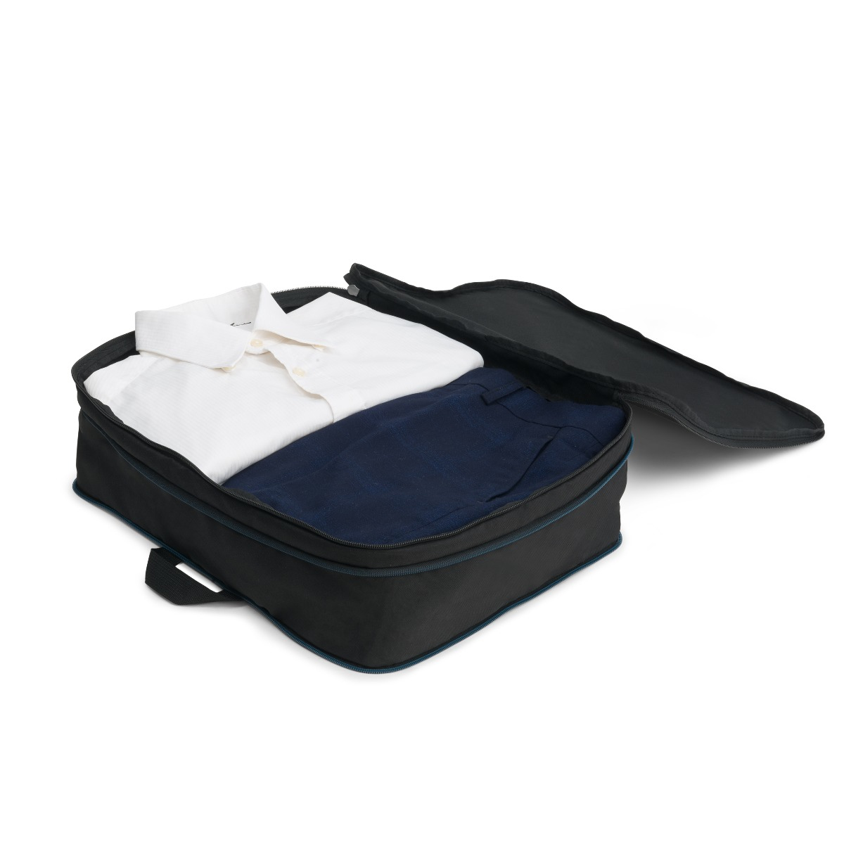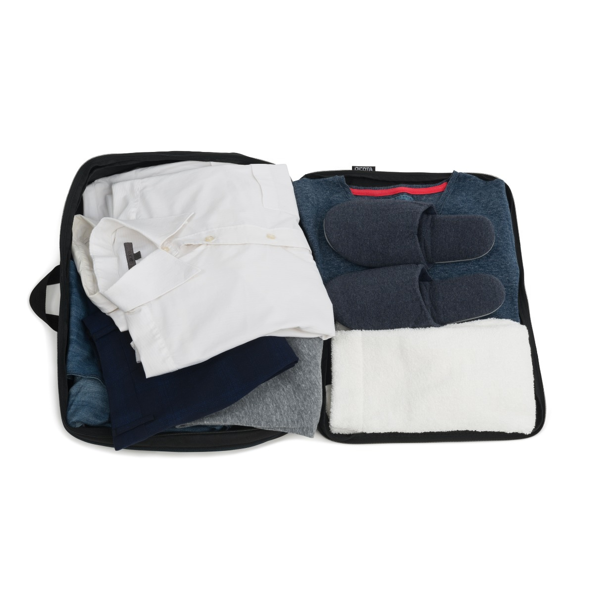 Verwenden Sie die Tasche als zusätzliche Unterteilung in Ihrer Reisetasche. Sie können darin Ihre Schuhe ordentlich aufbewahren, sie für zusammengerollte, gefaltete oder gebündelte Kleidungsstücke verwenden oder für Ihre Wäsche. Sie ist federleicht und hat eine kleine Gurtschlaufe zum Aufhängen. Mit dem zusätzlichen Reißverschluss kann sie erweitert oder verkleinert werden.