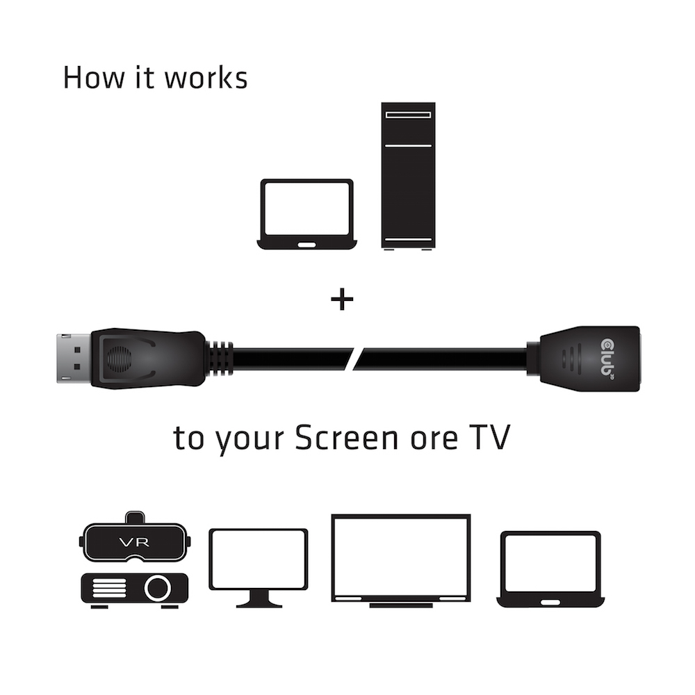 Das Club 3D DisplayPort 1.4 HBR3 Kabel Stecker/Buchse 2m, ermöglicht die Verlängerung Ihrer Verbindung zu Ihrem mit DisplayPort ausgestatteten (Gaming) PC oder Laptop, zu einem (Ultra) hochauflösenden Monitor oder anderen mit DisplayPort ausgestatteten Produkten. DisplayPort 1.4 fügt Unterstützung für Display Stream Compression 1.2 (DSC) hinzu, Forward Error Correction, und erweitert die maximale Anzahl von Inline Audio Kanälen auf 32.Es kommt mit einem einrastenden DisplayPort Stecker, der eine sichere und verlässliche Verbindung herstellt. Um den Stecker zu lösen einfach den eingebauten one-touch Verschlussknopf drücken