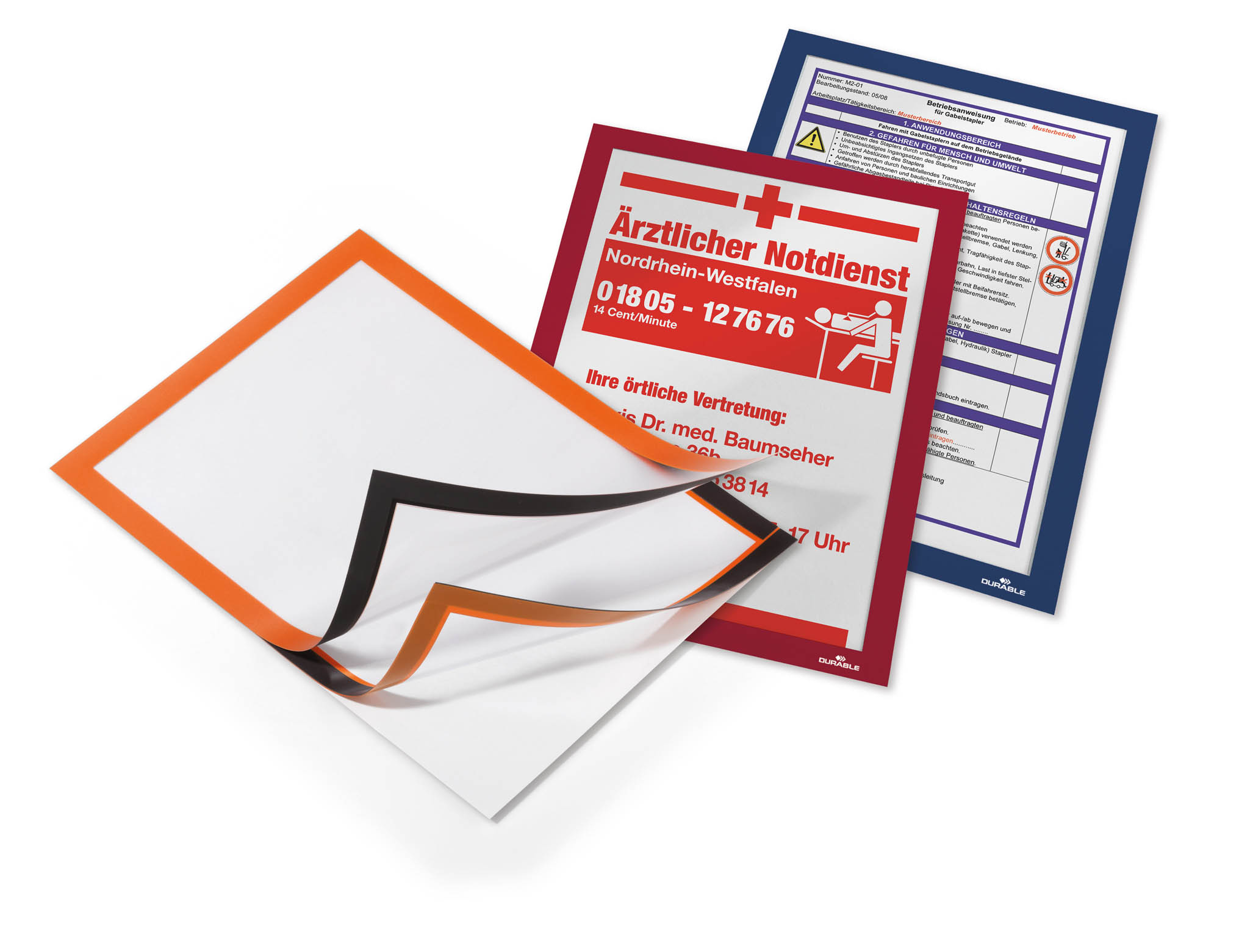 Selbstklebender Informationsrahmen im Format DIN A3 mit aufklappbarer, magnetischer Vorderseite für schnelles und bequemes Wechseln von Informationen.