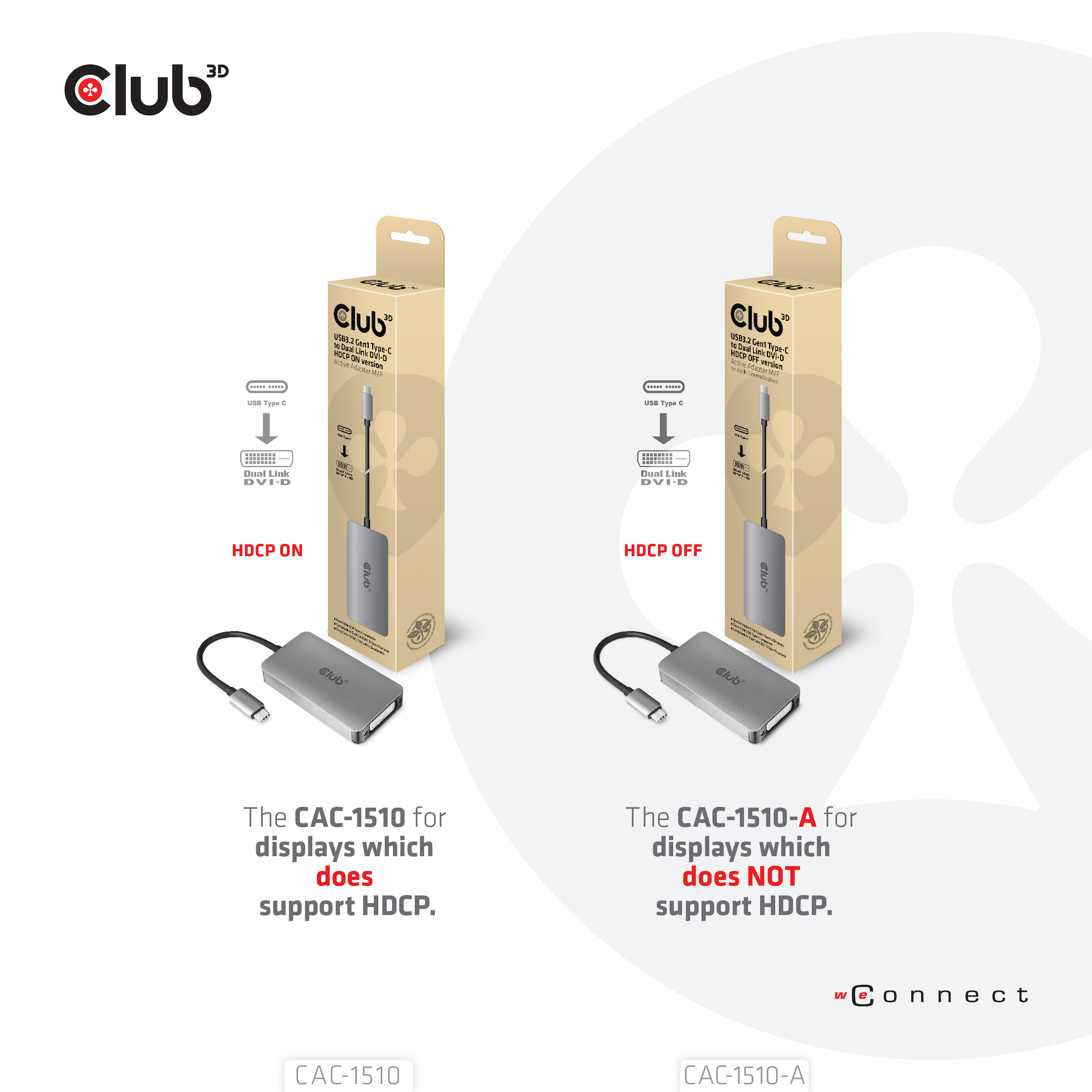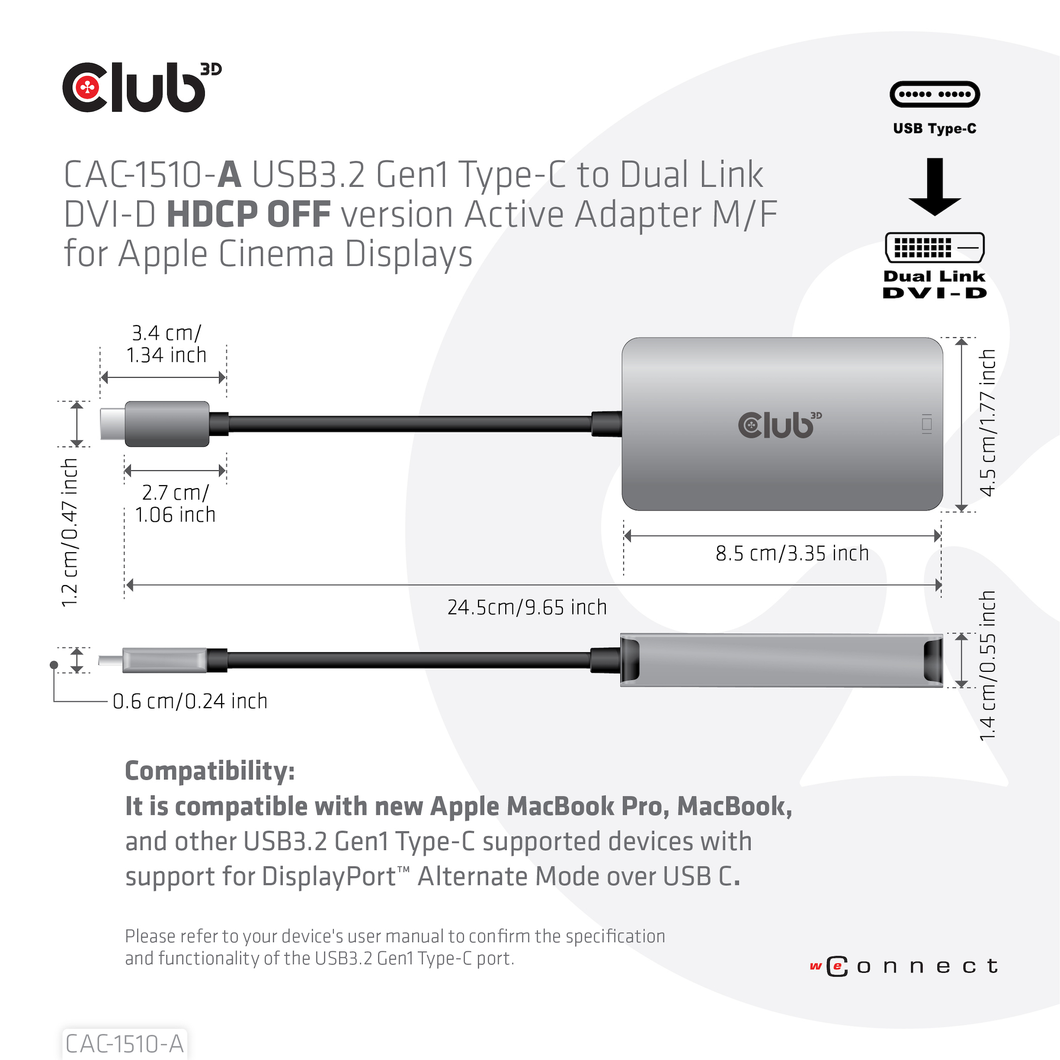 USB3.2 Gen1 Type-C auf Dual Link DVI-D HDCP OFF Version Aktiver Adapter S/B für Apple Cinema DisplaysDer Club 3D CAC-1510-A ist ein USB3.2 Gen1 Type-C Eingang auf Dual Link DVI-D oder Single Link DVI Ausgang Adapter als HDCP OFF Version für Apple Cinema Displays oder andere Displays, die kein HDCP unterstützen.