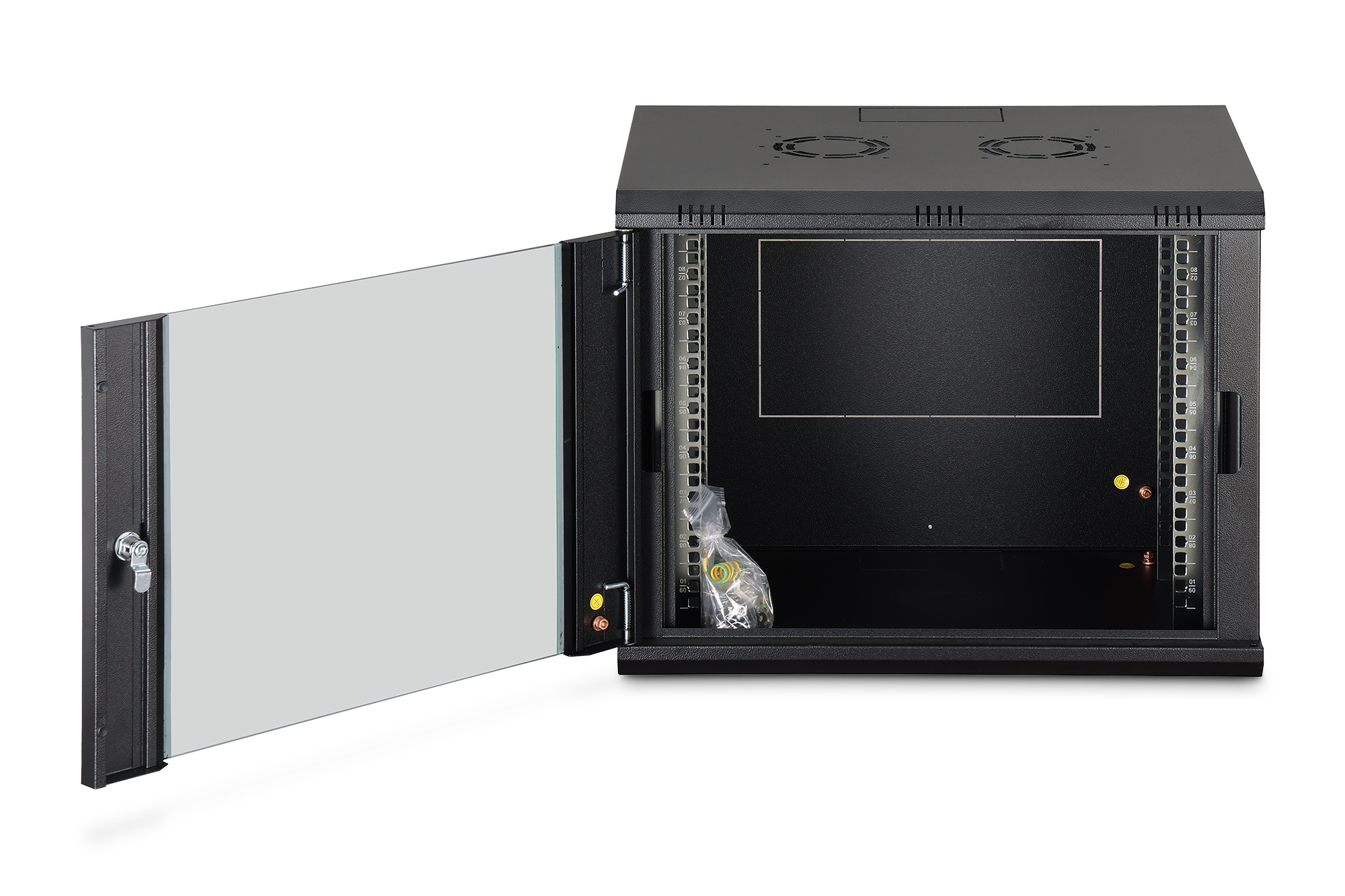 Die Netzwerkschränke zur Wandmontage der Dynamic Serie wurden für einen einfachen und besonders kostenoptimierten Netzwerkausbau entwickelt. Dach, Boden und Rückwand eines jeden Schrankes sind mit einem vorgestanzten Kabeleinlass ausgestattet. Für die Aufnahme eines Lüftermoduls wird das Dachchassis ebenfalls mit einem ausgestanzten Bereich versehen. Zwei Paar galvanisierte, mit in beide Richtungen ablesbare Höheneinheiten beschriftete 483 mm (19")-Profilschienen sind im Inneren verbaut. Diese lassen sich in der Tiefe verstellen. Jeder Schrank ist eine robuste Stahlkonstruktion aus bis zu 1,2 mm starkem Stahlblech. Die Farbgebung erfolgt in Form von elektrostatischer Pulverbeschichtung in den Standardfarben Grau (RAL 7035) und Schwarz (RAL 9005). Abnehmbare Seitenwände sowie die abschließ- und abnehmbare Fronttür, verbessern die Zugänglichkeit. Ein Türanschlagswechsel kann vorgenommen werden. Die Wandmontage erfolgt in zwei einfachen Arbeitsschritten: Das mitgelieferte Montageblech wird an die Wand geschraubt und im Anschluss mit dem Gehäuse verbunden.