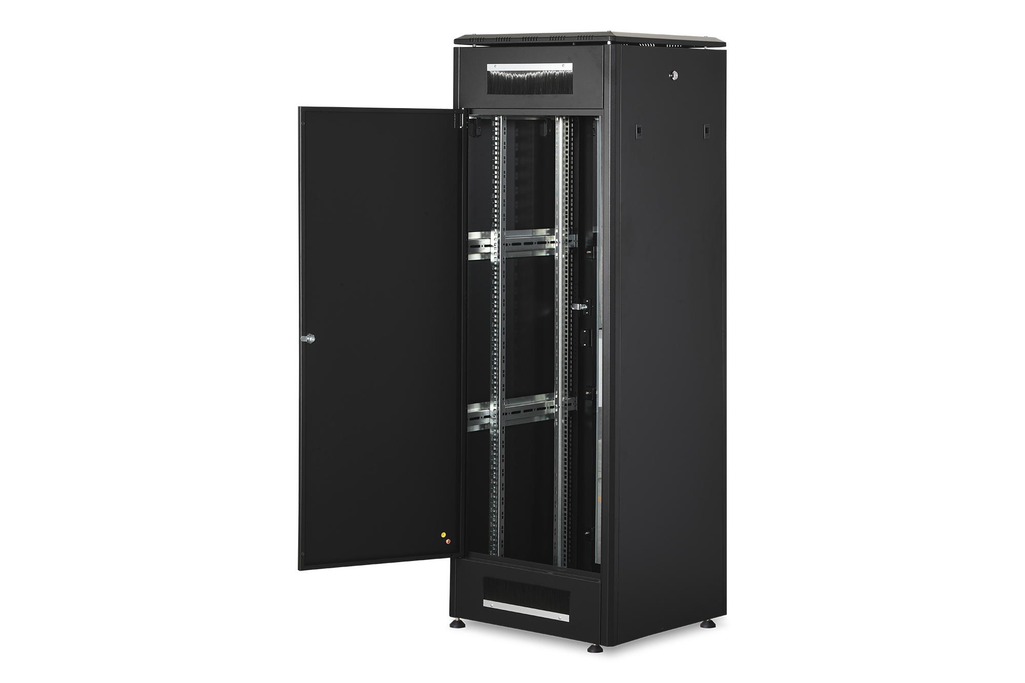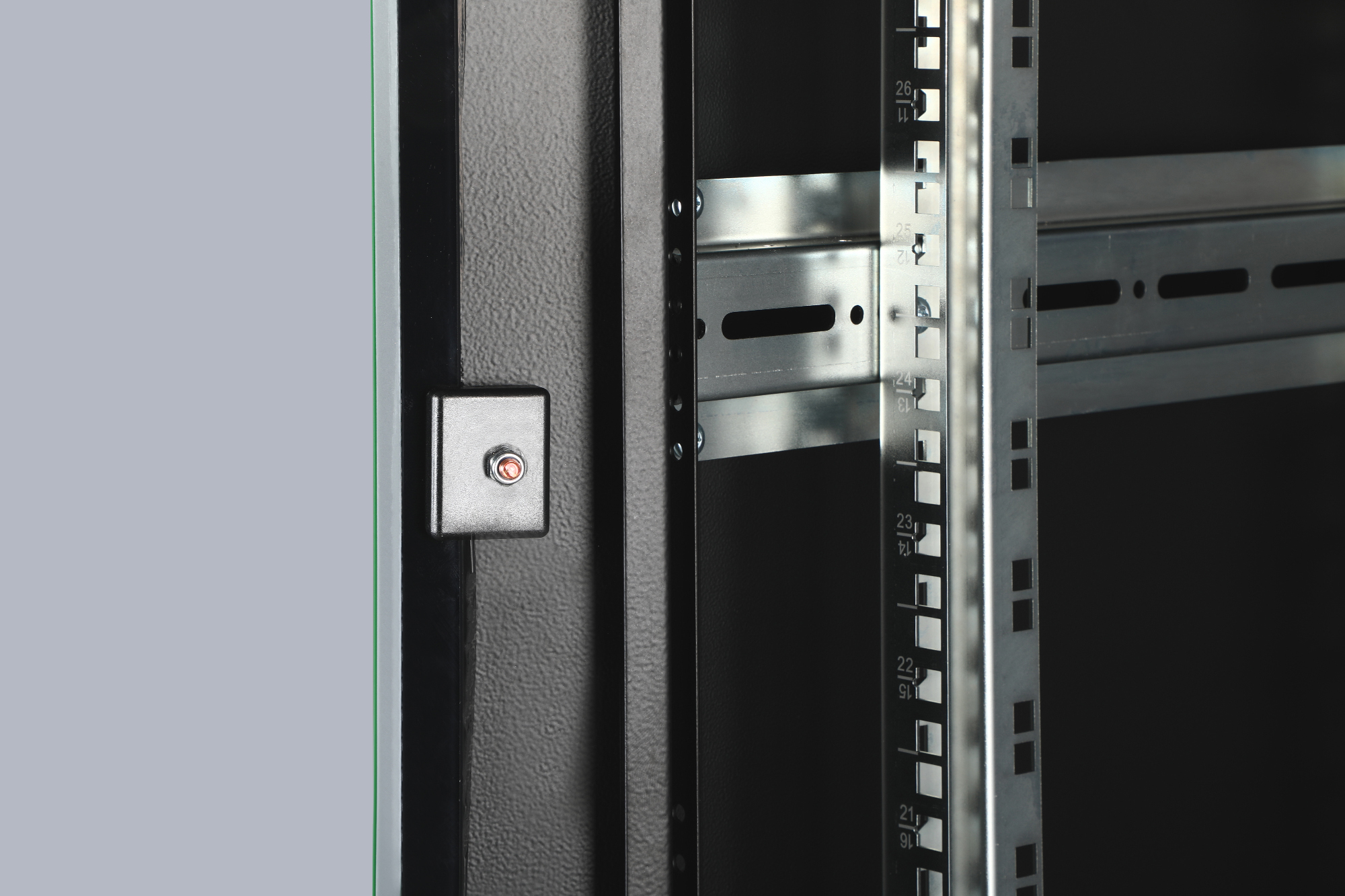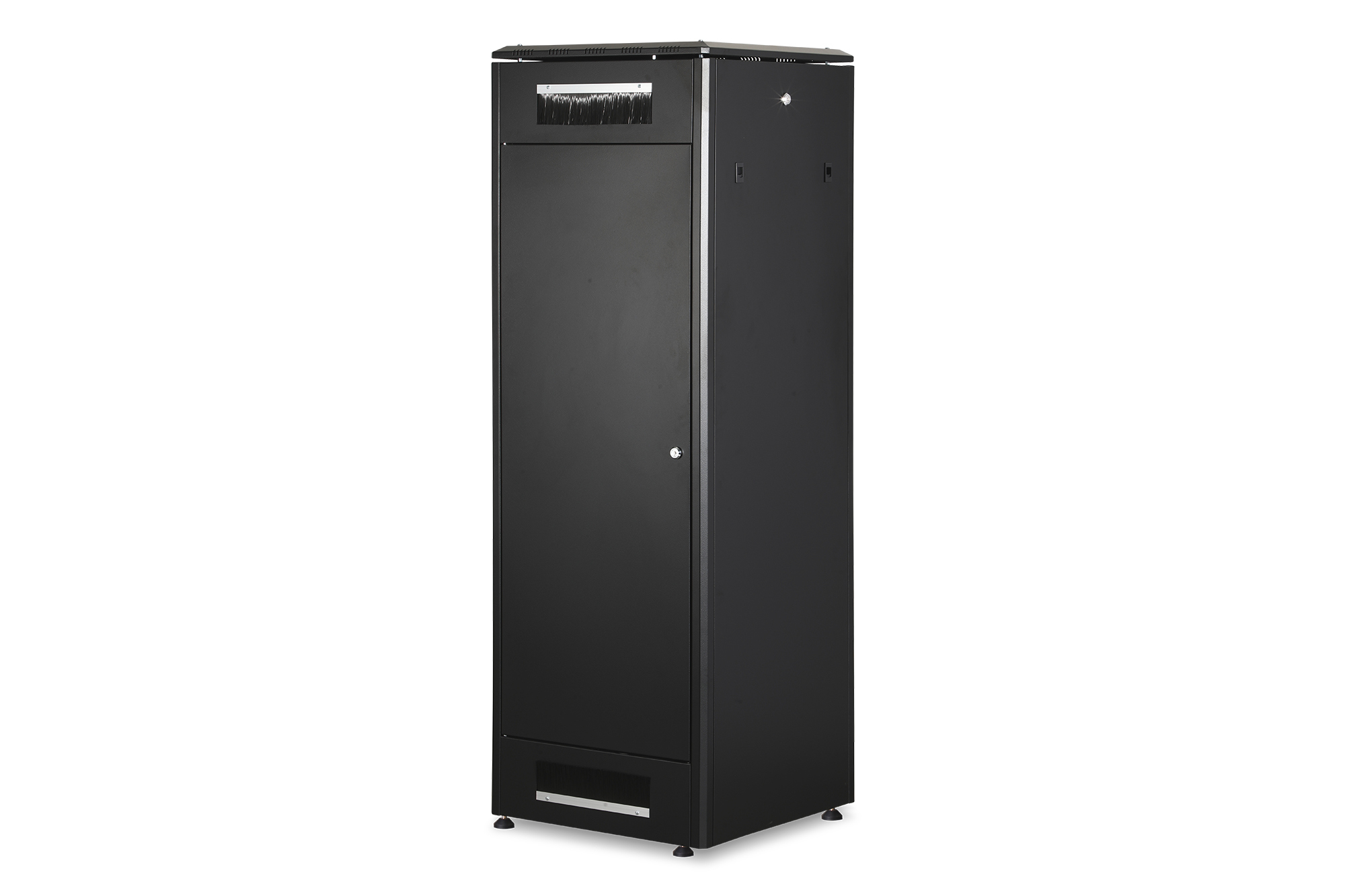 Die Netzwerkschränke der Unique Serie wurden für eine besonders komfortable und flexible Netzwerkverkabelung designt und produziert. Durchdachte Optimierungen bieten marktkonforme Stabilität bei maximaler Flexibilität. Ein modular, durch verschraubte 483 mm (19")-Blindplatten öffenbares Bodenchassis bietet ausreichend Platz für Kabel aller Art. Darüber hinaus befinden sich Kabeleinlässe mit Bürste im hinteren Bereich des Bodenchassis. Rückseitige Bürstenleisten ober- und unterhalb der Rücktür (ab 26HE), ermöglichen den Einsatz bei verschiedensten Anwendungsszenarien. Großzügige vertikale Kabelkanäle mit Kabelführungshilfen und Blende, verbaut in der Frontseite (ab 800 mm Schrankbreite), runden die vielfältigen Eigenschaften des Netzwerkschranks einwandfrei ab. Zwei Paar verkröpfte und galvanisch verzinkte, mit gegenläufig ablesbaren Höheneinheiten beschriftete 483 mm (19")-Profilschienen sind im Inneren verbaut. Sie lassen sich stufenlos verstellen und sind mit zusätzlichen Tiefenstreben im Schrank verbunden. Jeder Schrank ist eine robuste Stahlkonstruktion aus bis zu 1,5 mm starkem Stahlblech. Die Farbgebung erfolgt in Form von elektrostatischer Pulverbeschichtung in den Standardfarben Grau (RAL 7035) und Schwarz (RAL 9005). Modular abschließ- und abnehmbare Seitenwände sowie Türen verbessern die Zugänglichkeit. Ein Türanschlagswechsel kann vorgenommen werden. Des Weiteren sind die Schränke auf Grund der zerlegbaren Konstruktion bei Bedarf komplett demontierbar. Unter Berücksichtigung von Faktoren wie beispielsweise den Gewichten sowie der Wärmeentwicklung von Einbaukomponenten lassen sich, je nach Anwendungsfall, alle DIGITUS® Unique Netzwerkschränke auch als Serverschränke nutzen. Der Einbau von perforierten Stahlblechtüren sorgt bei solchen Varianten für eine verbesserte passive Kühlung der verbauten Komponenten. Ein von DIGITUS® als Serverschrank definiertes Modell wird beispielsweise in der Standardkonfiguration der Unique Server-N Serie zusätzlich um rückseitige PDU-Halterungen ergänzt.