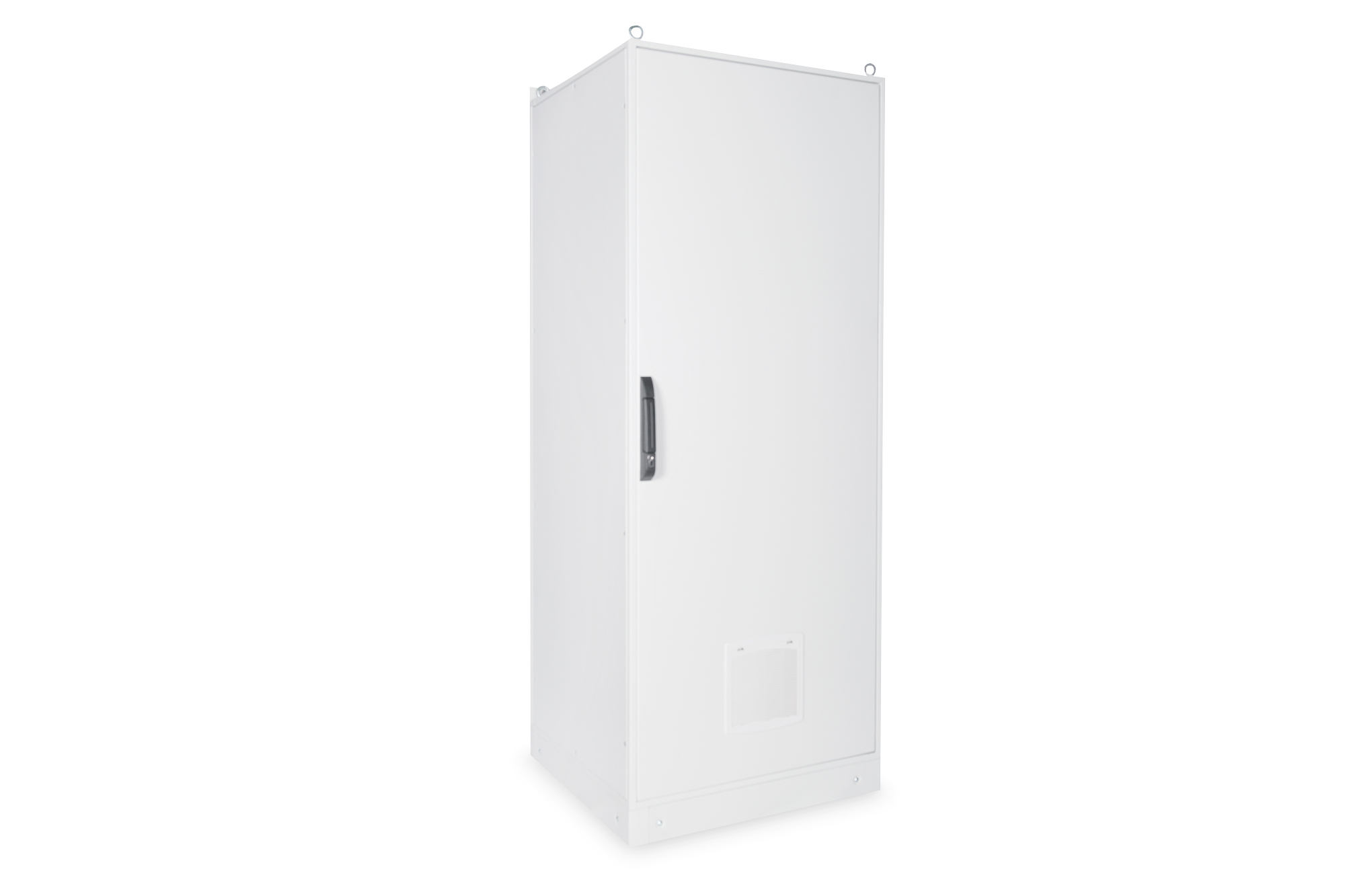 Die freistehenden Industrie-Netzwerkschränke sind gemäß Schutzart IP55 speziell an die Bedürfnisse von rauen Umgebungen angepasst. Das Bodenchassis ist durch seine galvanisierten, verschraubten Blenden modular öffenbar. Zusätzlich ist es mit einem aufschiebbarem Kabeleinlass mit Moosgummidichtung sowie PG-Kabelverschraubungen ausgestattet. Ein unter dem Schrank montierter Sockel (100 mm) sorgt für mehr Stauraum für Kabelüberlängen. Zwei Paar galvanisierte, mit in beide Richtungen ablesbare Höheneinheiten beschriftete 483 mm (19")-Profilschienen sind im Inneren verbaut. Sie lassen sich in der Tiefe verstellen und sind mit zusätzlichen Tiefenstreben im Schrank verbunden. Jeder Schrank ist eine robuste Stahlkonstruktion aus bis zu 2,0 mm starkem Stahlblech. Eine umlaufende Profillochung unterstützt die verschiedensten Installationsmöglichkeiten im Schrank. Die Farbgebung erfolgt in Form von elektrostatischer Pulverbeschichtung in der Standardfarbe Grau (RAL 7035). Die Haftungsfähigkeit gem. EN ISO 2409: Klasse 0 bis 1 sowie der durchgeführte 500-stündige Resistenztest gegen Salzbesprühung, bekräftigt eine mögliche Betriebstemperatur von -25 °C bis zu + 70 °C. Die abnehmbaren Seitenwände, befestigt via Senkkopfschrauben, sowie Türen inkl. Schwenkgriff mit Profil-Halbzylinder, verbessern die Sicherheit der Zugänglichkeit.