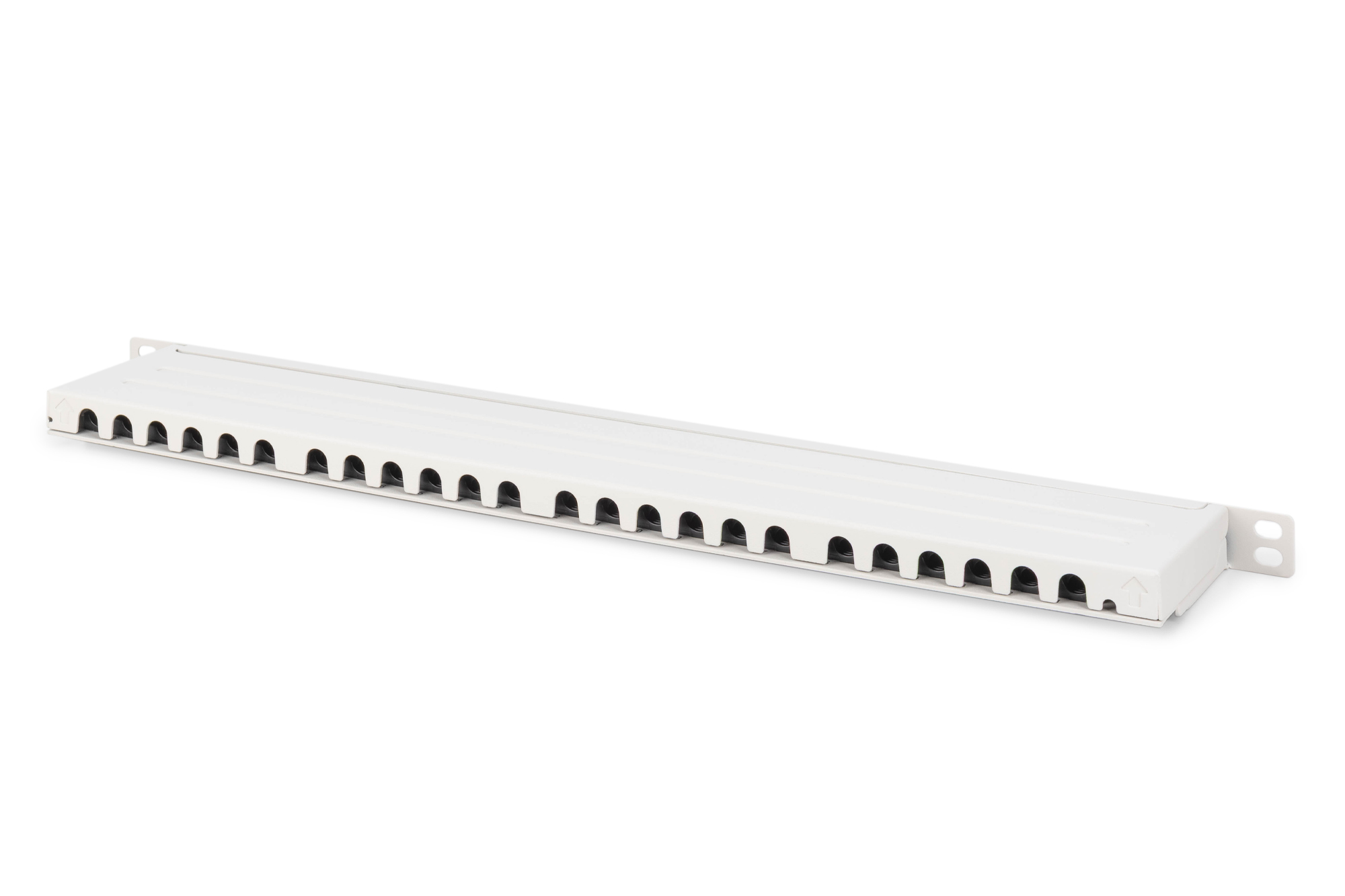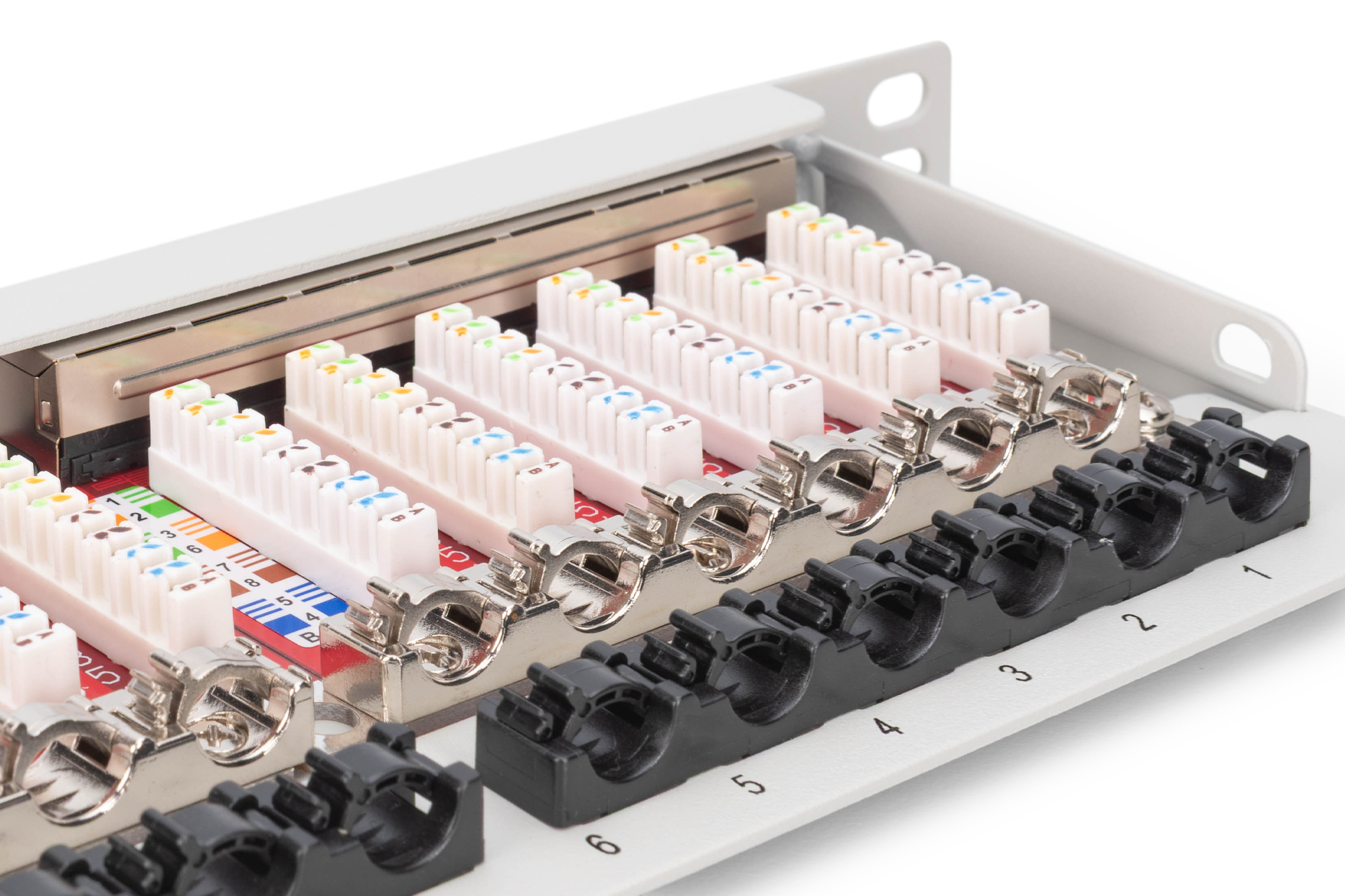 Das DIGITUS® 24-Port Patch Panel bietet mit nur 0,5 HE eine sehr hohe Packdichte. Das bedeutet, dass sich auf 1 HE bis zu 48 Ports mit zwei 0,5 HE Panels realisieren lassen. Das Patch Panel ist geschirmt und mit Staubschutzkappen an den RJ45-Buchsen ausgestattet. Die 360° Schirmkontaktierung der Kabel sorgt für beste Leistungseigenschaften. Der Schnellverschluss am Gehäuse sorgt für leichten und werkzeuglosen Zugriff auf die LSA-Schneidklemmen.