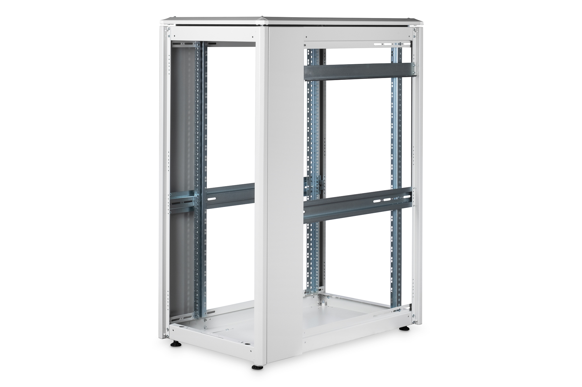 Die Netzwerkschränke der Unique Serie wurden für eine besonders komfortable und flexible Netzwerkverkabelung entwickelt. Mit Bürsten ausgestattete Einlässe im Dach- und Boden (ab 26HE und 800 mm Schrankbreite), ein aufschiebbarer Einlass im Bodenchassis mit Moosgummidichtung sowie rückseitige Bürstenleisten ober- und unterhalb der Rücktür (ab 26HE), ermöglichen einen vielseitigen Einsatz bei verschiedensten Anwendungsszenarien. Vertikale Kabelführungskanäle mit Blende, installiert neben den Profilschienen (ab 800 mm Schrankbreite), runden das Design ab. Ein abgesetzter, abnehmbarer Deckel mit Lüftungsschlitzen sorgt für eine verbesserte Luftzirkulation. Dieser sitzt über einer speziellen Konstruktion für die einfache Aufnahme eines Lüftermoduls. Zwei Paar galvanisierte, mit in beide Richtungen ablesbare Höheneinheiten beschriftete 483 mm (19")-Profilschienen sind im Inneren verbaut. Sie lassen sich in der Tiefe verstellen und sind mit zusätzlichen Tiefenstreben im Schrank verbunden. Jeder Schrank ist eine robuste Stahlkonstruktion aus bis zu 1,5 mm starkem Stahlblech. Die Farbgebung erfolgt in Form von elektrostatischer Pulverbeschichtung in den Standardfarben Grau (RAL 7035) und Schwarz (RAL 9005). Modular abschließ- und abnehmbare Seitenwände sowie Türen verbessern die Zugänglichkeit. Ein Türanschlagswechsel kann vorgenommen werden. Des Weiteren sind die Schränke auf Grund der zerlegbaren Konstruktion bei Bedarf komplett demontierbar.
