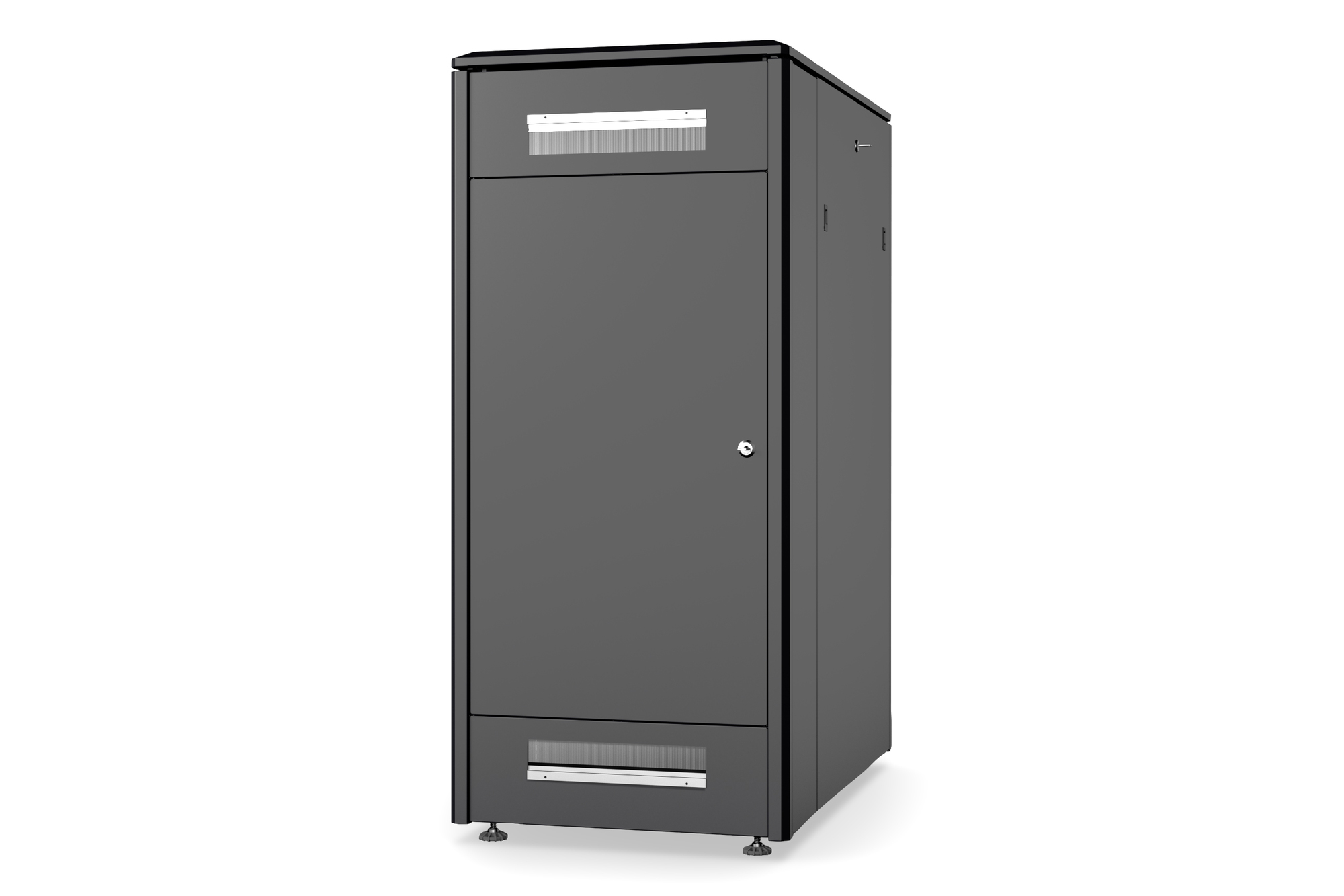 Die Netzwerkschränke der Unique Serie wurden für eine besonders komfortable und flexible Netzwerkverkabelung entwickelt. Mit Bürsten ausgestattete Einlässe im Dach- und Boden (ab 26HE und 800 mm Schrankbreite), ein aufschiebbarer Einlass im Bodenchassis mit Moosgummidichtung sowie rückseitige Bürstenleisten ober- und unterhalb der Rücktür (ab 26HE), ermöglichen einen vielseitigen Einsatz bei verschiedensten Anwendungsszenarien. Vertikale Kabelführungskanäle mit Blende, installiert neben den Profilschienen (ab 800 mm Schrankbreite), runden das Design ab. Ein abgesetzter, abnehmbarer Deckel mit Lüftungsschlitzen sorgt für eine verbesserte Luftzirkulation. Dieser sitzt über einer speziellen Konstruktion für die einfache Aufnahme eines Lüftermoduls. Zwei Paar galvanisierte, mit in beide Richtungen ablesbare Höheneinheiten beschriftete 483 mm (19")-Profilschienen sind im Inneren verbaut. Sie lassen sich in der Tiefe verstellen und sind mit zusätzlichen Tiefenstreben im Schrank verbunden. Jeder Schrank ist eine robuste Stahlkonstruktion aus bis zu 1,5 mm starkem Stahlblech. Die Farbgebung erfolgt in Form von elektrostatischer Pulverbeschichtung in den Standardfarben Grau (RAL 7035) und Schwarz (RAL 9005). Modular abschließ- und abnehmbare Seitenwände sowie Türen verbessern die Zugänglichkeit. Ein Türanschlagswechsel kann vorgenommen werden. Des Weiteren sind die Schränke auf Grund der zerlegbaren Konstruktion bei Bedarf komplett demontierbar.