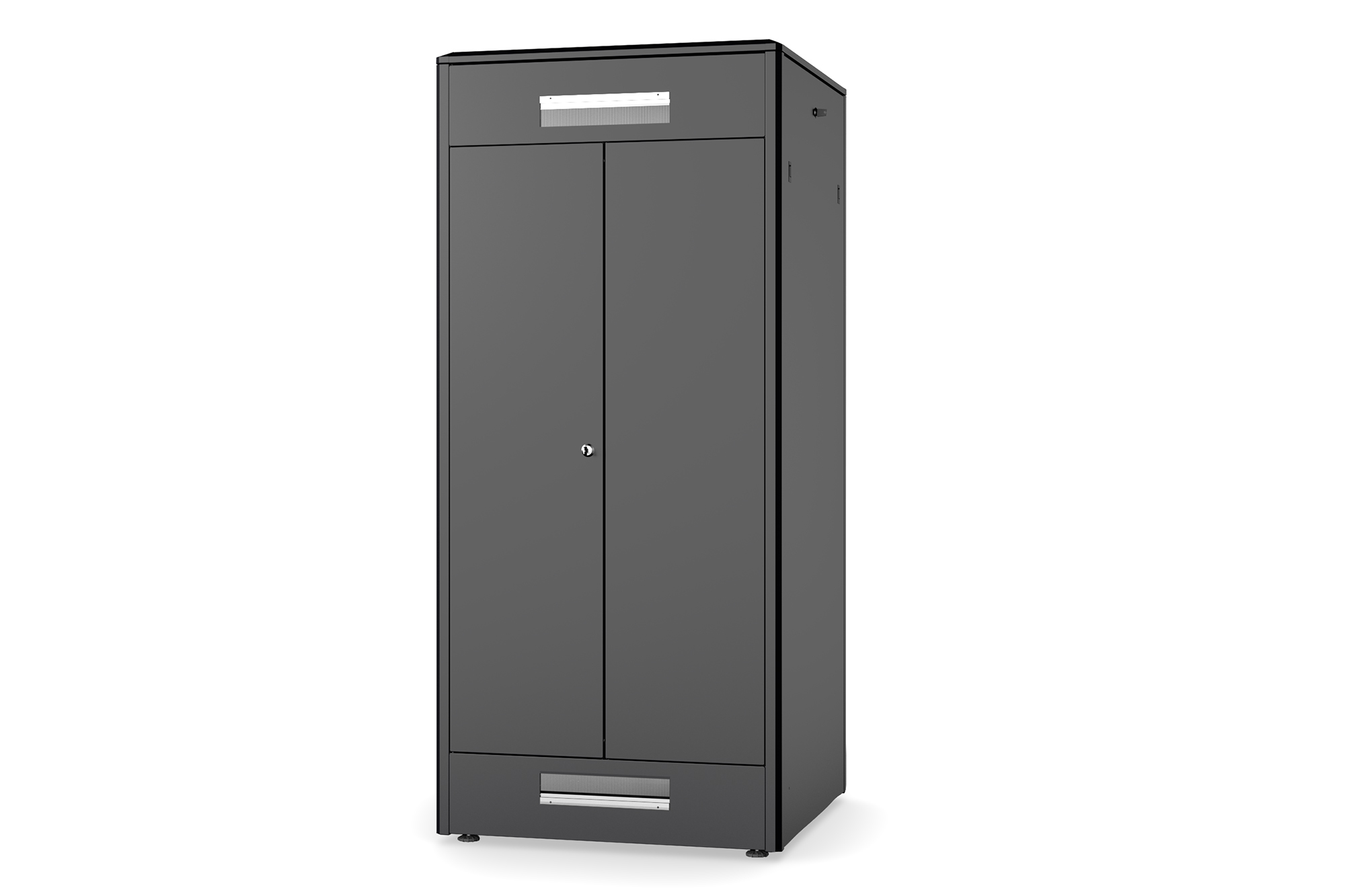 Die Netzwerkschränke der Unique Serie wurden für eine besonders komfortable und flexible Netzwerkverkabelung entwickelt. Mit Bürsten ausgestattete Einlässe im Dach- und Boden (ab 26HE und 800 mm Schrankbreite), ein aufschiebbarer Einlass im Bodenchassis mit Moosgummidichtung sowie rückseitige Bürstenleisten ober- und unterhalb der Rücktür (ab 26HE), ermöglichen einen vielseitigen Einsatz bei verschiedensten Anwendungsszenarien. Vertikale Kabelführungskanäle mit Blende, installiert neben den Profilschienen (ab 800 mm Schrankbreite), runden das Design ab. Ein abgesetzter, abnehmbarer Deckel mit Lüftungsschlitzen sorgt für eine verbesserte Luftzirkulation. Dieser sitzt über einer speziellen Konstruktion für die einfache Aufnahme eines Lüftermoduls. Zwei Paar galvanisierte, mit in beide Richtungen ablesbare Höheneinheiten beschriftete 483 mm (19")-Profilschienen sind im Inneren verbaut. Sie lassen sich in der Tiefe verstellen und sind mit zusätzlichen Tiefenstreben im Schrank verbunden. Jeder Schrank ist eine robuste Stahlkonstruktion aus bis zu 1,5 mm starkem Stahlblech. Die Farbgebung erfolgt in Form von elektrostatischer Pulverbeschichtung in den Standardfarben Grau (RAL 7035) und Schwarz (RAL 9005). Modular abschließ- und abnehmbare Seitenwände sowie Türen verbessern die Zugänglichkeit. Ein Türanschlagswechsel kann vorgenommen werden. Des Weiteren sind die Schränke auf Grund der zerlegbaren Konstruktion bei Bedarf komplett demontierbar.