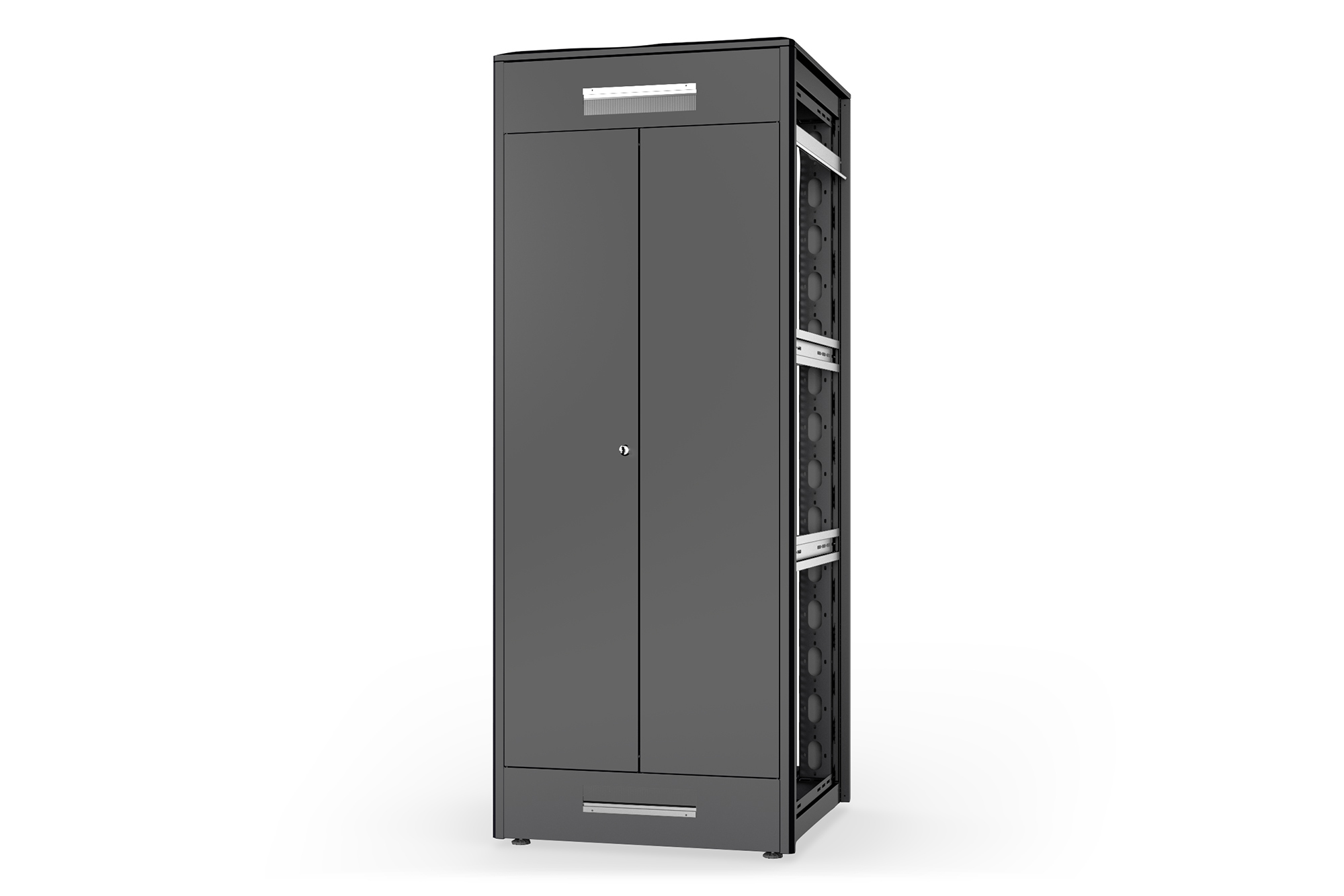 Die Netzwerkschränke der Unique Serie wurden für eine besonders komfortable und flexible Netzwerkverkabelung entwickelt. Mit Bürsten ausgestattete Einlässe im Dach- und Boden (ab 26HE und 800 mm Schrankbreite), ein aufschiebbarer Einlass im Bodenchassis mit Moosgummidichtung sowie rückseitige Bürstenleisten ober- und unterhalb der Rücktür (ab 26HE), ermöglichen einen vielseitigen Einsatz bei verschiedensten Anwendungsszenarien. Vertikale Kabelführungskanäle mit Blende, installiert neben den Profilschienen (ab 800 mm Schrankbreite), runden das Design ab. Ein abgesetzter, abnehmbarer Deckel mit Lüftungsschlitzen sorgt für eine verbesserte Luftzirkulation. Dieser sitzt über einer speziellen Konstruktion für die einfache Aufnahme eines Lüftermoduls. Zwei Paar galvanisierte, mit in beide Richtungen ablesbare Höheneinheiten beschriftete 483 mm (19")-Profilschienen sind im Inneren verbaut. Sie lassen sich in der Tiefe verstellen und sind mit zusätzlichen Tiefenstreben im Schrank verbunden. Jeder Schrank ist eine robuste Stahlkonstruktion aus bis zu 1,5 mm starkem Stahlblech. Die Farbgebung erfolgt in Form von elektrostatischer Pulverbeschichtung in den Standardfarben Grau (RAL 7035) und Schwarz (RAL 9005). Modular abschließ- und abnehmbare Seitenwände sowie Türen verbessern die Zugänglichkeit. Ein Türanschlagswechsel kann vorgenommen werden. Des Weiteren sind die Schränke auf Grund der zerlegbaren Konstruktion bei Bedarf komplett demontierbar.