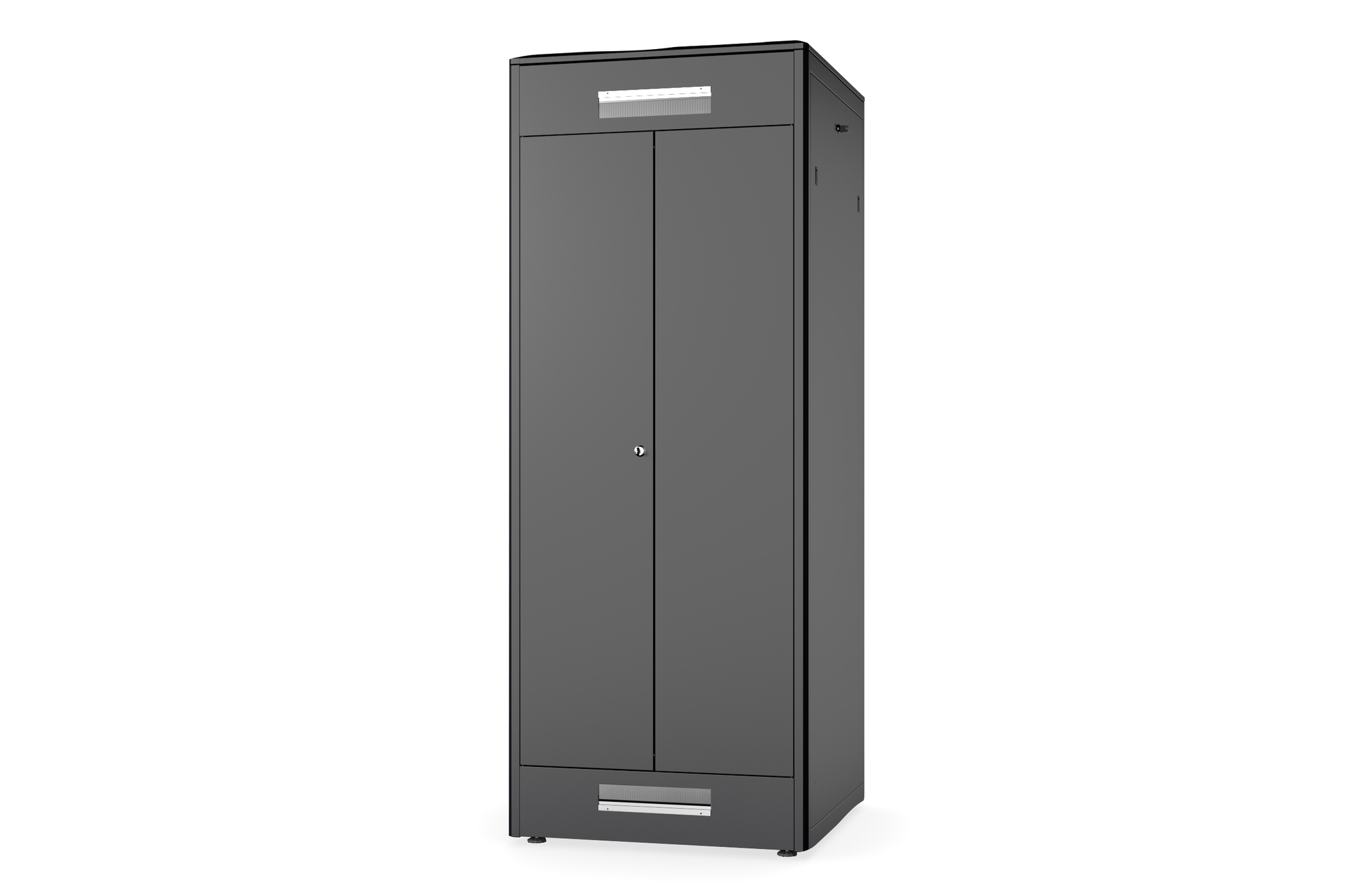 Die Netzwerkschränke der Unique Serie wurden für eine besonders komfortable und flexible Netzwerkverkabelung entwickelt. Mit Bürsten ausgestattete Einlässe im Dach- und Boden (ab 26HE und 800 mm Schrankbreite), ein aufschiebbarer Einlass im Bodenchassis mit Moosgummidichtung sowie rückseitige Bürstenleisten ober- und unterhalb der Rücktür (ab 26HE), ermöglichen einen vielseitigen Einsatz bei verschiedensten Anwendungsszenarien. Vertikale Kabelführungskanäle mit Blende, installiert neben den Profilschienen (ab 800 mm Schrankbreite), runden das Design ab. Ein abgesetzter, abnehmbarer Deckel mit Lüftungsschlitzen sorgt für eine verbesserte Luftzirkulation. Dieser sitzt über einer speziellen Konstruktion für die einfache Aufnahme eines Lüftermoduls. Zwei Paar galvanisierte, mit in beide Richtungen ablesbare Höheneinheiten beschriftete 483 mm (19")-Profilschienen sind im Inneren verbaut. Sie lassen sich in der Tiefe verstellen und sind mit zusätzlichen Tiefenstreben im Schrank verbunden. Jeder Schrank ist eine robuste Stahlkonstruktion aus bis zu 1,5 mm starkem Stahlblech. Die Farbgebung erfolgt in Form von elektrostatischer Pulverbeschichtung in den Standardfarben Grau (RAL 7035) und Schwarz (RAL 9005). Modular abschließ- und abnehmbare Seitenwände sowie Türen verbessern die Zugänglichkeit. Ein Türanschlagswechsel kann vorgenommen werden. Des Weiteren sind die Schränke auf Grund der zerlegbaren Konstruktion bei Bedarf komplett demontierbar.