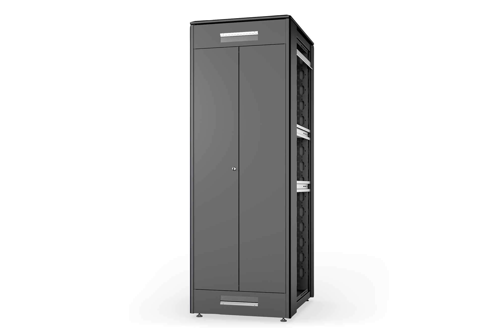 Die Netzwerkschränke der Unique Serie wurden für eine besonders komfortable und flexible Netzwerkverkabelung entwickelt. Mit Bürsten ausgestattete Einlässe im Dach- und Boden (ab 26HE und 800 mm Schrankbreite), ein aufschiebbarer Einlass im Bodenchassis mit Moosgummidichtung sowie rückseitige Bürstenleisten ober- und unterhalb der Rücktür (ab 26HE), ermöglichen einen vielseitigen Einsatz bei verschiedensten Anwendungsszenarien. Vertikale Kabelführungskanäle mit Blende, installiert neben den Profilschienen (ab 800 mm Schrankbreite), runden das Design ab. Ein abgesetzter, abnehmbarer Deckel mit Lüftungsschlitzen sorgt für eine verbesserte Luftzirkulation. Dieser sitzt über einer speziellen Konstruktion für die einfache Aufnahme eines Lüftermoduls. Zwei Paar galvanisierte, mit in beide Richtungen ablesbare Höheneinheiten beschriftete 483 mm (19")-Profilschienen sind im Inneren verbaut. Sie lassen sich in der Tiefe verstellen und sind mit zusätzlichen Tiefenstreben im Schrank verbunden. Jeder Schrank ist eine robuste Stahlkonstruktion aus bis zu 1,5 mm starkem Stahlblech. Die Farbgebung erfolgt in Form von elektrostatischer Pulverbeschichtung in den Standardfarben Grau (RAL 7035) und Schwarz (RAL 9005). Modular abschließ- und abnehmbare Seitenwände sowie Türen verbessern die Zugänglichkeit. Ein Türanschlagswechsel kann vorgenommen werden. Des Weiteren sind die Schränke auf Grund der zerlegbaren Konstruktion bei Bedarf komplett demontierbar.