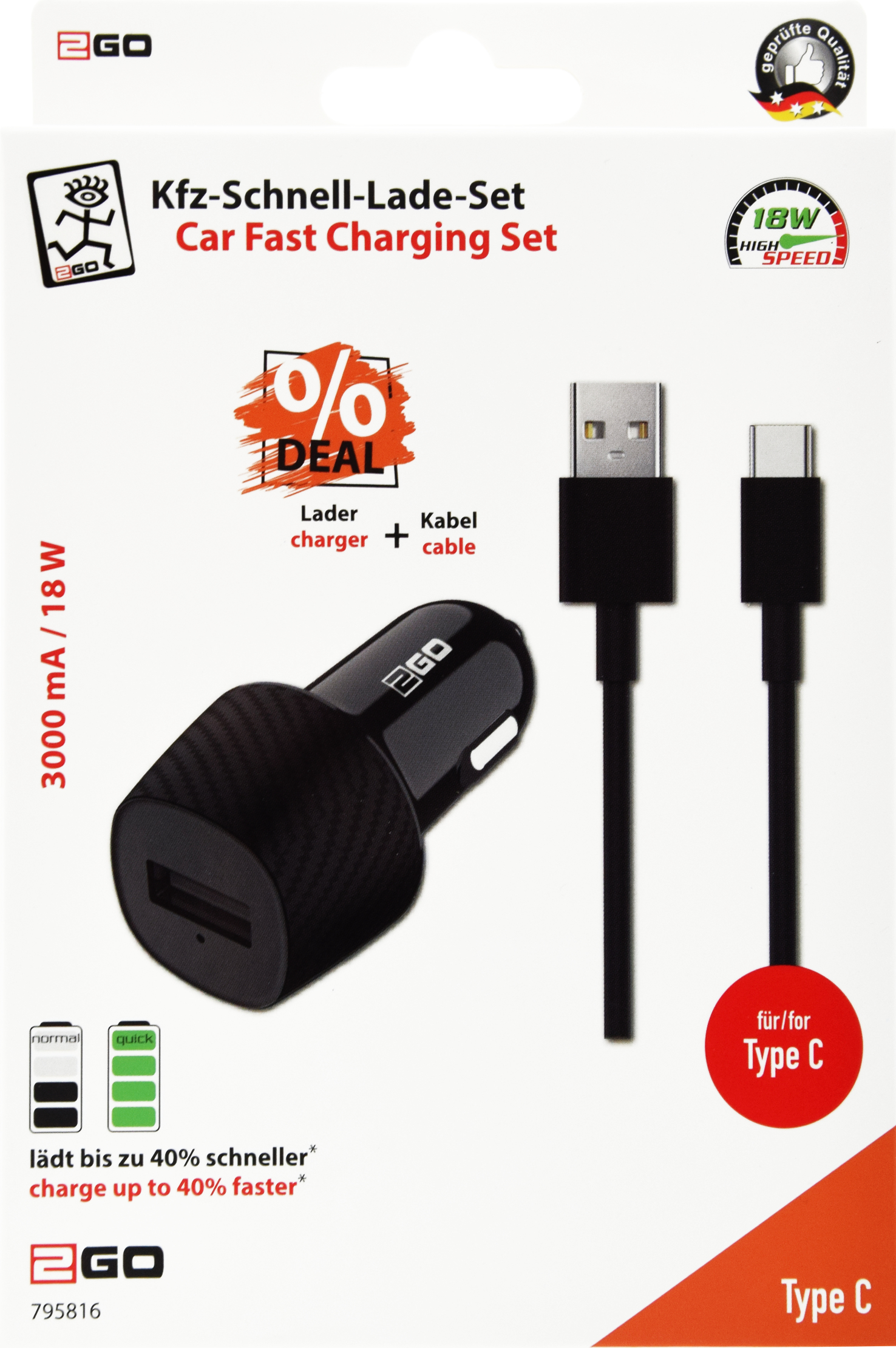 2GO USB KFZ-Ladegerät (2-teil) USB-C 3.1. inkl. Kabel sw