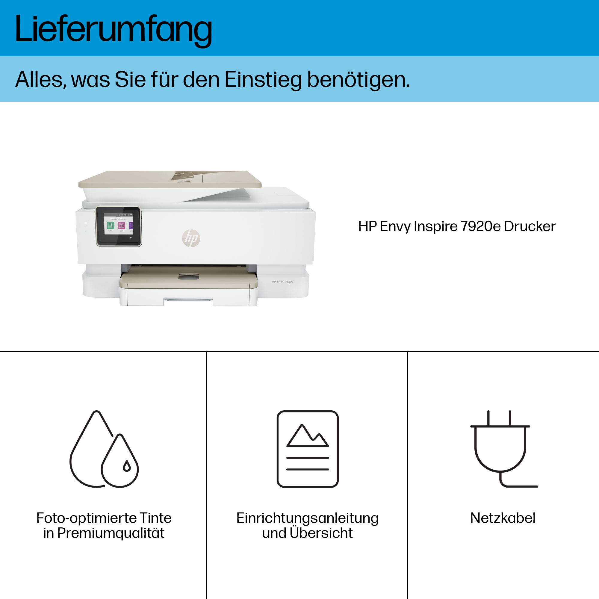 Packungsinhalt: HP ENVY Inspire 7920e All-in-One-Drucker; HP 303 Schwarz Setup Druckerpatrone (mit HP Instant Ink kompatibel); HP 303 Cyan/Magenta/Gelb Setup Druckerpatrone (mit HP Instant Ink kompatibel); Flyer mit Hinweisen zur Tinte; Flyer mit regulatorischen Angaben; Installationsanleitung; Referenzhandbuch; HP Advanced Hochglanz- und Matt-Fotopapier enthalten; Netzkabel [Informationen zu Tintenvolumen und Seitenreichweite unter http://hp.com/go/learnaboutsupplies]
