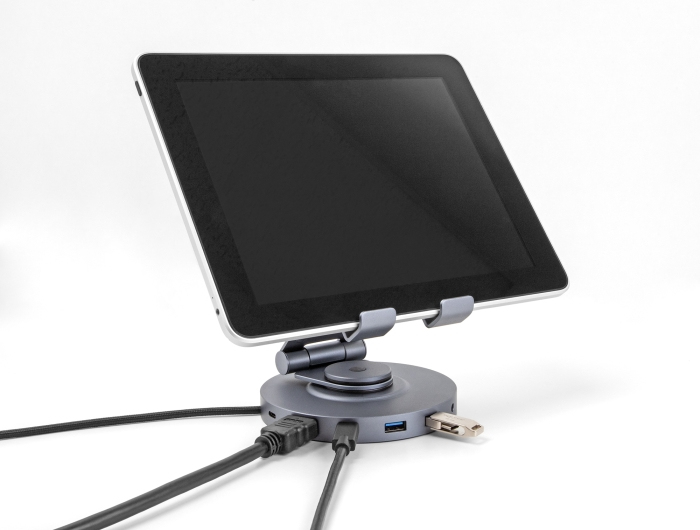 Diese Dockingstation für Tablets und Notebooks mit Halterung von Delock überzeugt nicht nur durch ihr Design, sondern auch durch Stabilität und Funktion, zum Beispiel durch die 360° drehbare Halterung. Die auf der Unterseite und in der Halterung befestigten Gummipads sorgen dafür, dass weder das Gerät noch die Halterung rutscht.