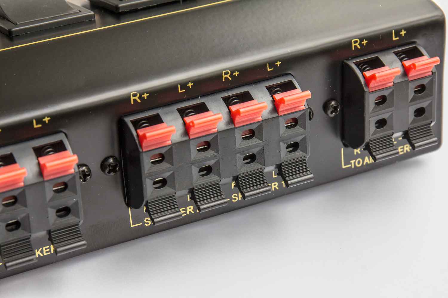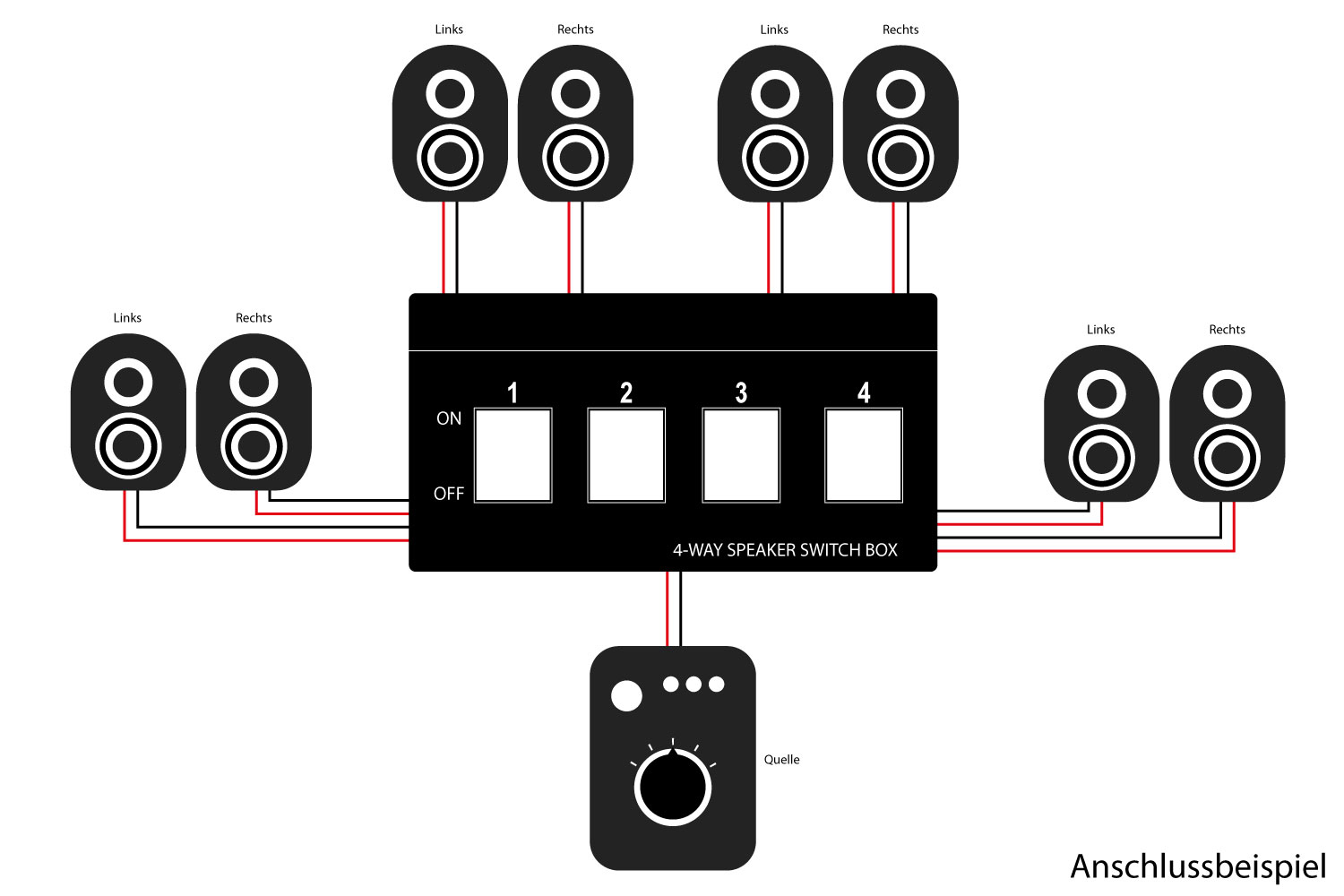 An diese Lautsprecher-Umschaltbox können bis zu vier Lautsprecherpaare angeschlossen und geschaltet werden. Es kann, je nach Wunsch zum Beispiel, nur ein Lautsprecherpaar (links/rechts) geschaltet werden, oder drei Paare, oder alle zusammen.Das Gehäuse der Umschaltbox besteht aus stabilem Metall, die Schalter aus Kunststoff. Die farbig markierten Anschlussklemmen ermöglichen einen Anschluss der Lautsprecher ohne spezielle Anschlusskabel. Es werden lediglich handelsübliche Lautsprecherkabel benötigt.