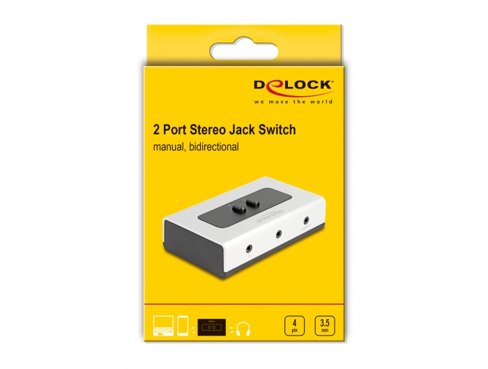Dieser Delock Klinke 3,5 mm Umschalter ist ein manueller bidirektionaler Umschalter zur Verbindung verschiedener Audiogeräte, der zwei verschiedene Einsatzmöglichkeiten bietet.1. Es können bis zu zwei Geräte mit Klinke Anschluss, wie z. B. Kopfhörer, an einer Audioquelle angeschlossen werden. Per Knopfdruck lässt sich das Gerät auswählen, welches das Audiosignal wiedergeben soll. (Eine gleichzeitige Ausgabe auf mehreren Geräten ist nicht möglich)