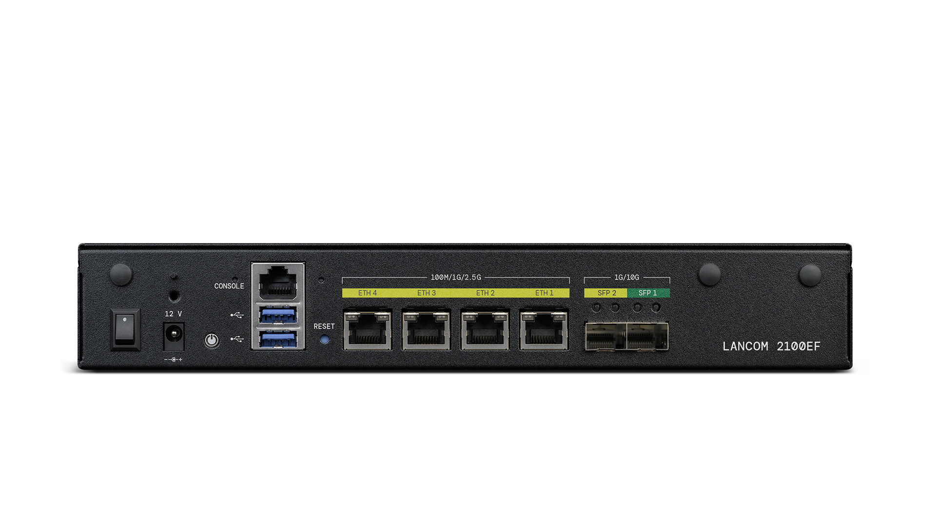 Profitieren Sie von Multi-Gigabit Highspeed-Internet Ihres Glasfaser­netzes: Der LANCOM 2100EF ist über einen der beiden 10 Gigabit SFP+-Ports sowie einem optionalen Modul, z. B. LANCOM SFP-XGSPON-1, perfekt für die XGS-PON-Glasfaser­technik geeignet. Mit dem zweiten SFP+-Port kann das Multi-Gigabit SD-WAN Gateway parallel Daten mit voller Geschwin­digkeit in das LAN verteilen, während über 2,5 Gigabit Ethernet beliebige externe Modems oder ein Multi-Gigabit Access Switch flexibel angebunden werden können. Für einen sicheren Netz­werk­zugriff im Büro, zu Hause oder unterwegs werden mit ausgezeich­netem LANCOM IPSec-VPN und SD-WAN 25 (optional 100) Standorte und mobile Mit­arbeitende sicher miteinander vernetzt. Mit der Einbindung des LANCOM 2100EF in die LANCOM Management Cloud (LMC) zentralisieren und automatisieren Sie dessen Management.