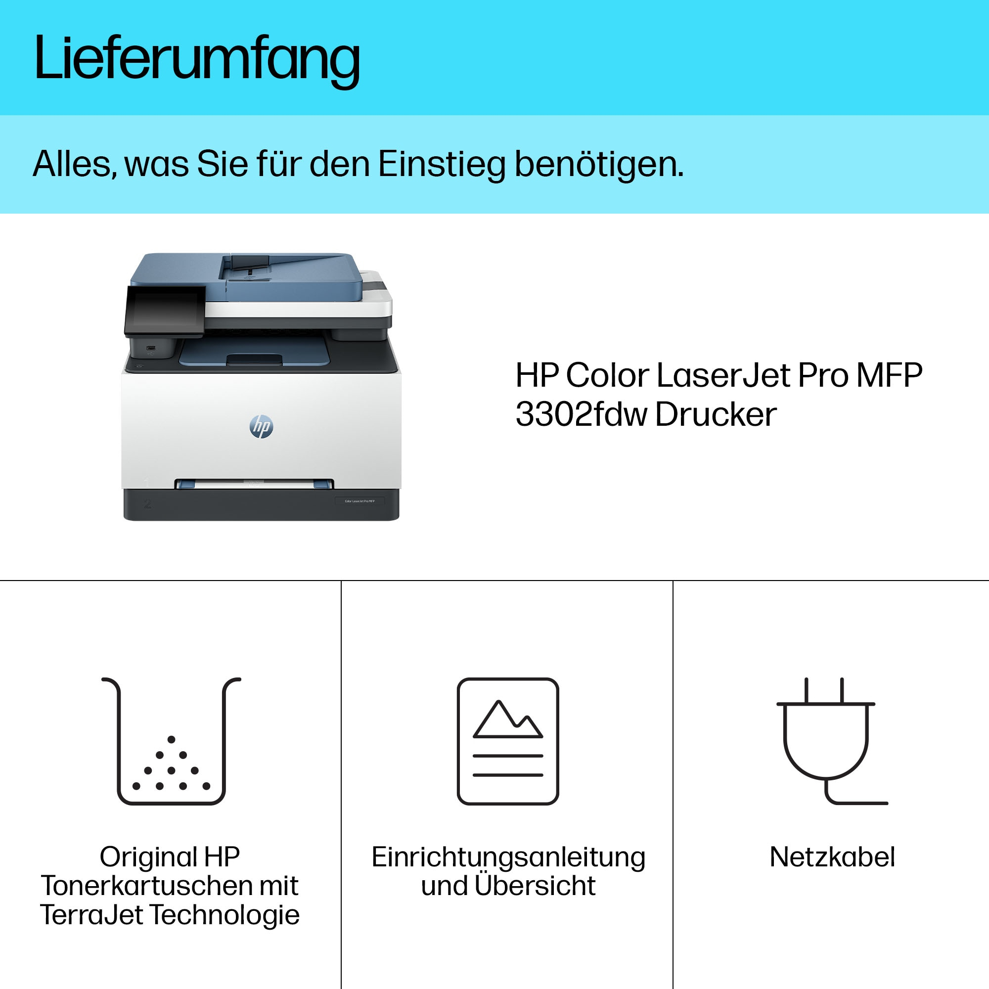 | Packungsinhalt: | HP Color LaserJet Pro MFP 3302fdw; Power cord; Toner cartridge; User Guide; Flyers |