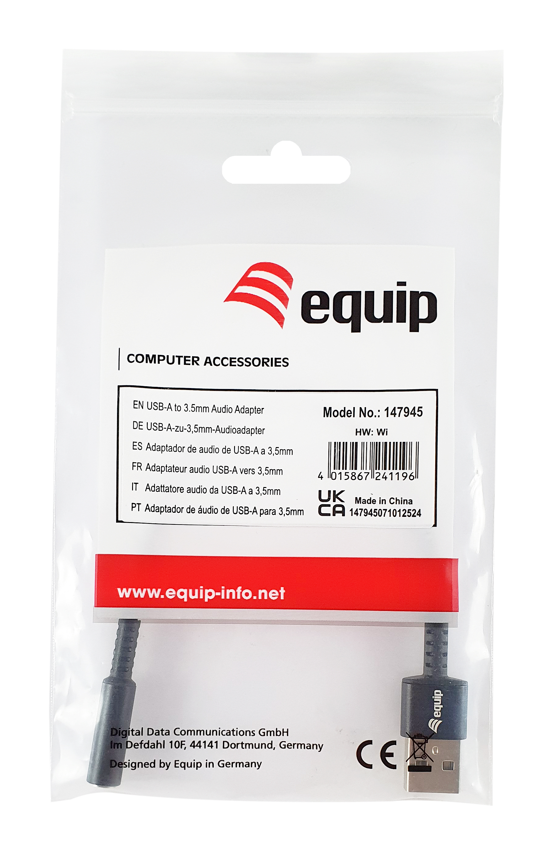 Mit dem Equip 147945 USB-A-auf-3,5-mm-Audioadapter können Sie Kopfhörer, Lautsprecher oder Mikrofone ganz einfach an Geräte ohne dedizierte Audiobuchse anschließen. Ideal für Laptops, Desktop-PCs und andere USB-fähige Geräte bietet dieser Adapter eine zuverlässige Lösung für hochwertige Audioübertragung.