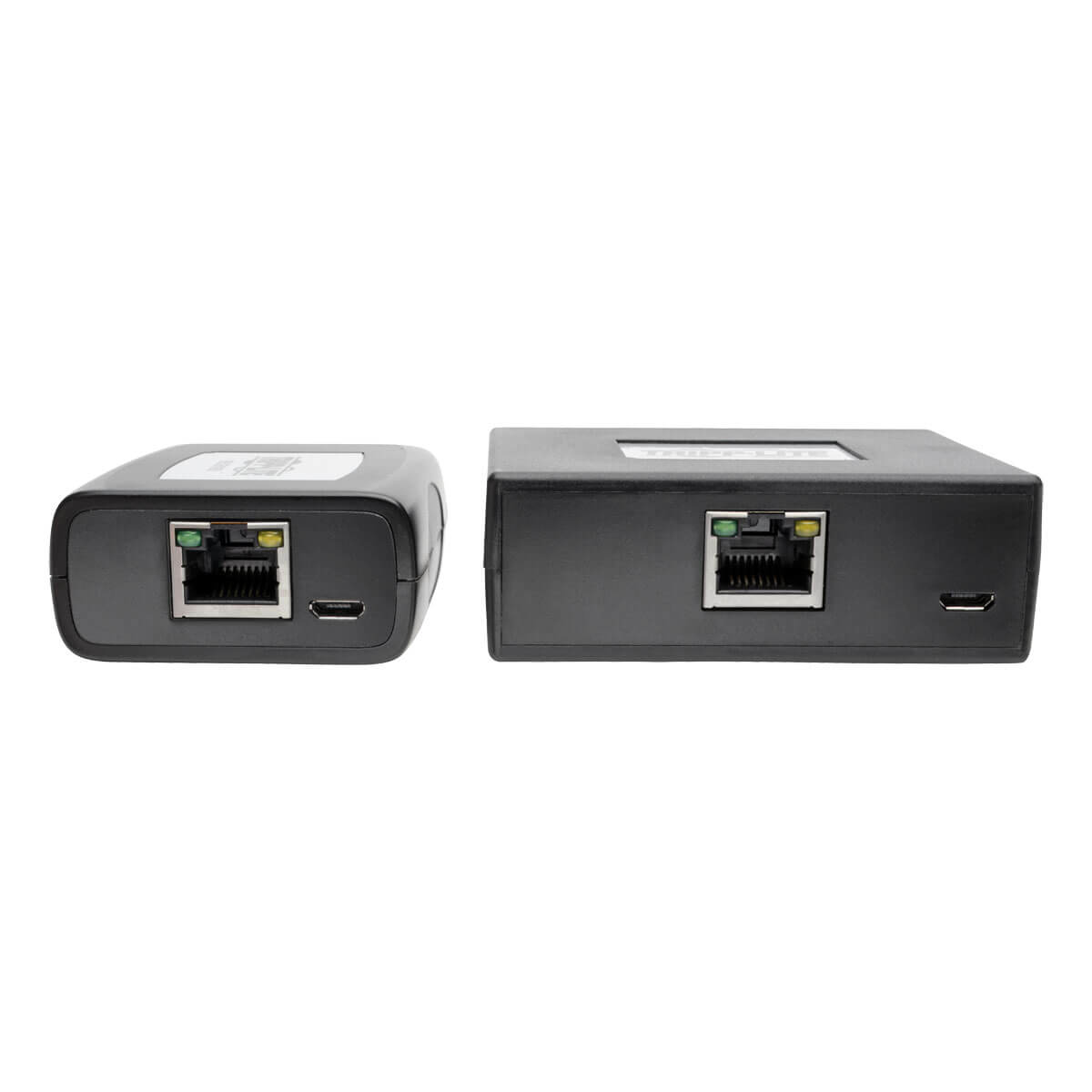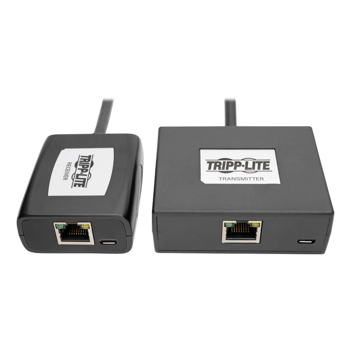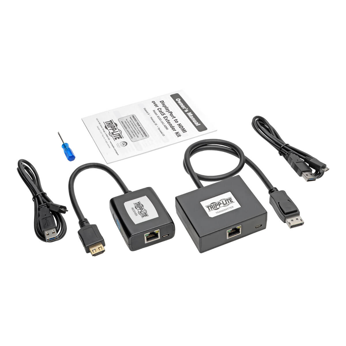 Ein Cat5e/6-Kabel verbindet Sender und Empfänger (für optimale Ergebnisse verwenden Sie ein Cat5e/6-Volldrahtkabel mit 24 AWG, z. B. der N202-Serie von Tripp Lite). Ein eingebautes DisplayPort-Kabel verbindet den Sender mit der Quelle, während ein eingebautes HDMI-Kabel den Empfänger mit dem Display verbindet. Das eingebaute HDMI-Kabel verfügt über einen Verriegelungsanschluss, der ein versehentliches Trennen verhindert. Im Lieferumfang enthaltene USB-Micro-B-Kabel verbinden den Sender mit einem USB-Anschluss am DisplayPort-Computer oder einem USB-Ladegerät (z. B. U280-002-W12 von Tripp Lite) und den Empfänger mit einem USB-Anschluss am HDMI-Bildschirm oder einem USB-Ladegerät. Keine externe Stromversorgung erforderlich