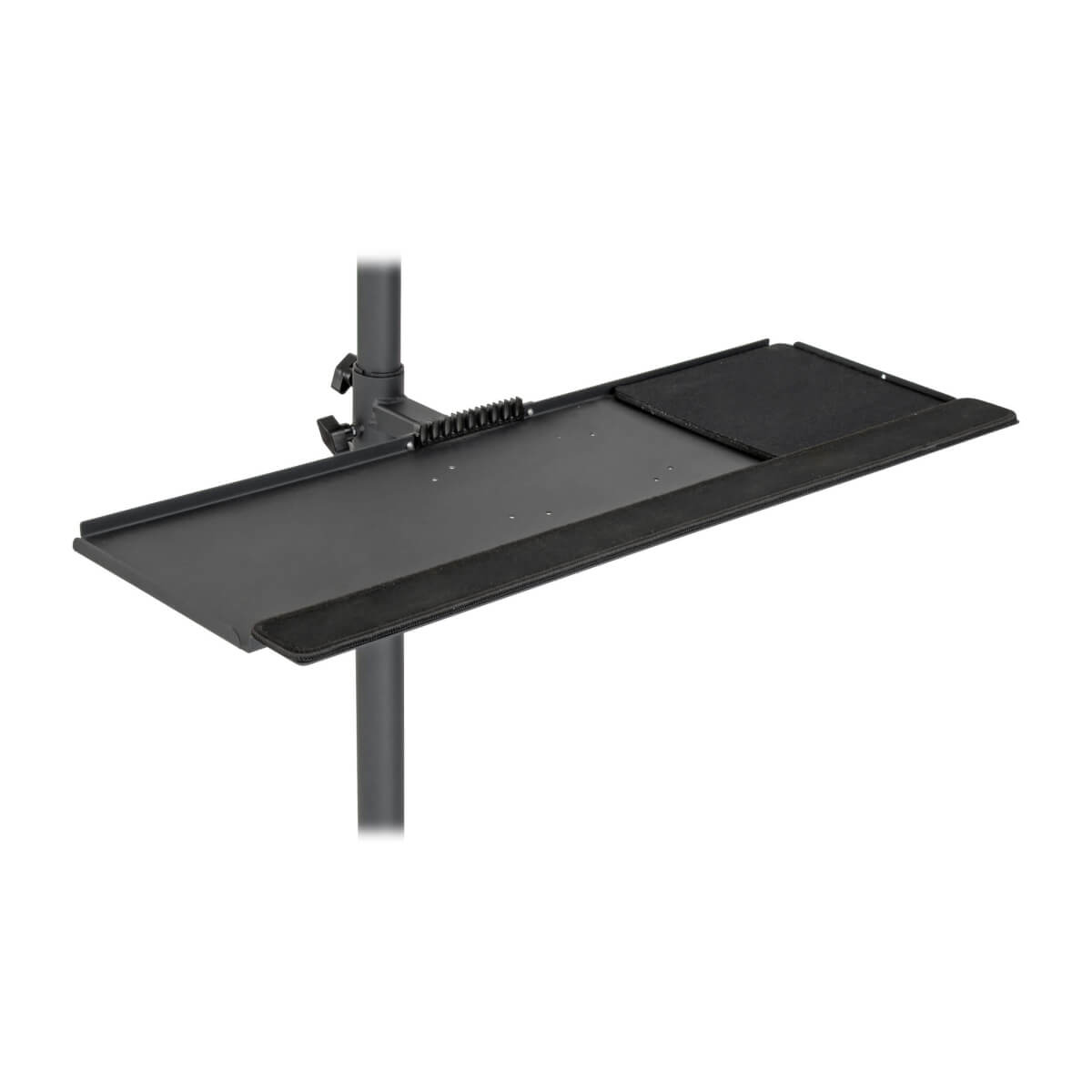 Die Tastaturablage lässt sich von 0,88 bis 1,69 m über dem Boden einstellen. Um die Ablage anzuheben oder abzusenken, lösen Sie einfach die Einstellknöpfe, verschieben die Ablage auf die gewünschte Höhe und ziehen die Knöpfe wieder fest. Die Tastaturablage verfügt über eine Handgelenkauflage und bietet ausreichend Platz für das mitgelieferte Mousepad. Sie trägt bis zu 1,9 kg. Die Kabelführung hält Tastatur- und Mauskabel getrennt und verhindert Kabelsalat. Die Stützstange verfügt über zwei Führungen, um alle Kabel zur Unterseite der Arbeitsstation zu führen.