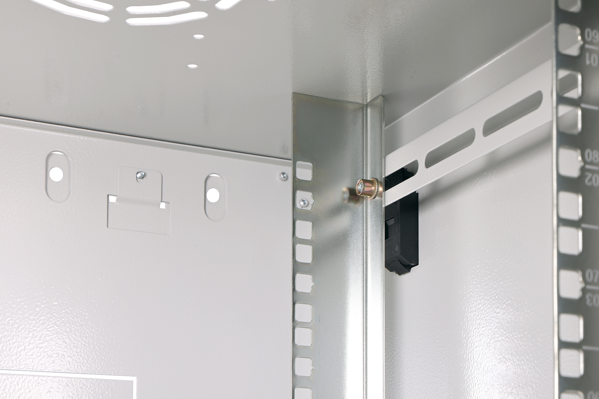 - 483 mm (19“)-Profilschienen an der Vorder- und Rückseite innerhalb des Schrankes, galvanisiert