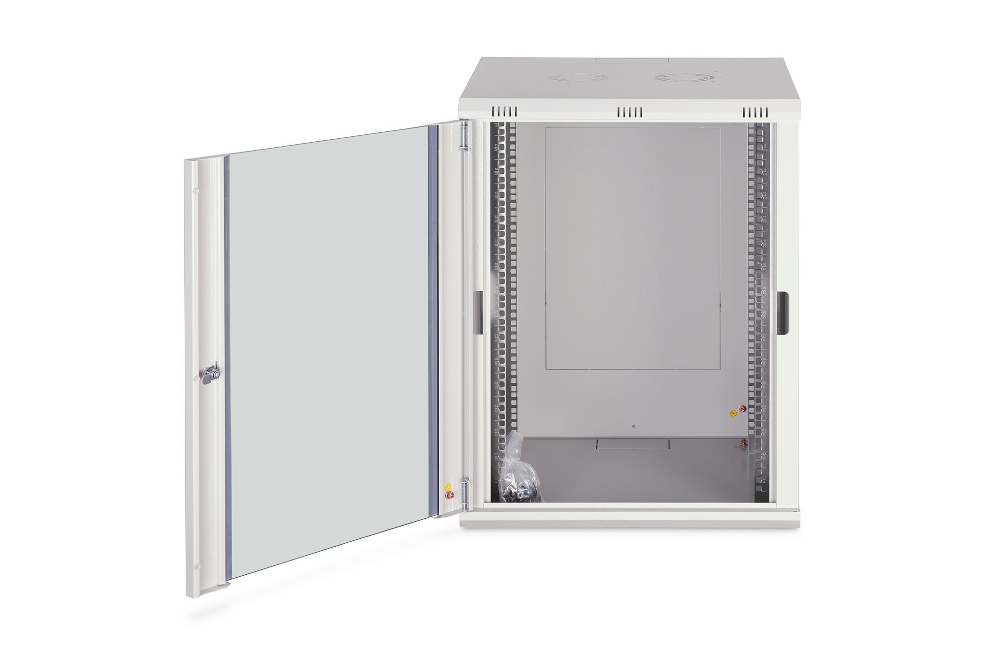 Die Netzwerkschränke zur Wandmontage der Dynamic-N Serie wurden für einen einfachen und besonders kostenoptimierten Netzwerkausbau entwickelt. Dach, Boden und Rückwand eines jeden Schrankes sind mit einem vorgestanzten Kabeleinlass ausgestattet. Für die Aufnahme eines Lüftermoduls wird das Dachchassis ebenfalls mit einem ausgestanzten Bereich versehen. Zwei Paar galvanisierte, mit in beide Richtungen ablesbare Höheneinheiten beschriftete 483 mm (19")-Profilschienen sind im Inneren verbaut. Diese lassen sich in der Tiefe verstellen. Jeder Schrank ist eine robuste Stahlkonstruktion aus bis zu 1,2 mm starkem Stahlblech. Die Farbgebung erfolgt in Form von elektrostatischer Pulverbeschichtung in den Standardfarben Grau (RAL 7035) und Schwarz (RAL 9005). Abnehmbare Seitenwände sowie die abschließ- und abnehmbare Fronttür, verbessern die Zugänglichkeit. Ein Türanschlagswechsel kann vorgenommen werden. Die Wandmontage erfolgt in zwei einfachen Arbeitsschritten: Das mitgelieferte Montageblech wird an die Wand geschraubt und im Anschluss mit dem Gehäuse verbunden. Für eine vereinfachte Logistik wird die Dynamic-N Serie unmontiert im platzsparenden Flatpack geliefert. Die Montage des Wandgehäuses kann schnell und unkompliziert anhand der beiliegenden Montageanleitung durchgeführt werden.