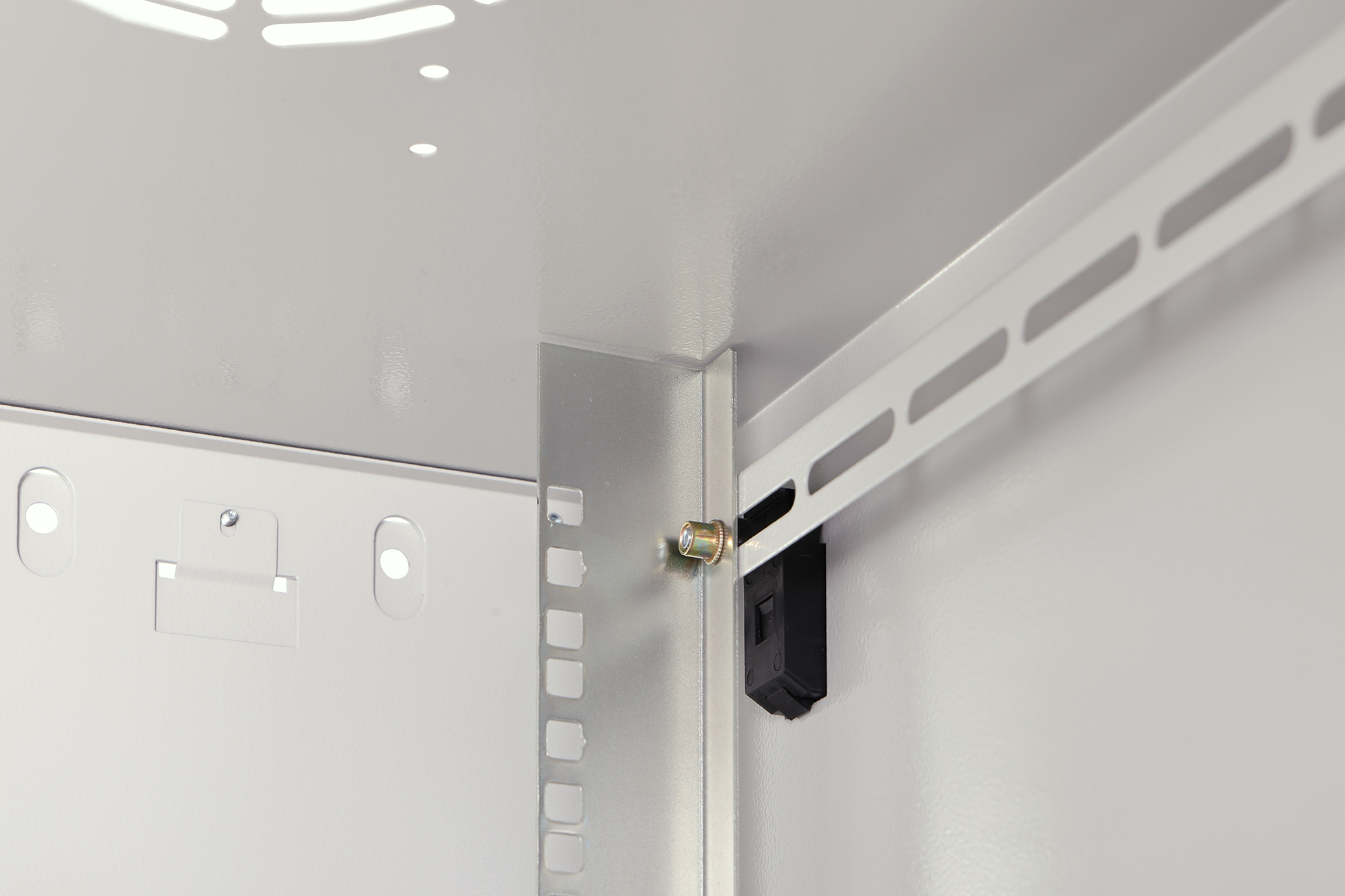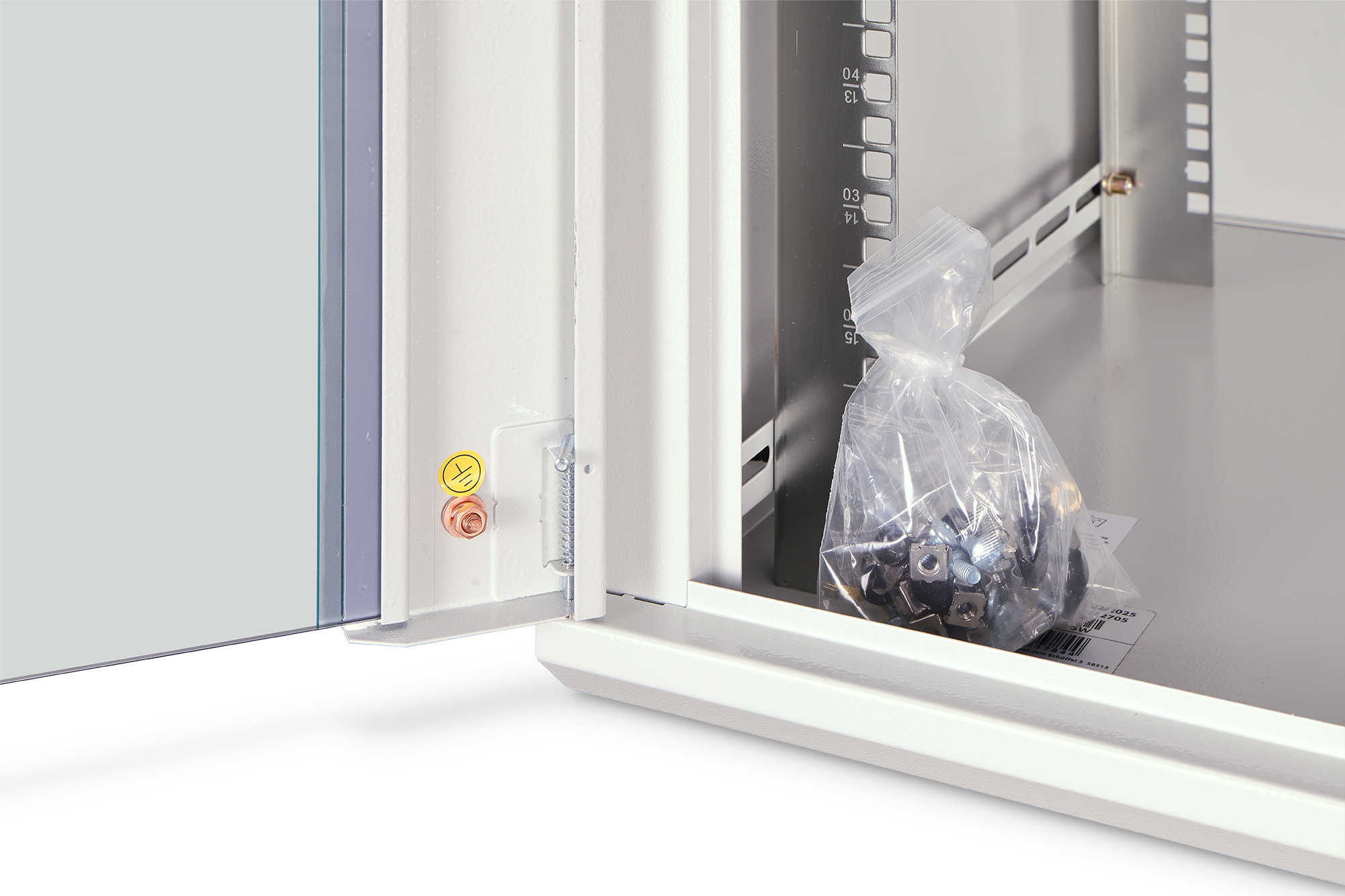 - 483 mm (19“)-Profilschienen an der Vorder- und Rückseite innerhalb des Schrankes, galvanisiert