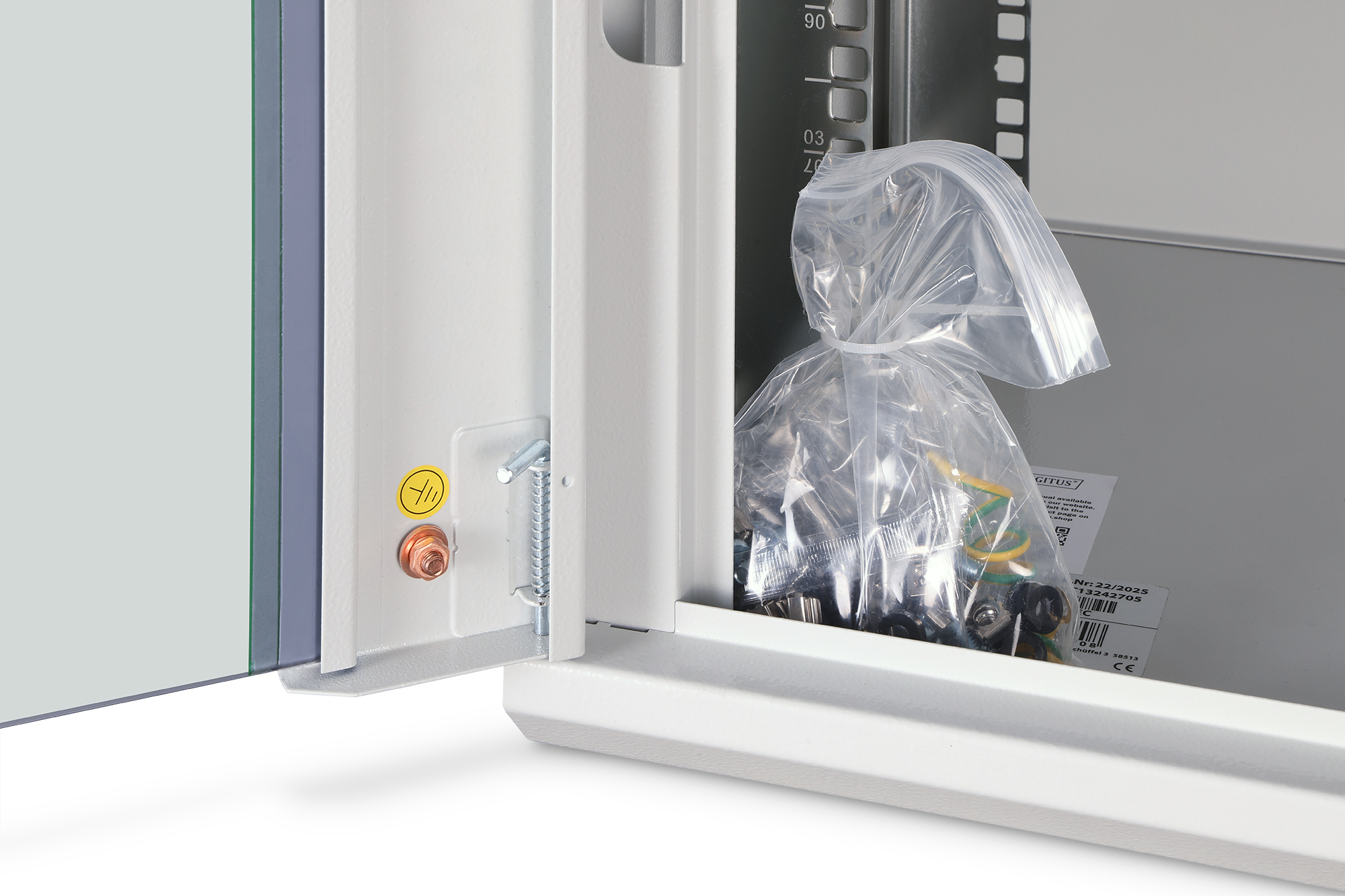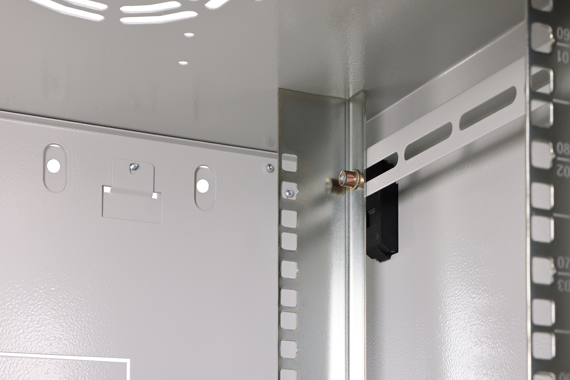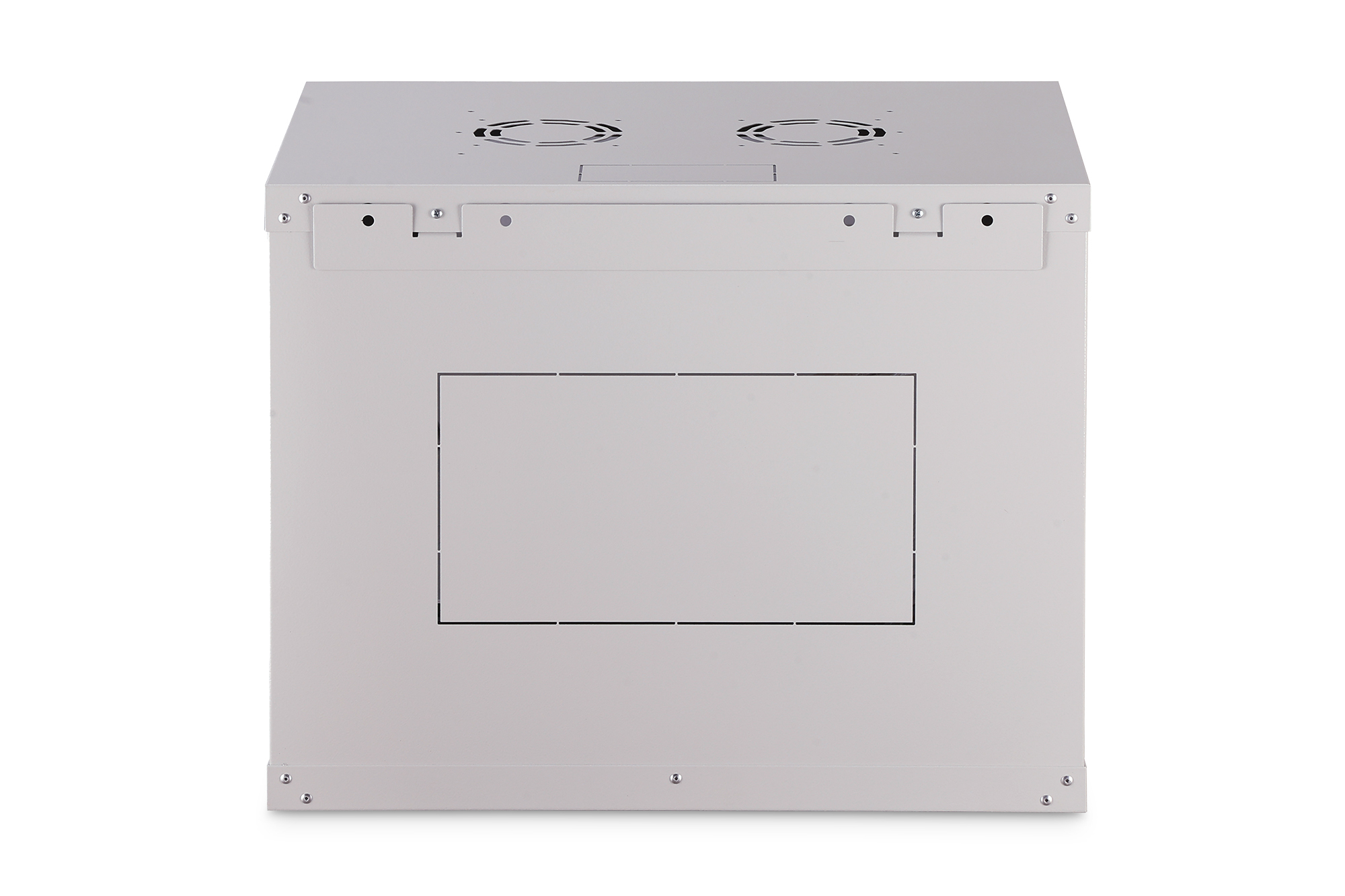 Die Netzwerkschränke zur Wandmontage der Dynamic Serie wurden für einen einfachen und besonders kostenoptimierten Netzwerkausbau entwickelt. Dach, Boden und Rückwand eines jeden Schrankes sind mit einem vorgestanzten Kabeleinlass ausgestattet. Für die Aufnahme eines Lüftermoduls wird das Dachchassis ebenfalls mit einem ausgestanzten Bereich versehen. Zwei Paar galvanisierte, mit in beide Richtungen ablesbare Höheneinheiten beschriftete 483 mm (19")-Profilschienen sind im Inneren verbaut. Diese lassen sich in der Tiefe verstellen. Jeder Schrank ist eine robuste Stahlkonstruktion aus bis zu 1,2 mm starkem Stahlblech. Die Farbgebung erfolgt in Form von elektrostatischer Pulverbeschichtung in den Standardfarben Grau (RAL 7035) und Schwarz (RAL 9005). Abnehmbare Seitenwände sowie die abschließ- und abnehmbare Fronttür, verbessern die Zugänglichkeit. Ein Türanschlagswechsel kann vorgenommen werden. Die Wandmontage erfolgt in zwei einfachen Arbeitsschritten: Das mitgelieferte Montageblech wird an die Wand geschraubt und im Anschluss mit dem Gehäuse verbunden.