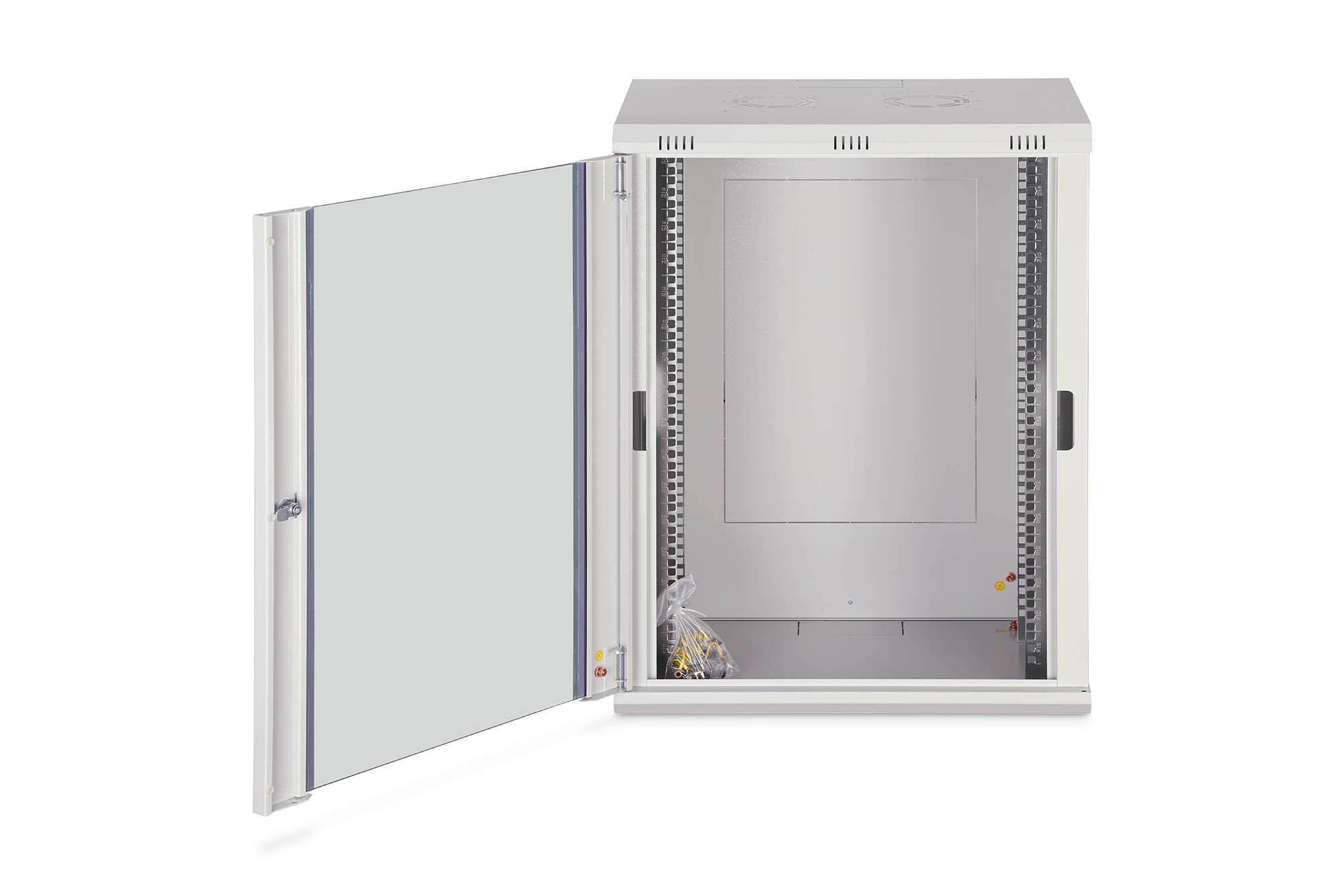 Die Netzwerkschränke zur Wandmontage der Dynamic Serie wurden für einen einfachen und besonders kostenoptimierten Netzwerkausbau entwickelt. Dach, Boden und Rückwand eines jeden Schrankes sind mit einem vorgestanzten Kabeleinlass ausgestattet. Für die Aufnahme eines Lüftermoduls wird das Dachchassis ebenfalls mit einem ausgestanzten Bereich versehen. Zwei Paar galvanisierte, mit in beide Richtungen ablesbare Höheneinheiten beschriftete 483 mm (19")-Profilschienen sind im Inneren verbaut. Diese lassen sich in der Tiefe verstellen. Jeder Schrank ist eine robuste Stahlkonstruktion aus bis zu 1,2 mm starkem Stahlblech. Die Farbgebung erfolgt in Form von elektrostatischer Pulverbeschichtung in den Standardfarben Grau (RAL 7035) und Schwarz (RAL 9005). Abnehmbare Seitenwände sowie die abschließ- und abnehmbare Fronttür, verbessern die Zugänglichkeit. Ein Türanschlagswechsel kann vorgenommen werden. Die Wandmontage erfolgt in zwei einfachen Arbeitsschritten: Das mitgelieferte Montageblech wird an die Wand geschraubt und im Anschluss mit dem Gehäuse verbunden.